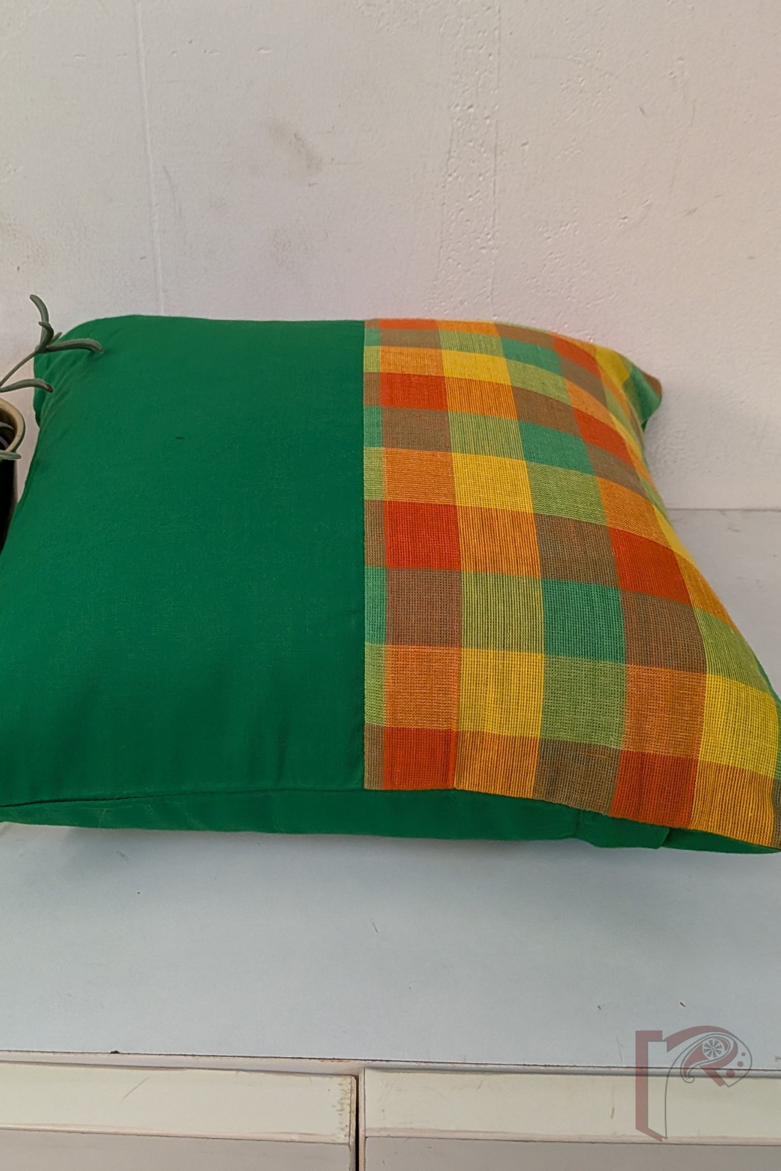 Cozy Cushion: Green Cotton with Orange and Yellow Check Box Pattern Mangalgiri Cushion Cover 12″ x 12″
