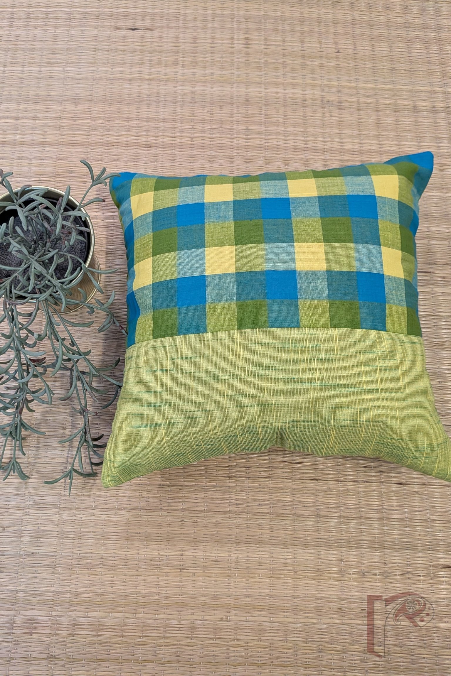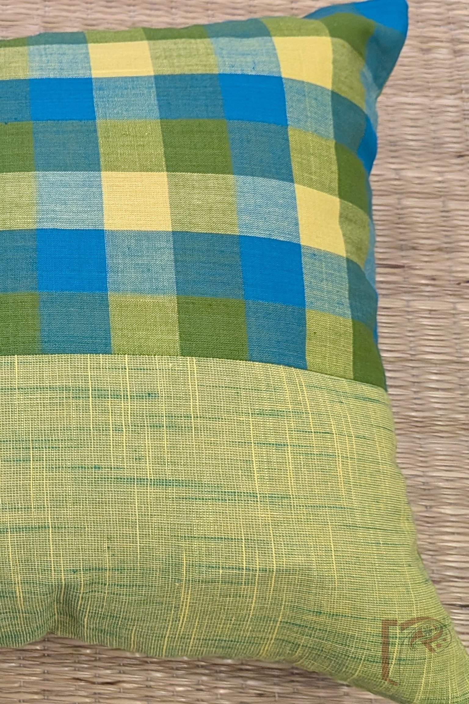 This elegant cushion cover showcases the richness of handloom artistry through a soothing lime green cotton fabric beautifully paired with a check-patterned handloom cotton featuring shades of lime green, copper sulphate blue, and yellow. The sage green cotton back completes the look with a subtle, earthy tone. Perfect for homes that adore handcrafted finesse, this cushion offers texture, depth, and soft comfort. Its harmonious blend of color and weave makes it a timeless accent for any interior — balancing modern minimalism with traditional handwoven charm.