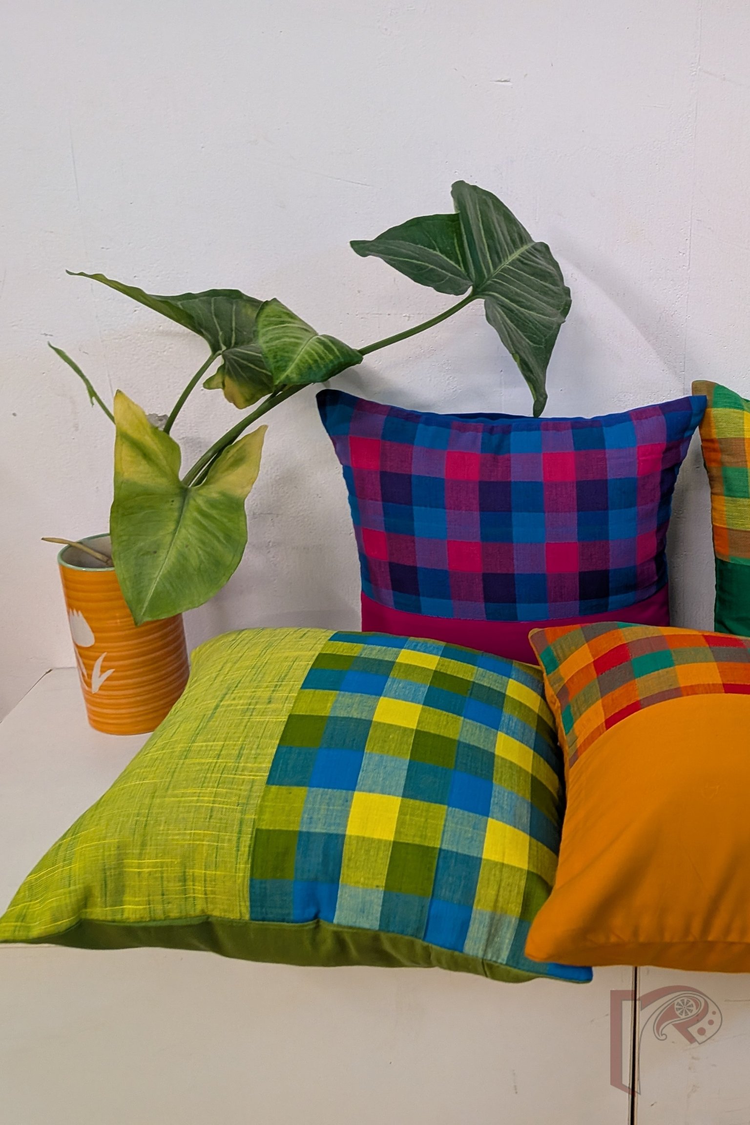 Cozy Cushion: Lime Green and Check Handloom Cotton Cushion Cover 12″ x 12″
