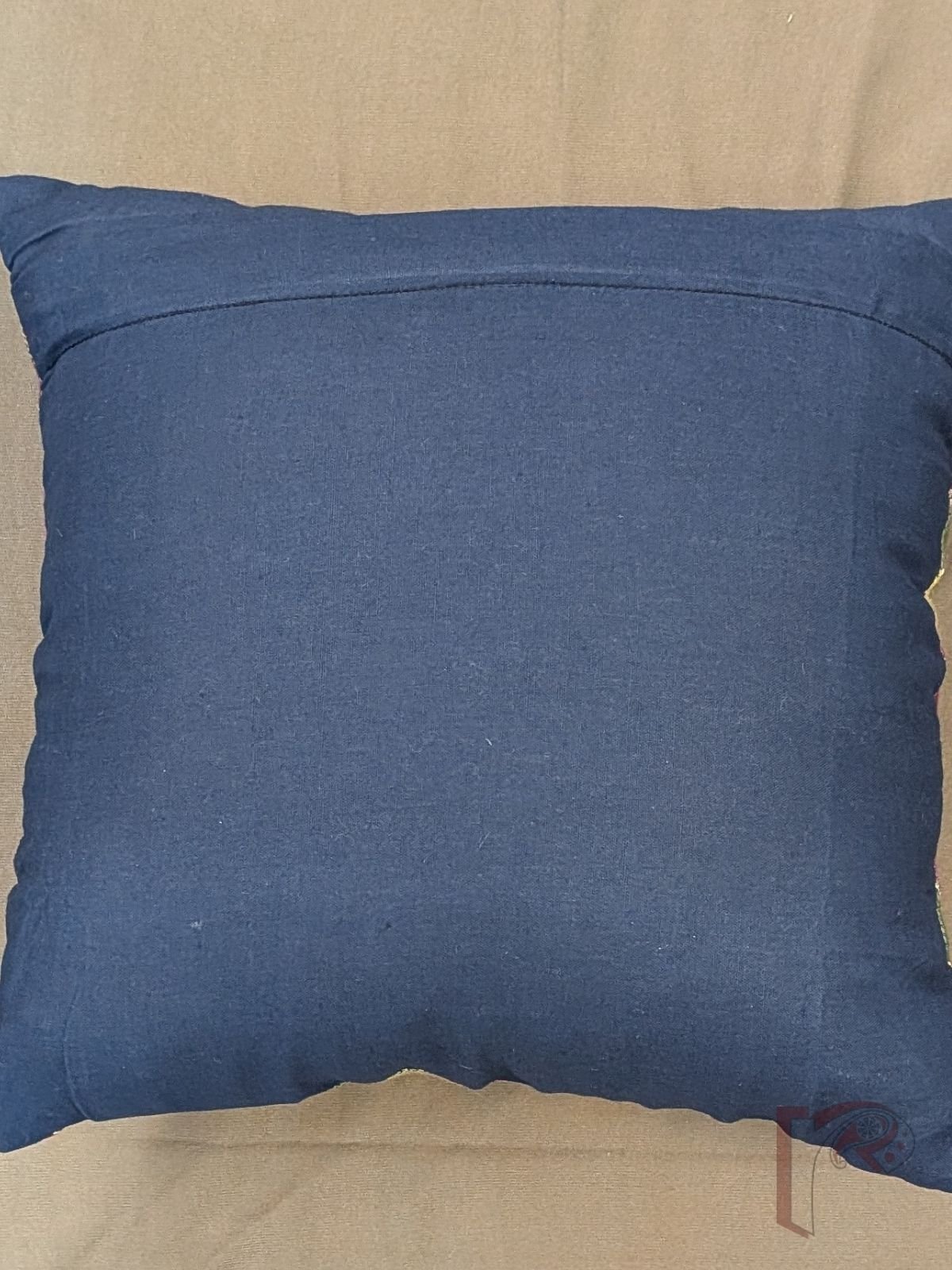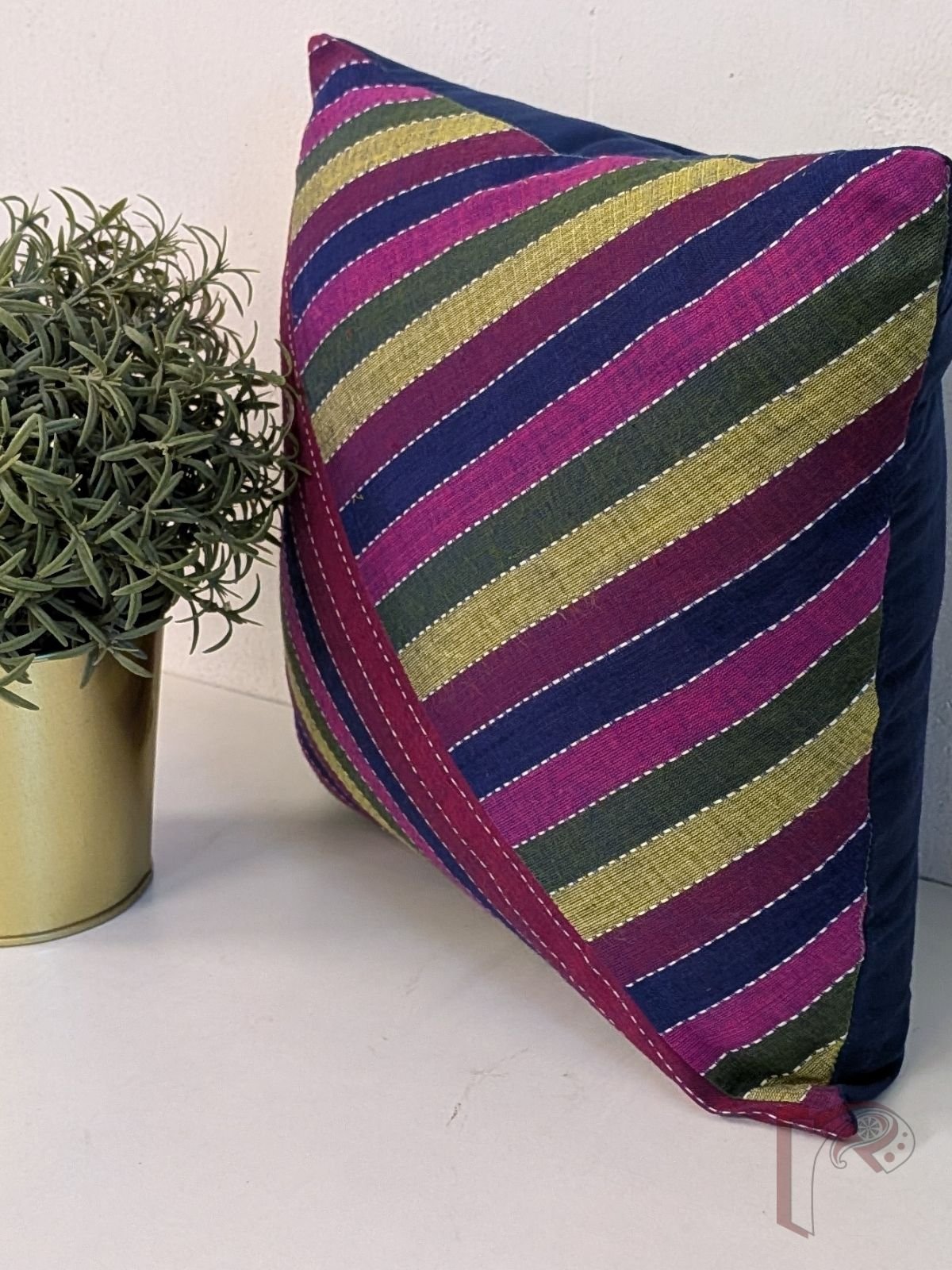 This south cotton handloom cushion cover features vibrant multicolour stripes in maroon, purple, navy blue, green, and lime green, arranged in a striking two-triangle pattern on the front. The geometric layout creates a dynamic and contemporary visual, while the handloom texture adds warmth and character. The plain navy blue cotton back provides a neat and balanced finish to the design. Smart, playful, and handcrafted, this cushion cover brings a lively splash of colour and modern styling to any sofa, chair, or cozy corner.