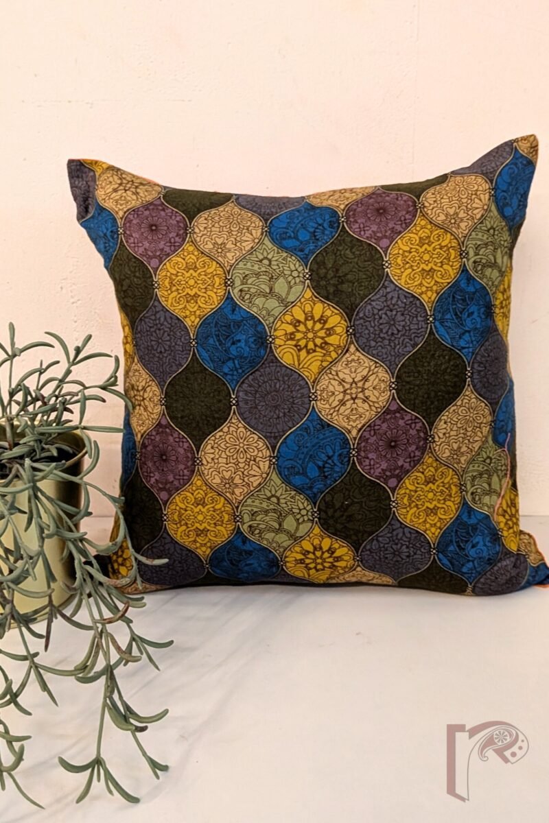A beautiful interplay of tradition and geometry, this cushion cover features a continuous ogee pattern printed on soft cotton in soothing tones of mustard yellow, green, and blue. The rhythmic design adds both texture and visual depth, while the plain bright orange cotton back enhances its lively appeal. Crafted from premium cotton fabric, this cushion offers both comfort and durability, making it an ideal choice for contemporary and ethnic décor settings alike. Its design exudes vibrancy, craftsmanship, and timeless style.