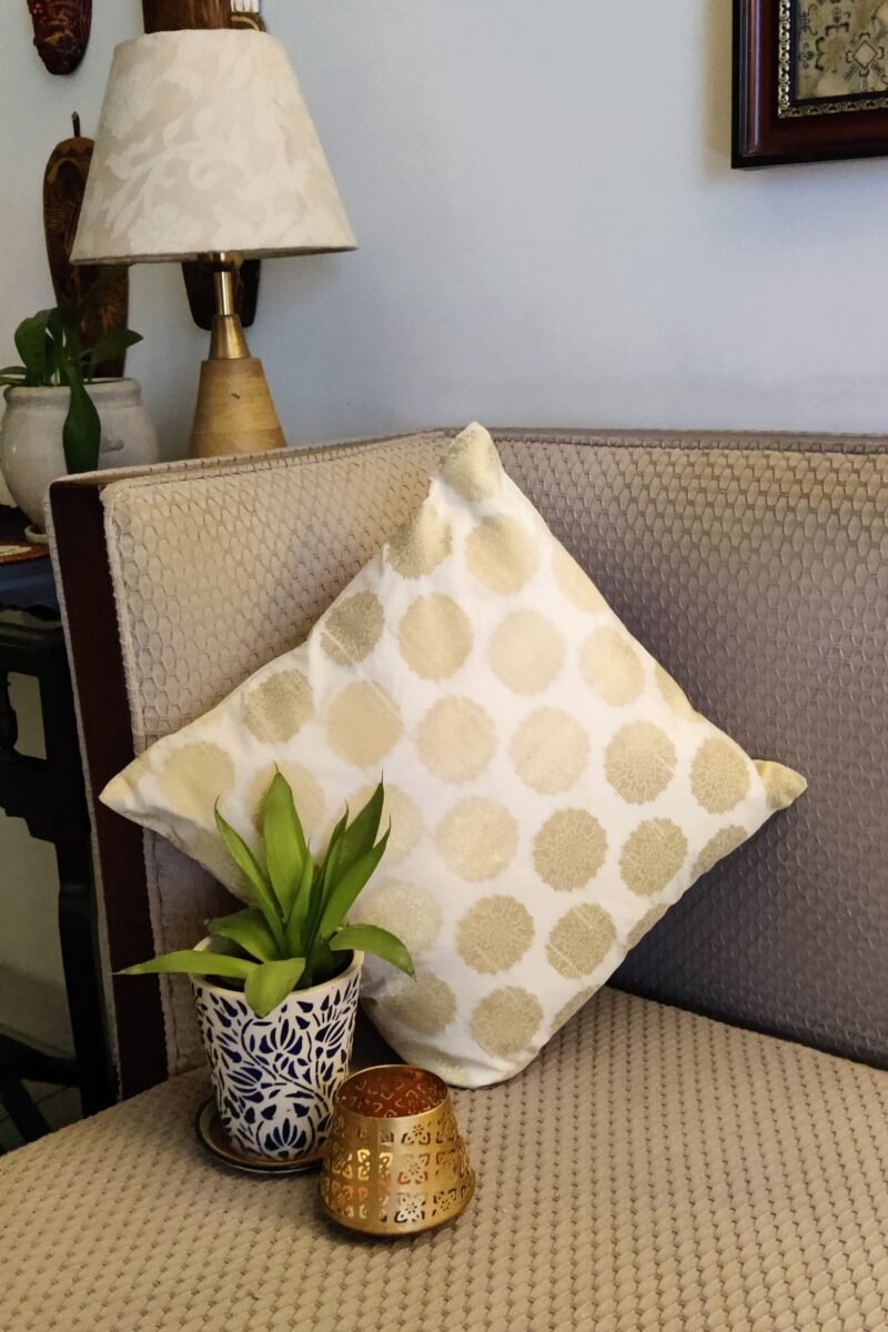 Cozy Cushion: Off White Banarasi Silk Gold Polka Dot Cushion Cover 16″ X 16″
