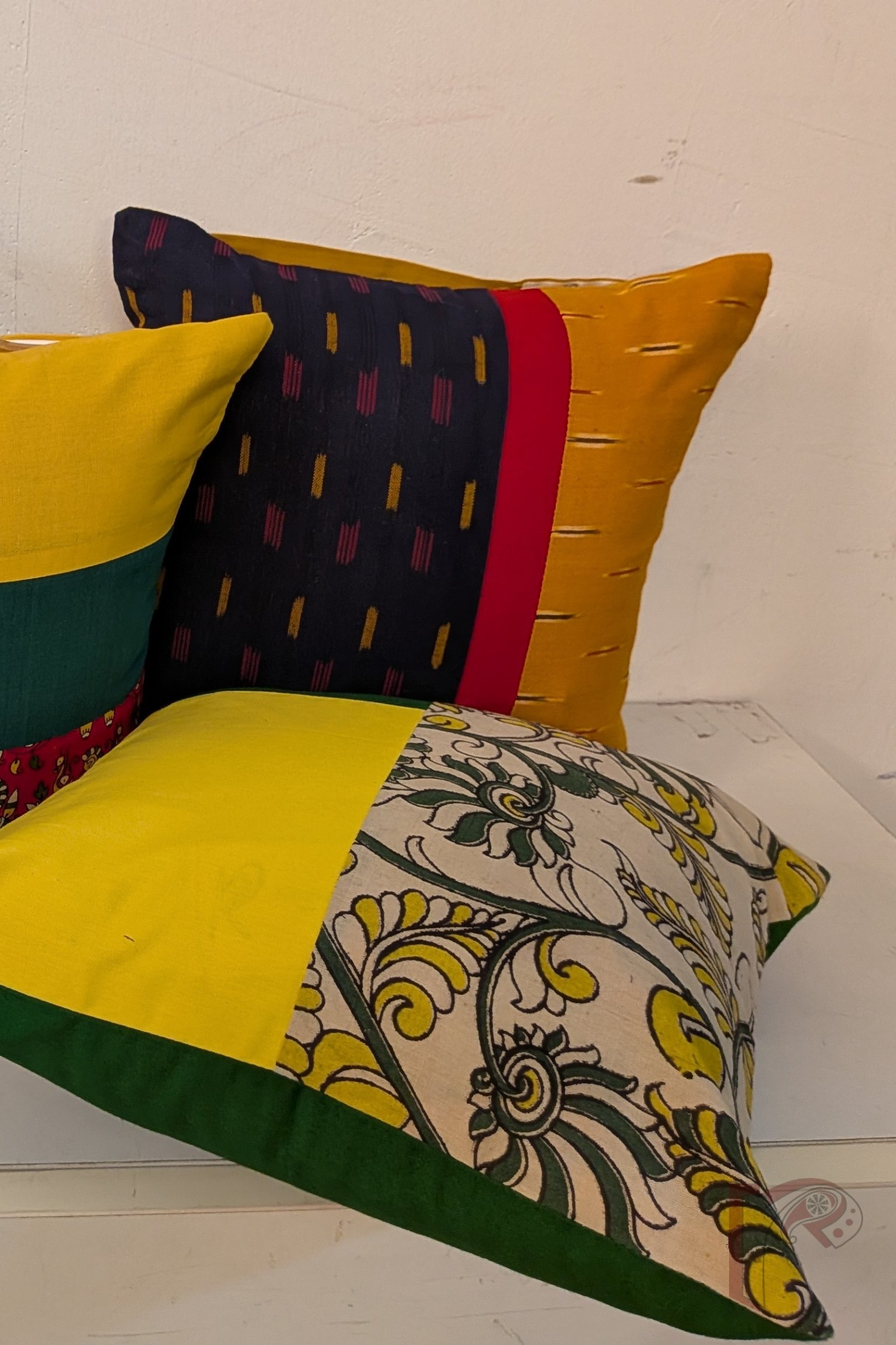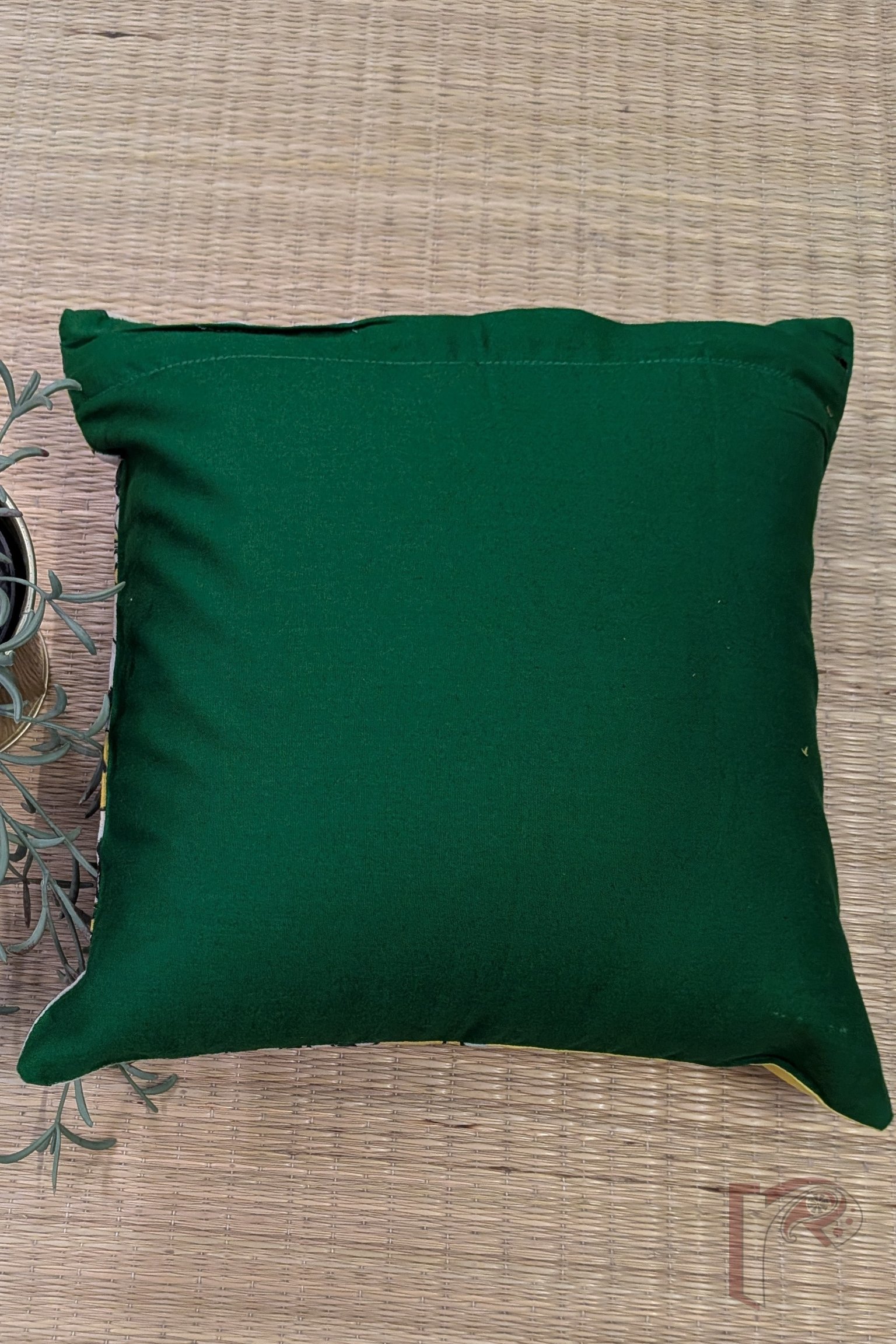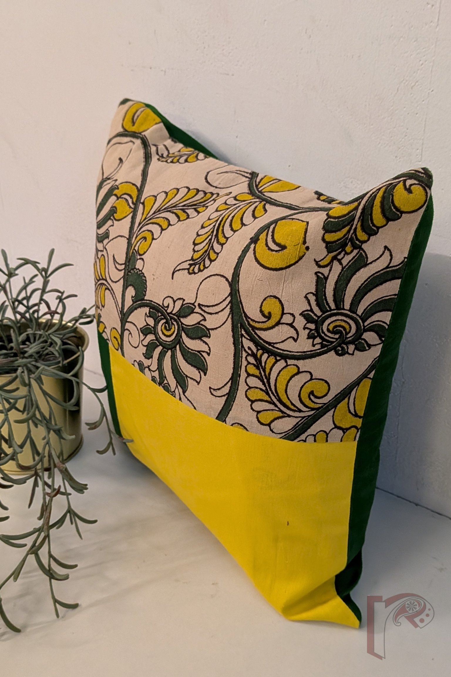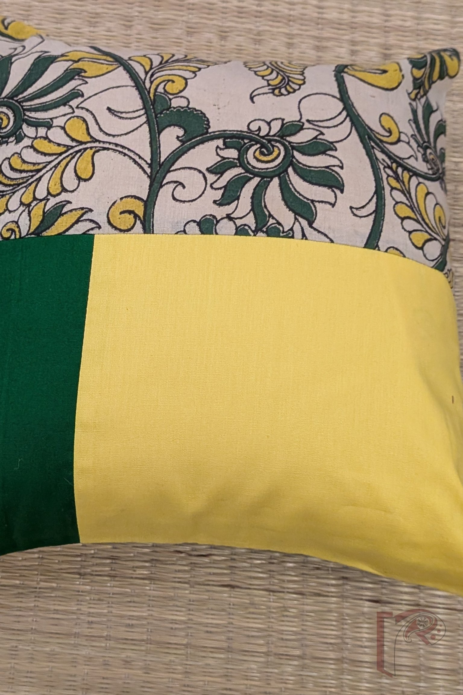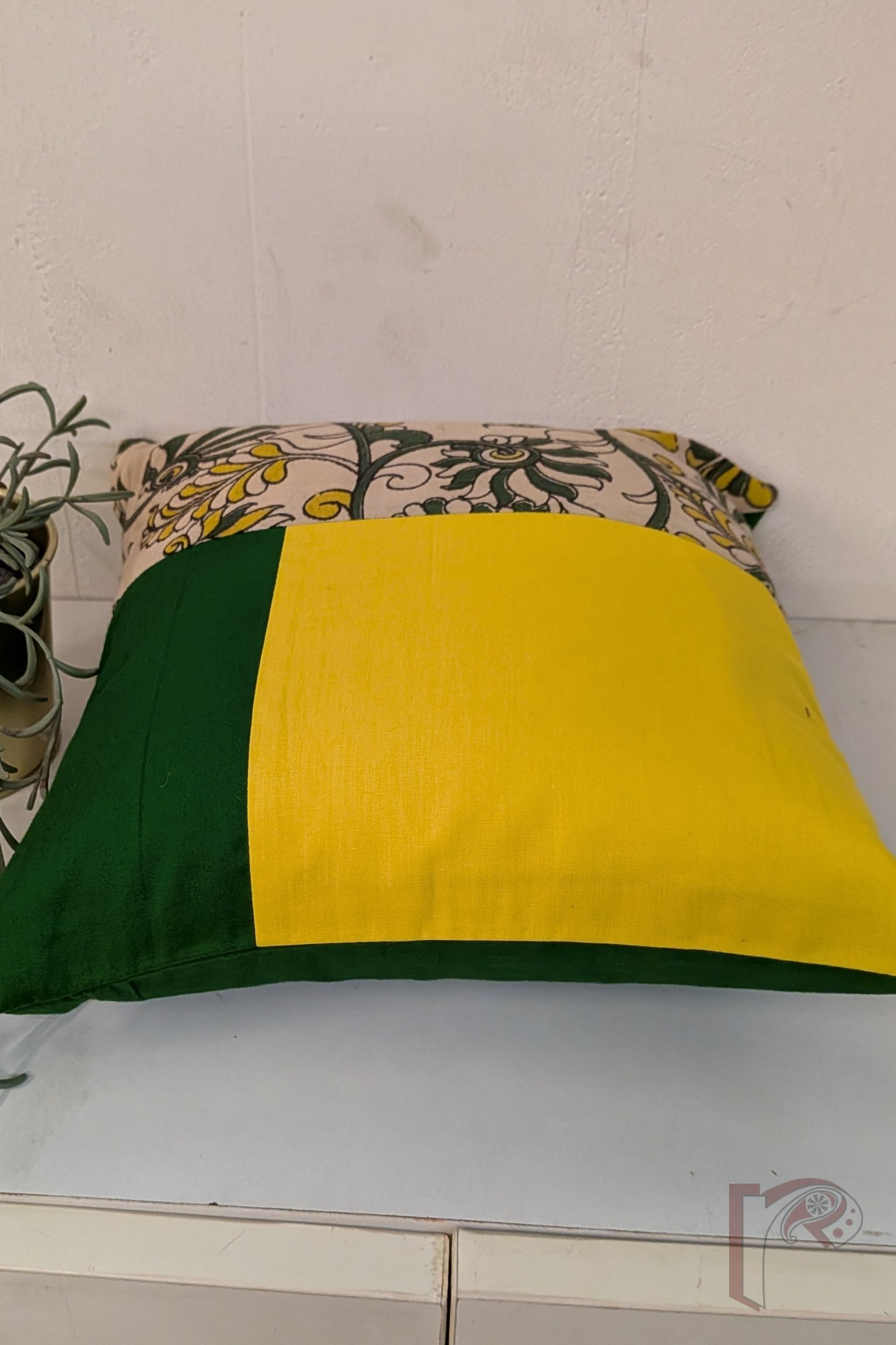 Cozy Cushion: Offwhite Kalamkari Flower Print with Yellow and Bottle Green Patchwork Cotton Cushion Cover 12″ x 12″