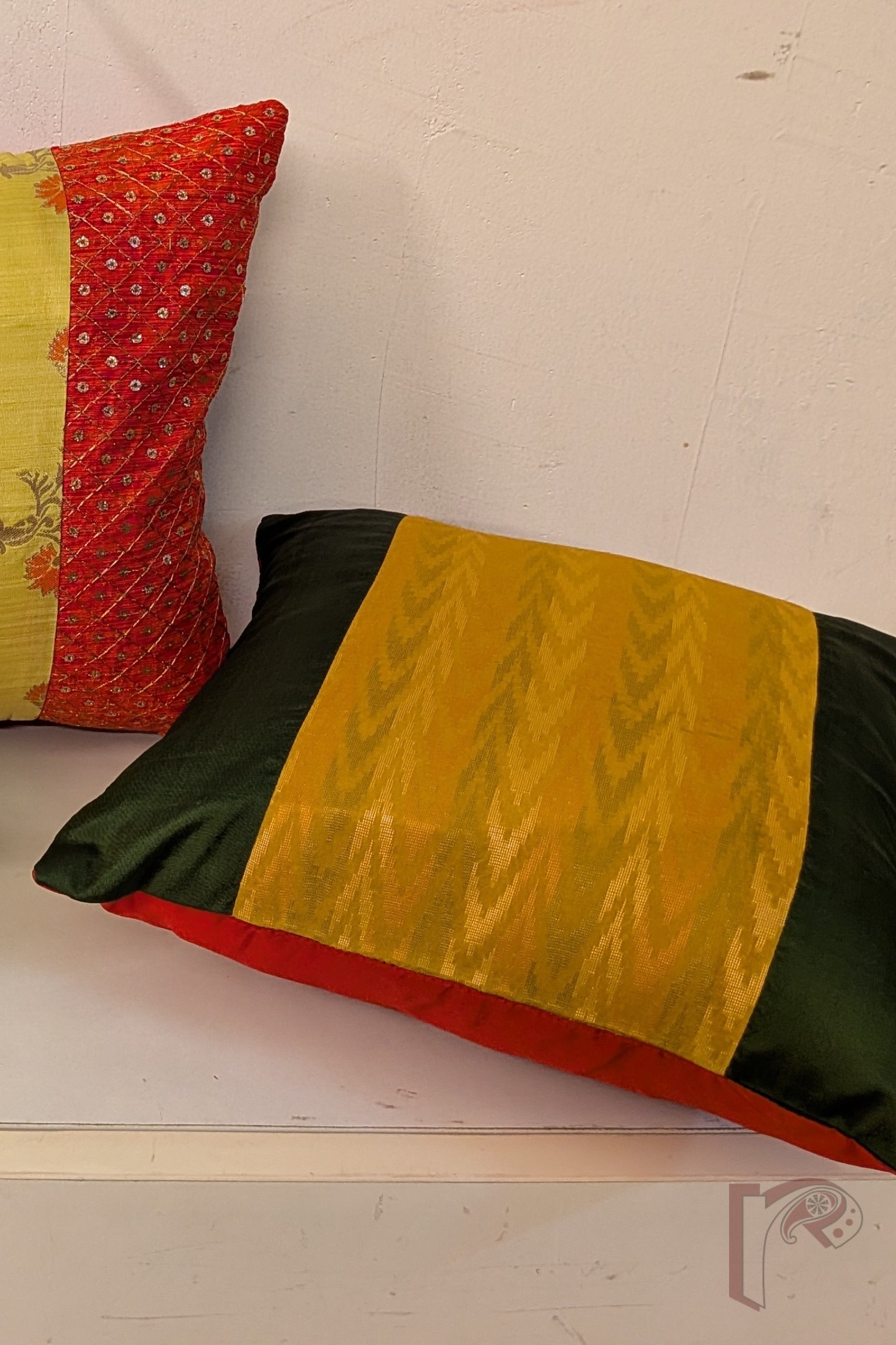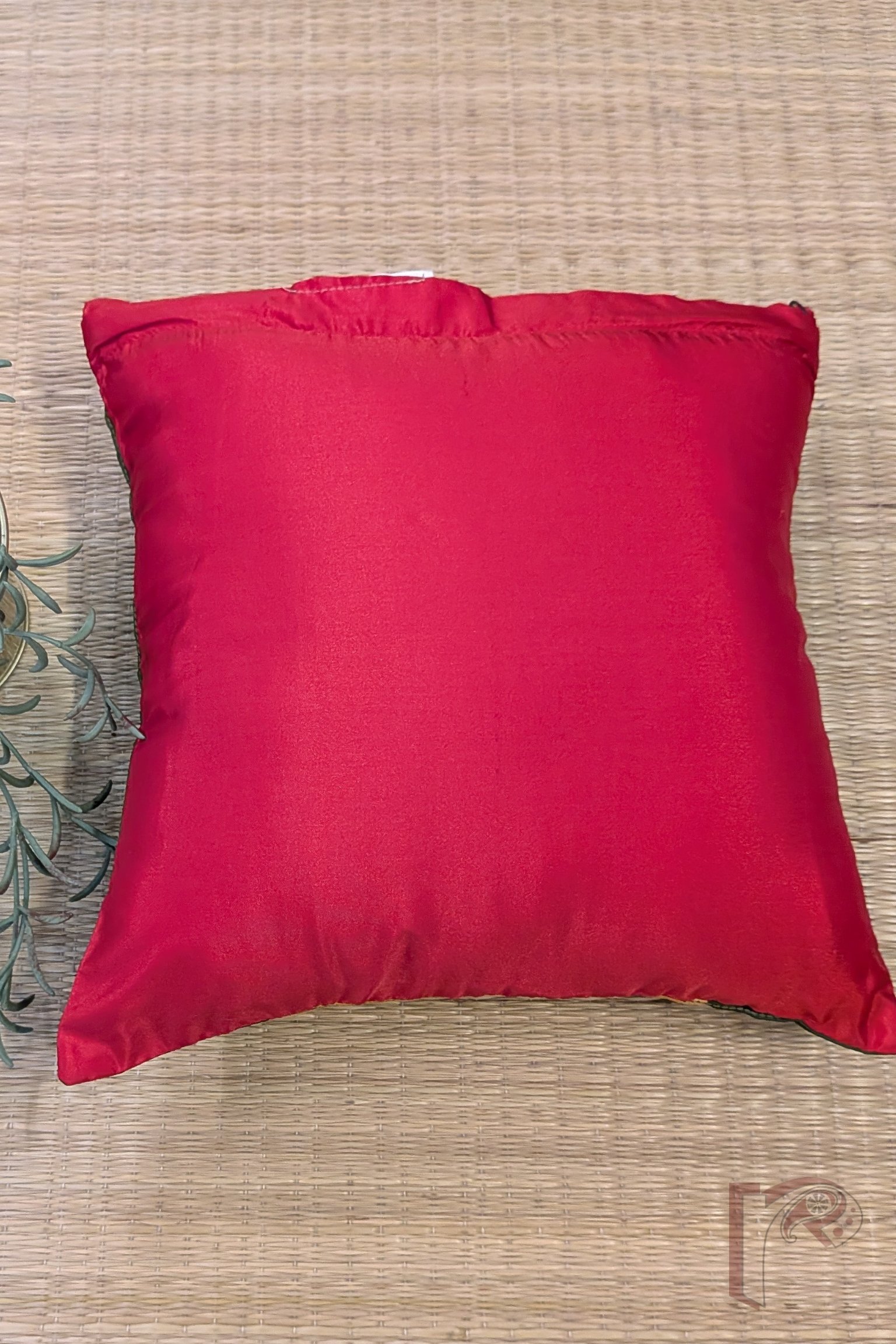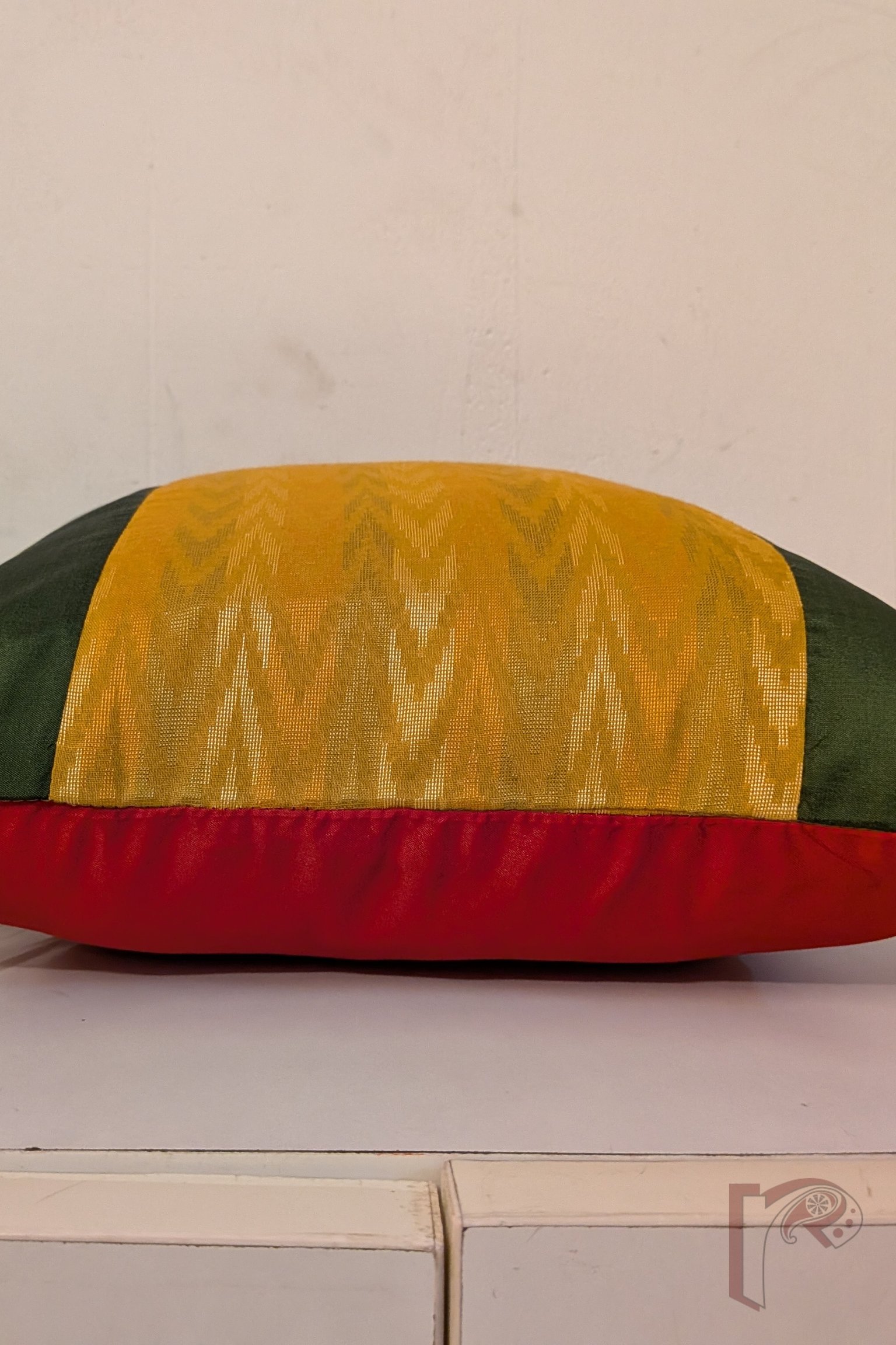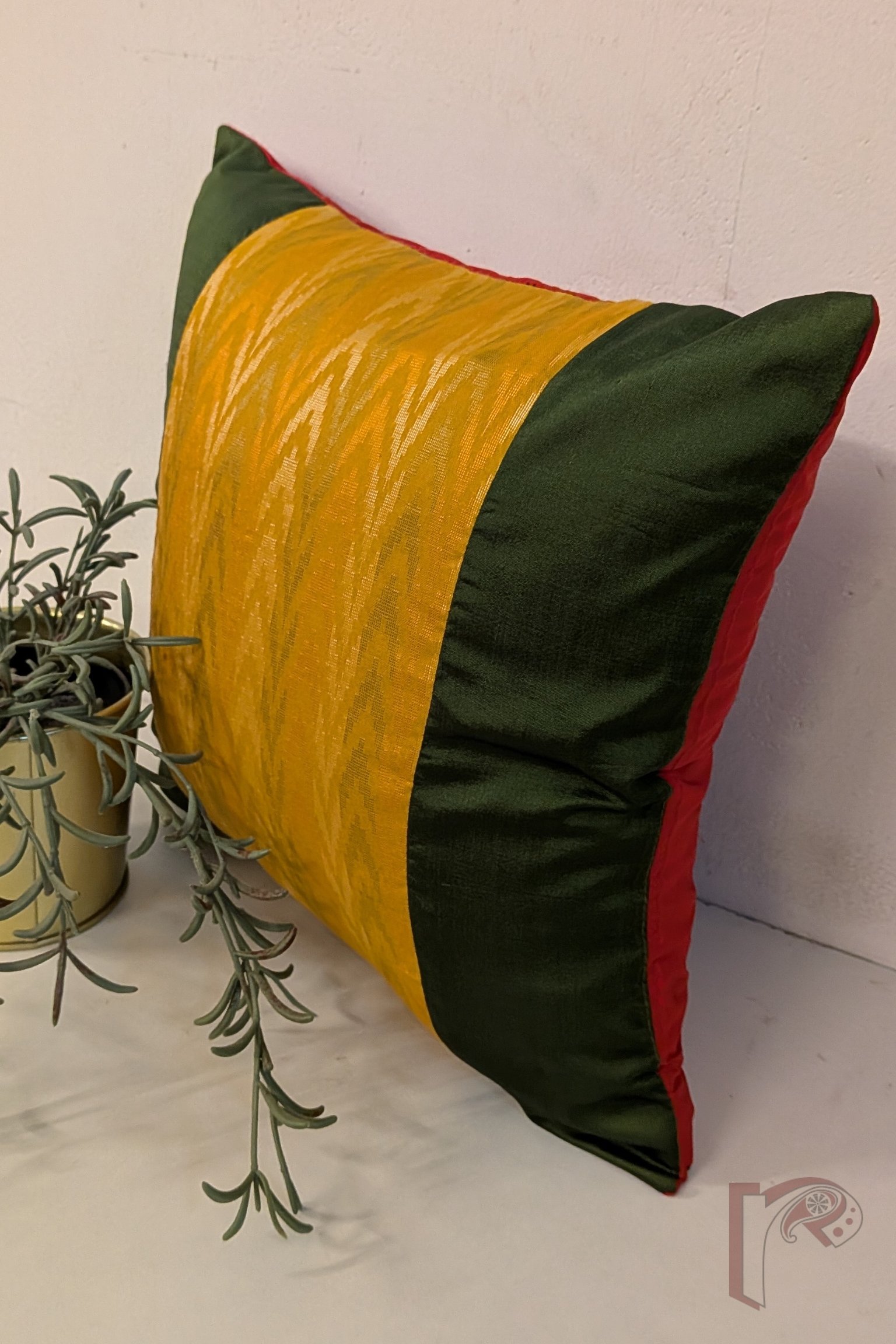This exquisite olive green and mustard silk pattu cushion cover is designed with contrasting panels — plain olive silk at the ends and a vibrant zigzag machine weave in shades of green, orange, and cream at the center. The silk red pattu back enhances its festive charm, making it a perfect addition to rich, traditional interiors. Crafted from premium cotton silk and pattu fabrics, this cover blends color, texture, and craftsmanship to create a timeless piece that brings both warmth and sophistication to your living space.