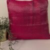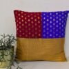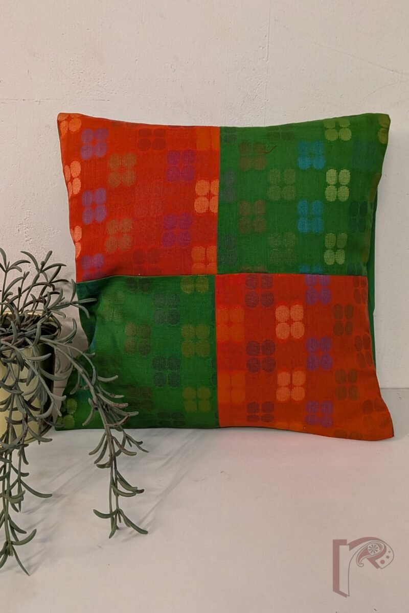 This cotton silk cushion cover features a playful machine-woven cluster of four circle motifs on vibrant parrot green and orange panels, arranged in a unique quadrant patchwork design. The smooth green silk pattu back complements the intricate front, creating a harmonious and elegant finish. Handcrafted, artistic, and vibrant, this cushion cover adds a lively and contemporary charm to any sofa, chair, or bedroom décor, making it a standout accent in your living space.