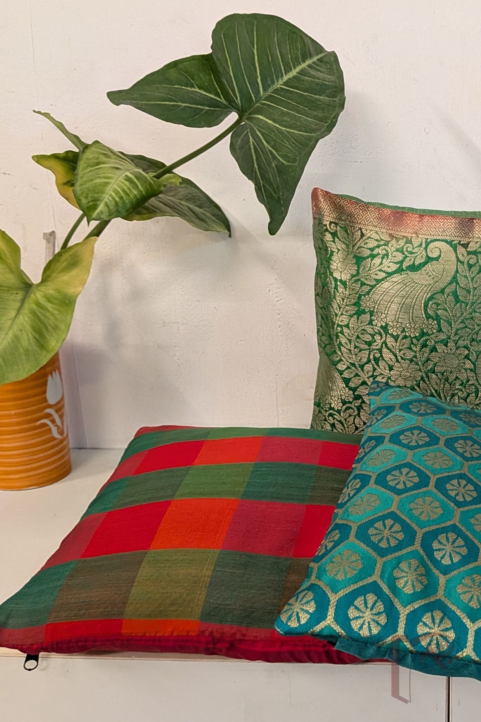 This vibrant cotton silk cushion cover features a lively combination of red, green, and orange checkered patterns, creating a warm, cheerful look that instantly enlivens any space. The plain red cotton silk back balances the design with a neat finish, while the soft sheen of the fabric adds a touch of elegance. Crafted with care, this piece brings together traditional textile charm and everyday usability, making it perfect for living rooms, bedrooms, reading corners, and festive décor setups. The cushion cover feels refined, colorful, and full of character, adding a joyful accent to your interiors.