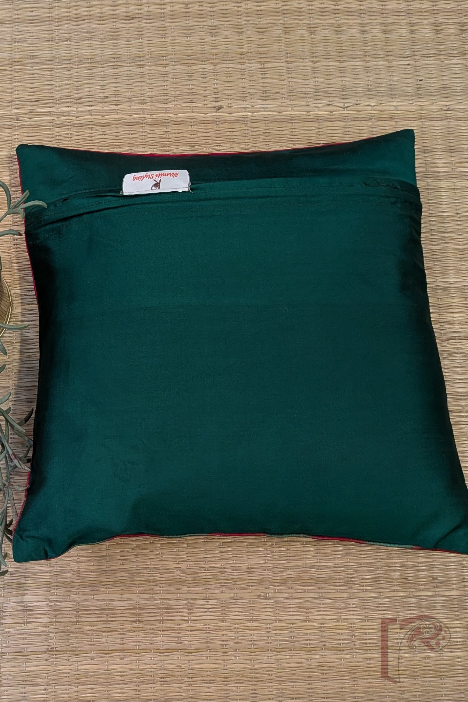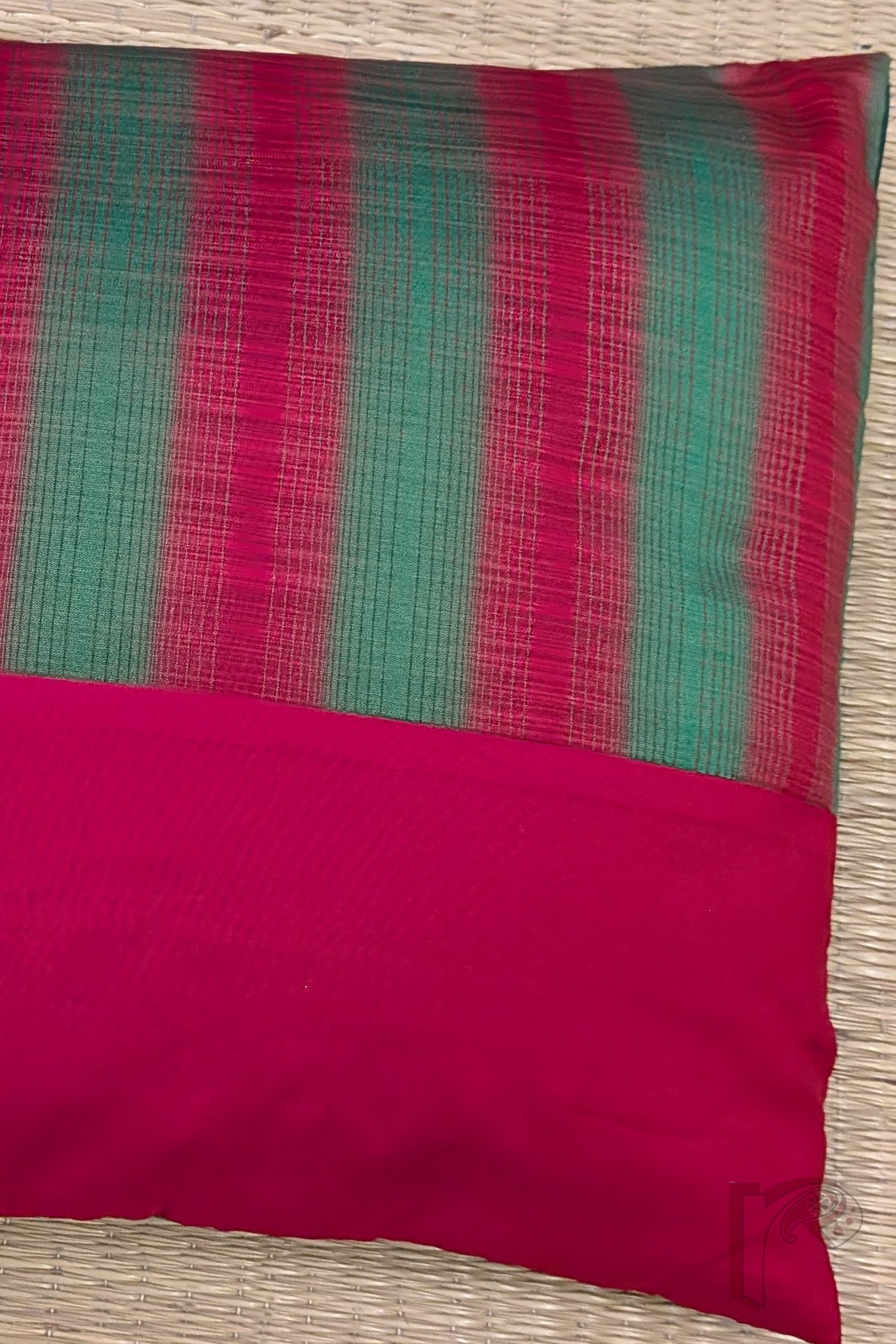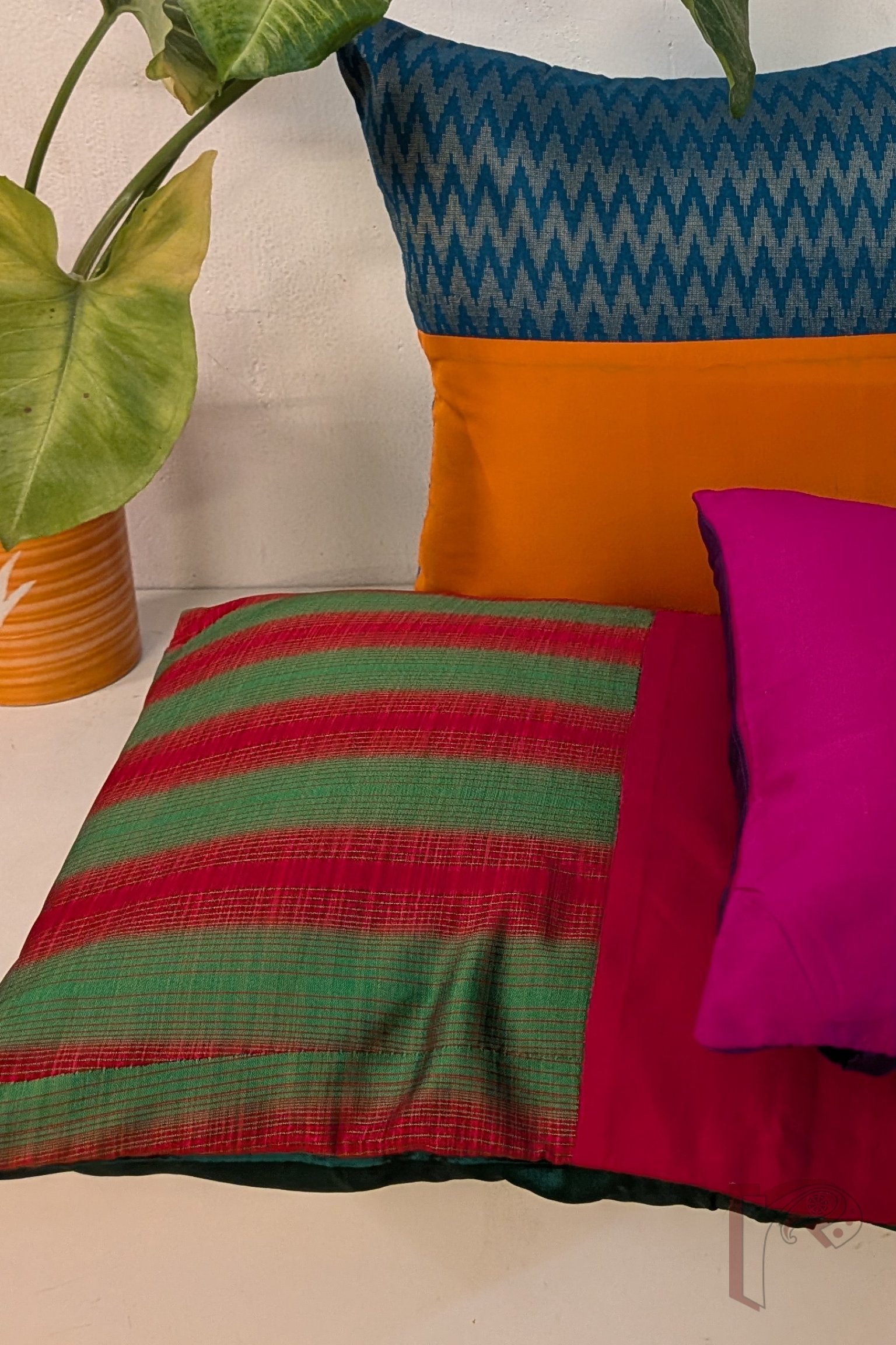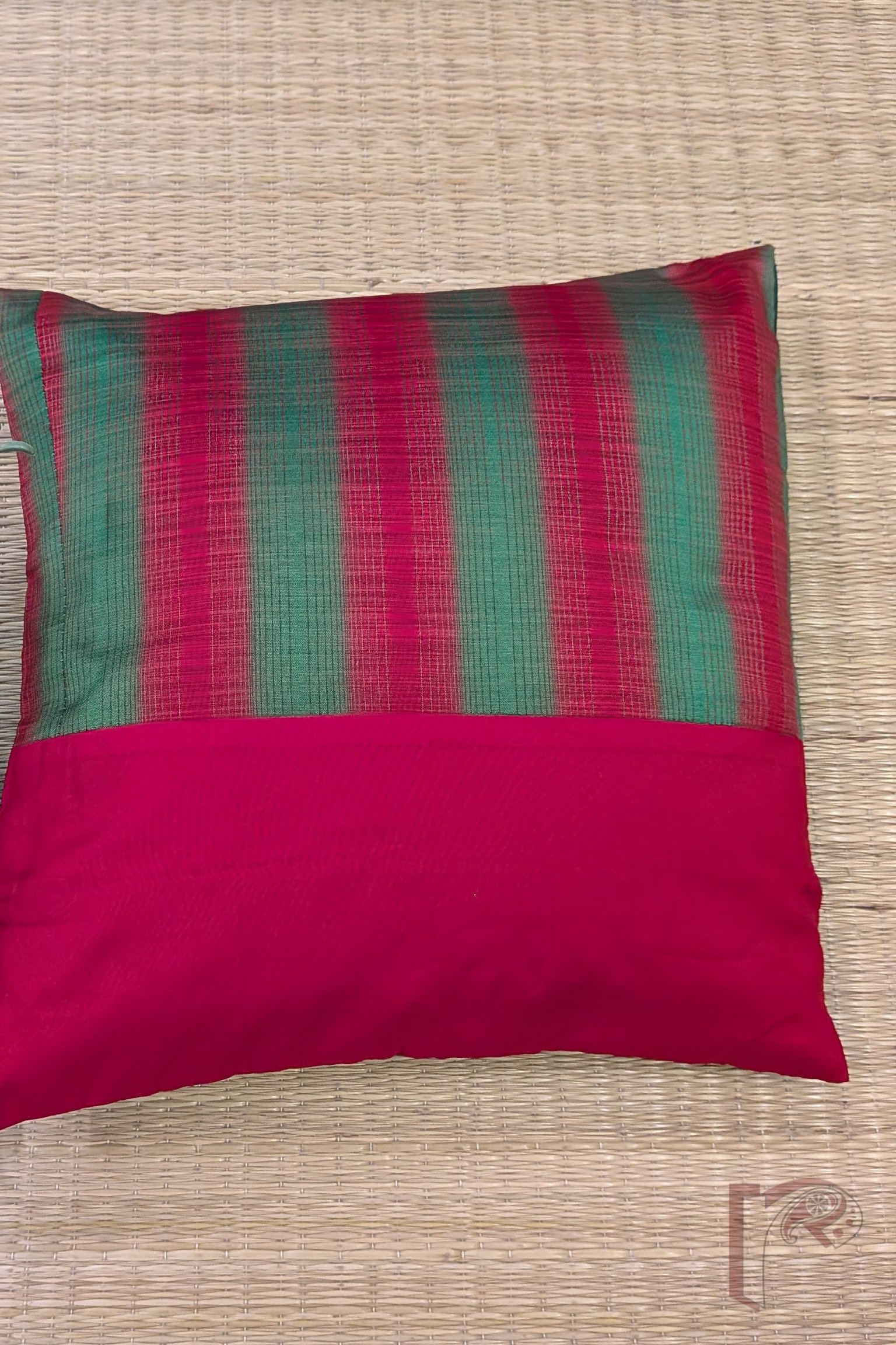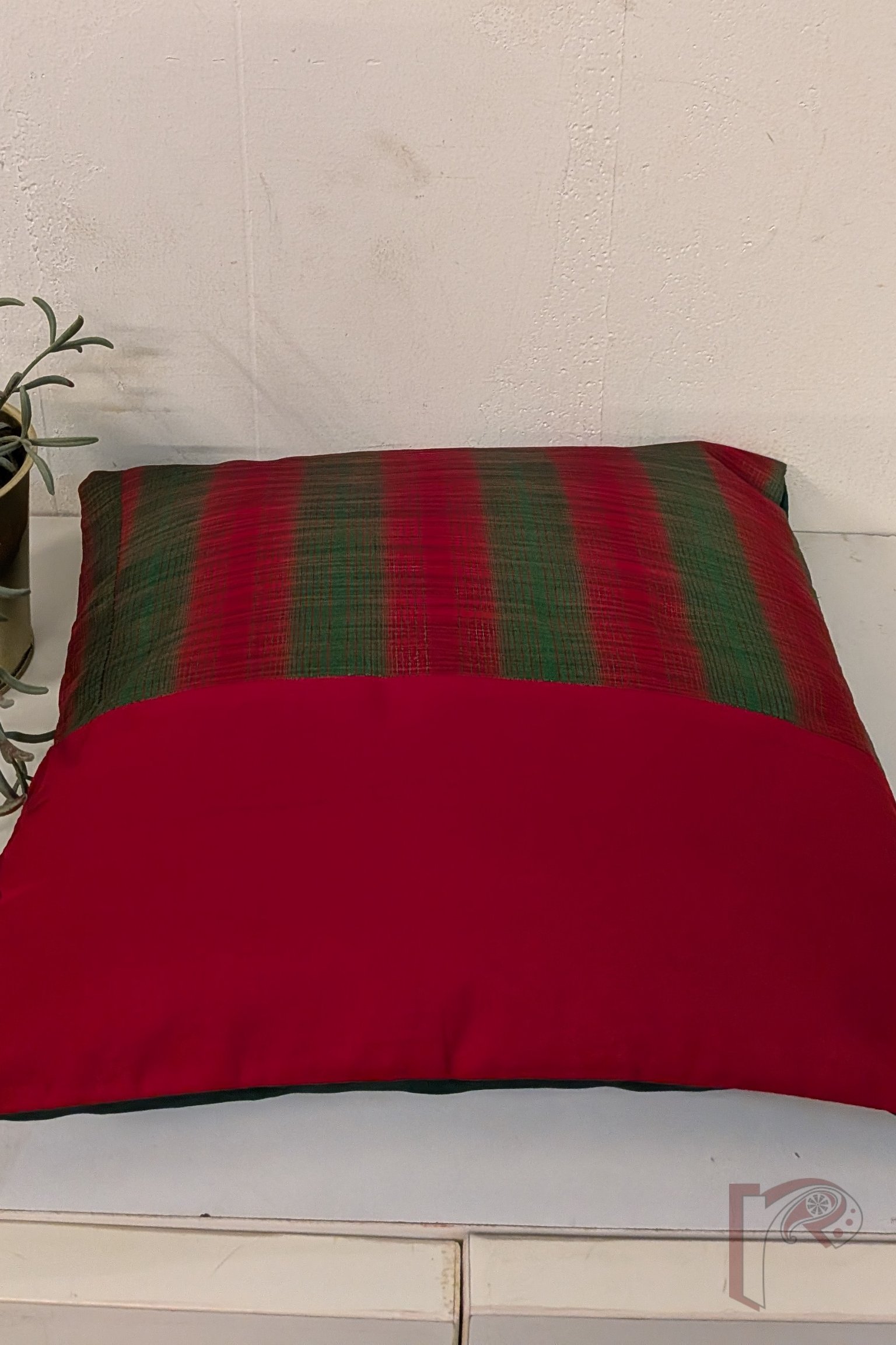 This half-panel cushion cover pairs a vibrant red and green printed stripe fabric with a plain red silk panel, creating a striking and balanced contrast. The plain green silk back complements the design, adding depth and elegance to the overall look. Handcrafted, colorful, and contemporary, this cushion cover brings a cheerful yet sophisticated touch to any sofa, chair, or bedroom décor.