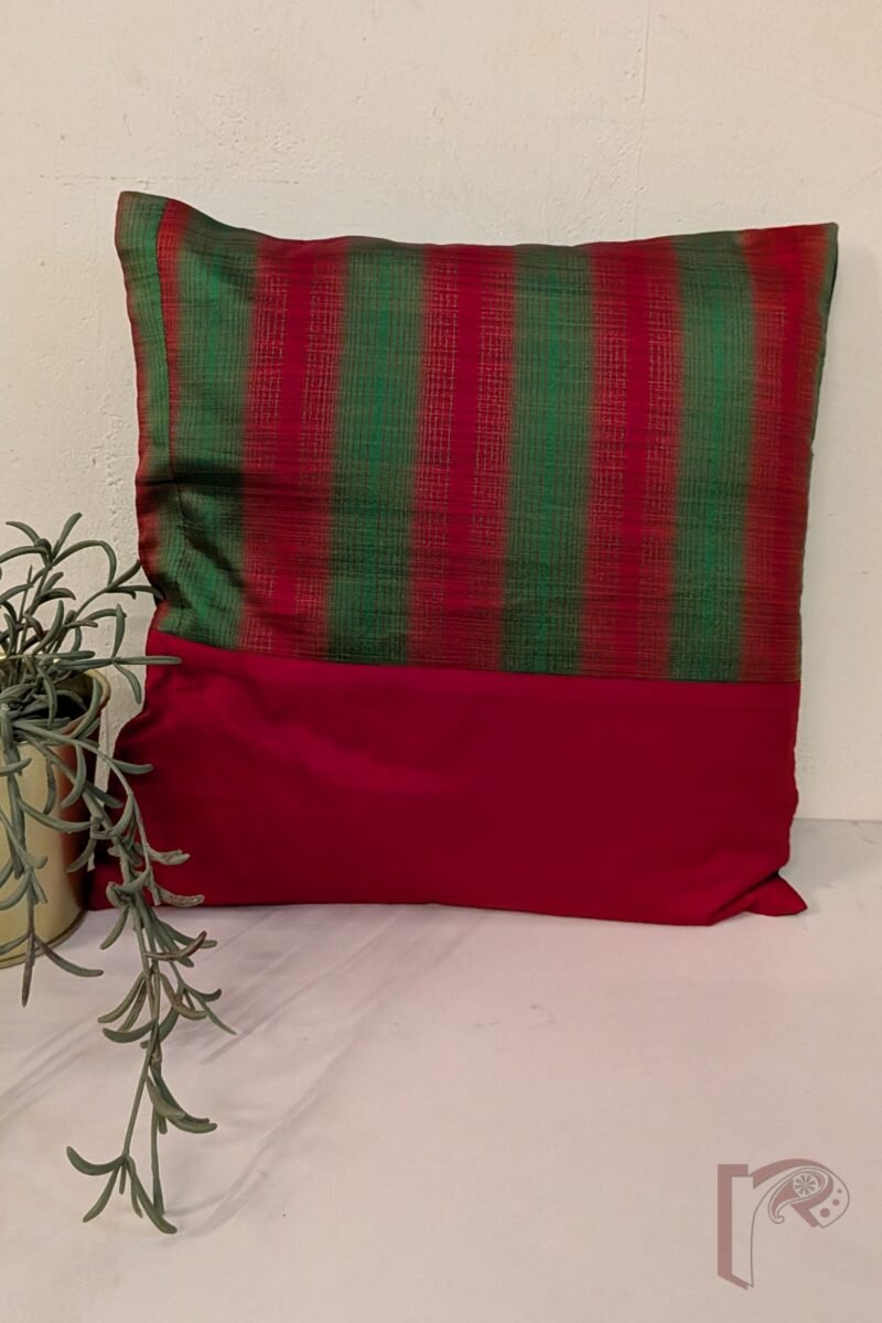 Cozy Cushion – Red & Green Printed Stripe with Plain Red Silk Half-Panel Cushion Cover 12″ x 12″