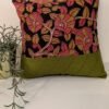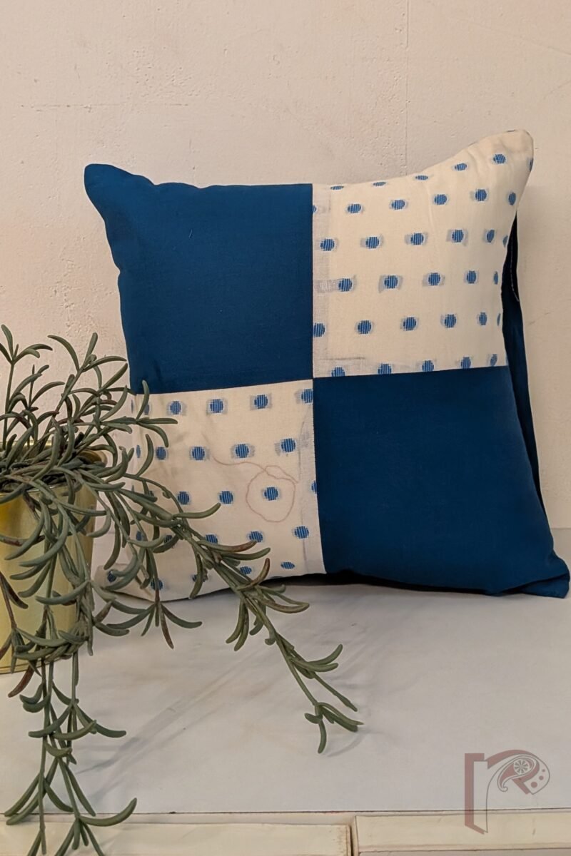 This elegant cushion cover features a white handloom cotton fabric adorned with blue circular thread weaves, creating a subtle polka-dotted effect that exudes artisanal finesse. It is beautifully teamed with plain copper sulphate blue cotton to form a refined patchwork pattern, blending texture and tone seamlessly. The plain copper blue back ensures comfort and consistency in design. Crafted with care, this cushion brings handwoven charm, soothing color balance, and timeless sophistication to any décor setting.
