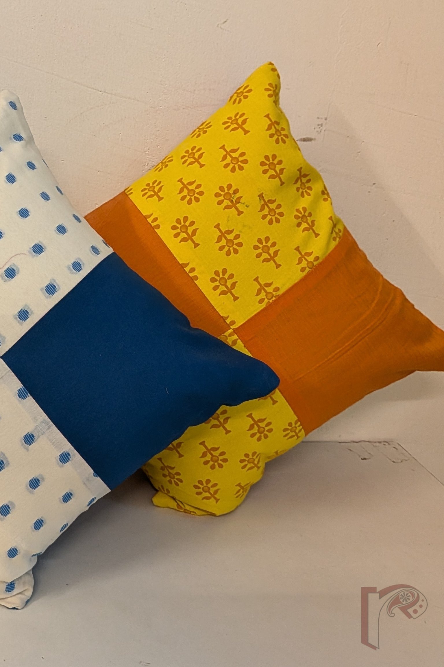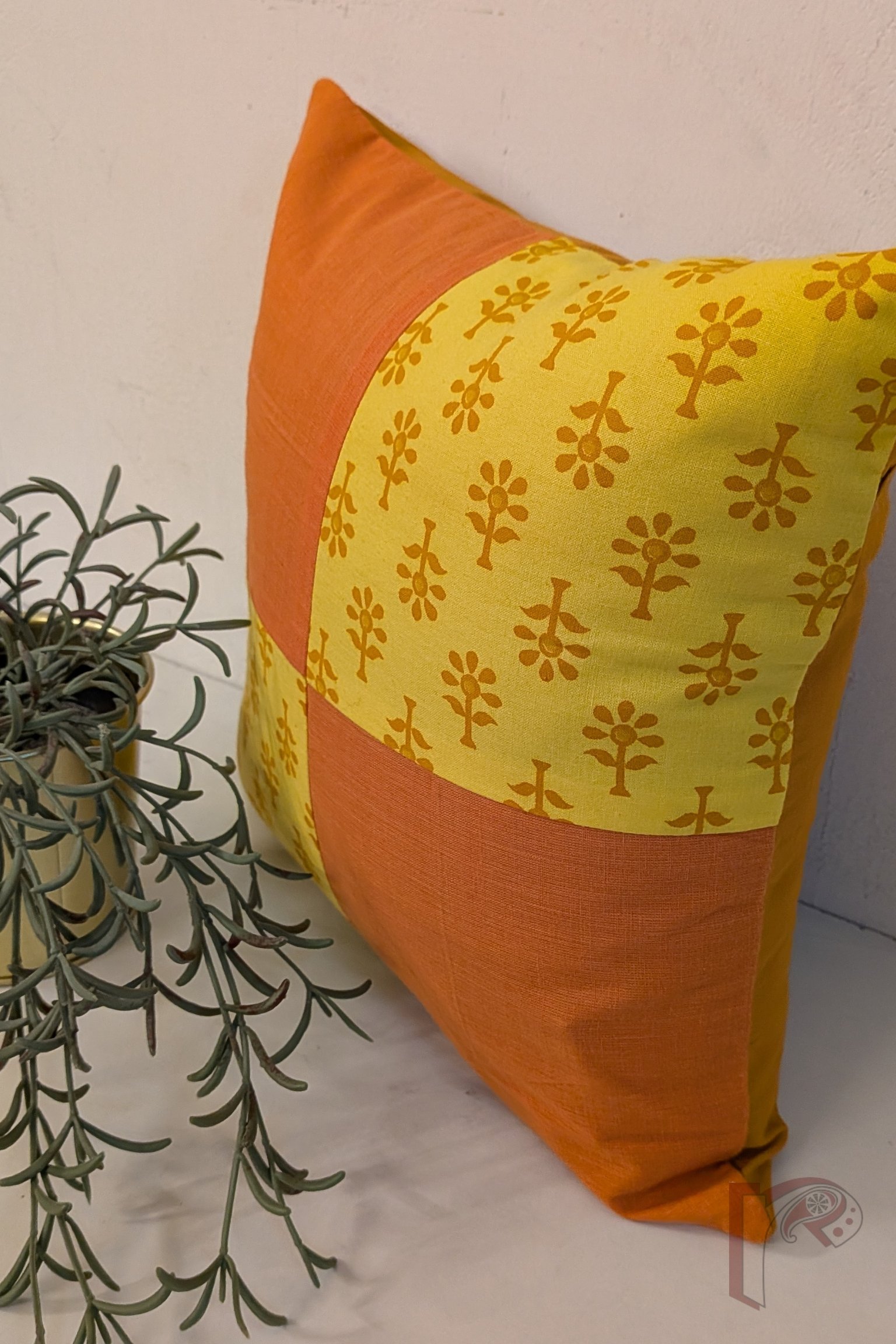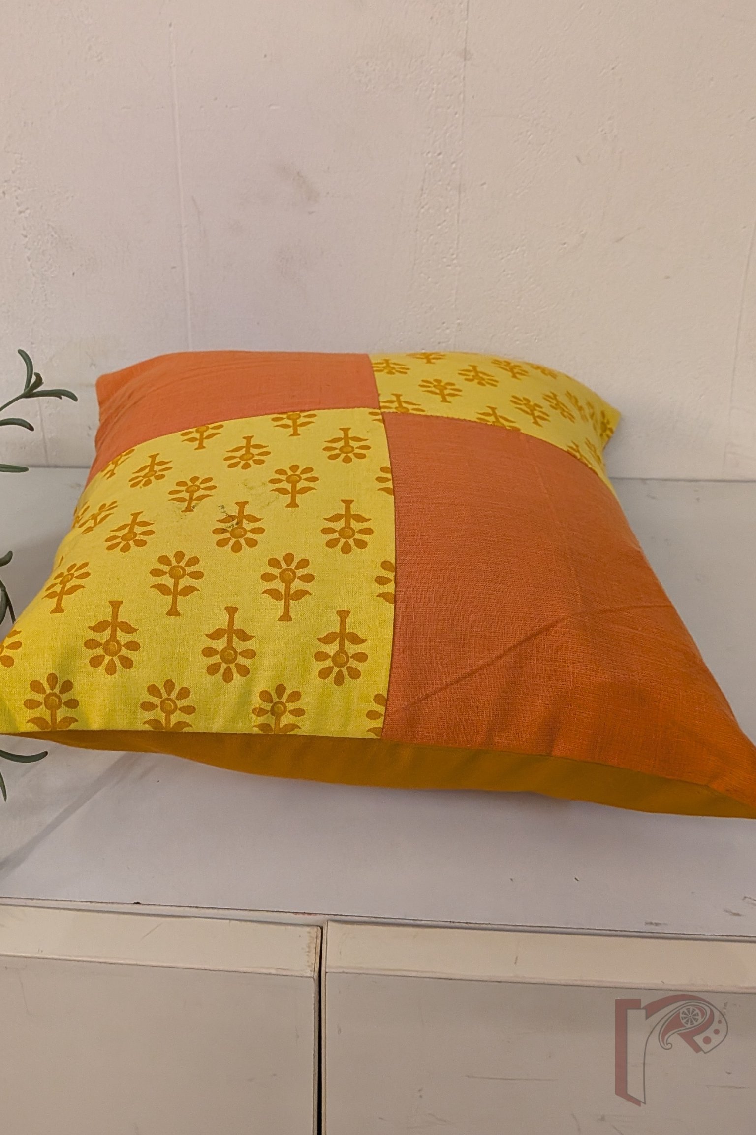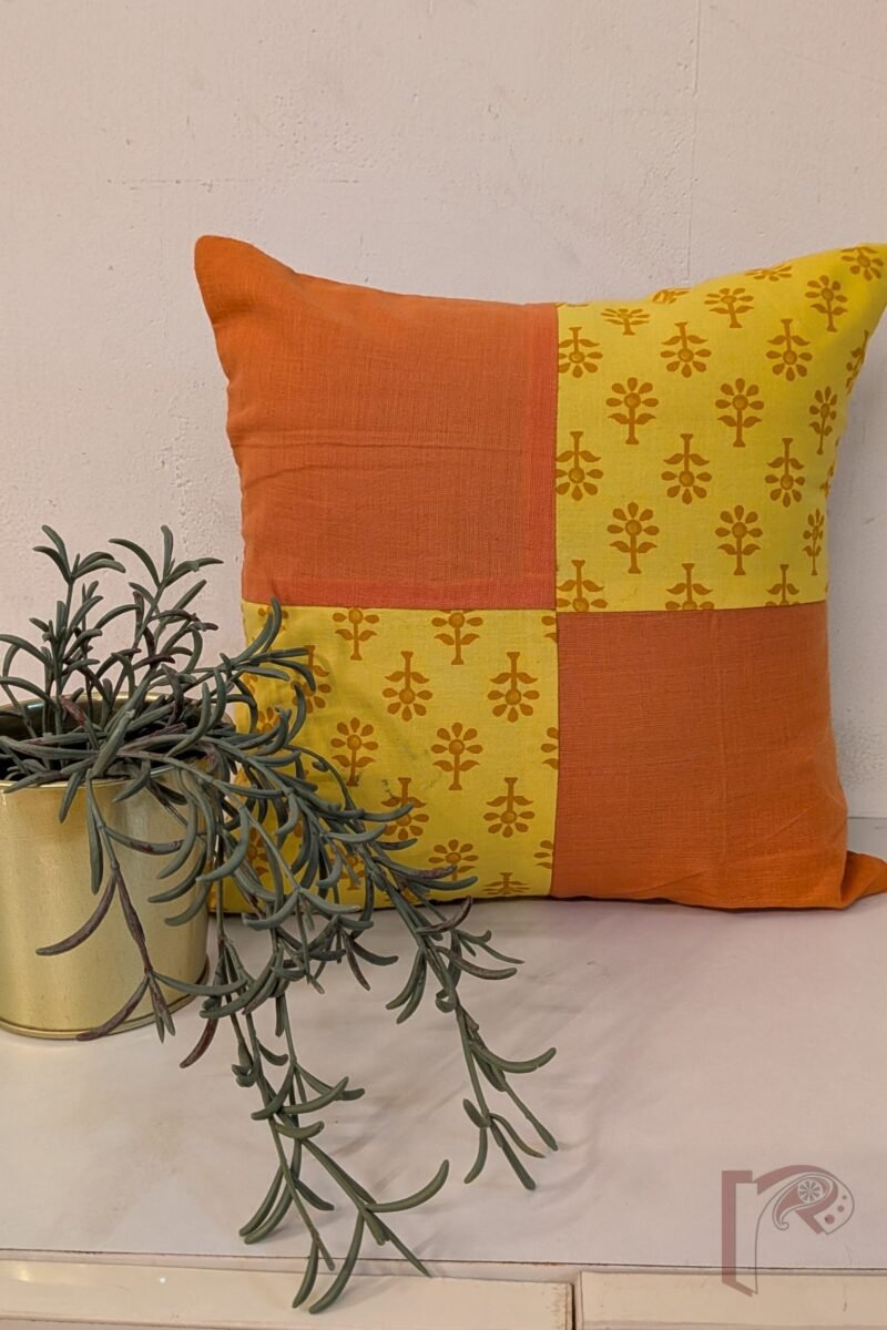 Cozy Cushion: Yellow Cotton with Orange Flower Print and Mangalgiri Patchwork Quadrant Cushion Cover 12″ x 12″