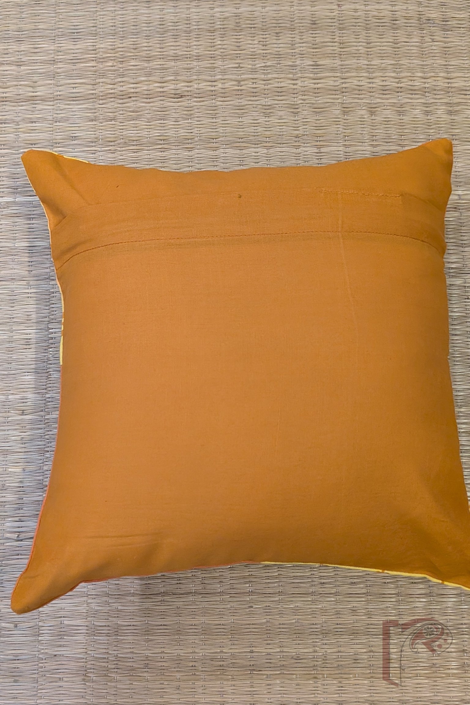 Cheerful and full of handcrafted charm, this Yellow Cotton Cushion Cover features orange floral prints beautifully paired with orange Mangalgiri cotton patches arranged in a four-quadrant pattern. The fusion of print and weave brings a vibrant geometric balance, showcasing the richness of traditional Indian textiles. The plain orange cotton back adds a touch of simplicity, letting the front design shine. Made from soft, breathable cotton, this cushion cover exudes a sense of warmth, artistry, and festive vibrancy—perfect for adding a refreshing pop of color and texture to any living space.