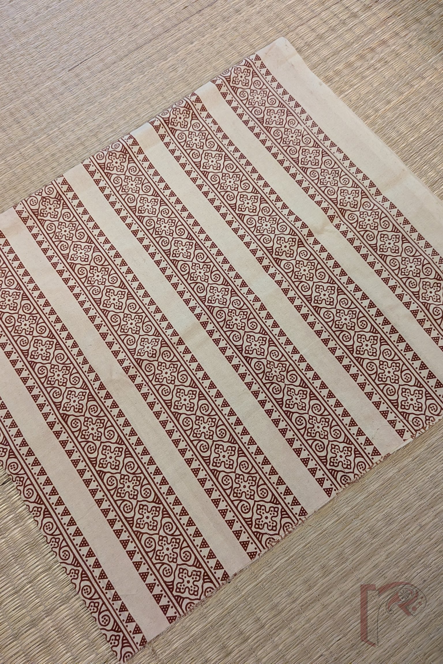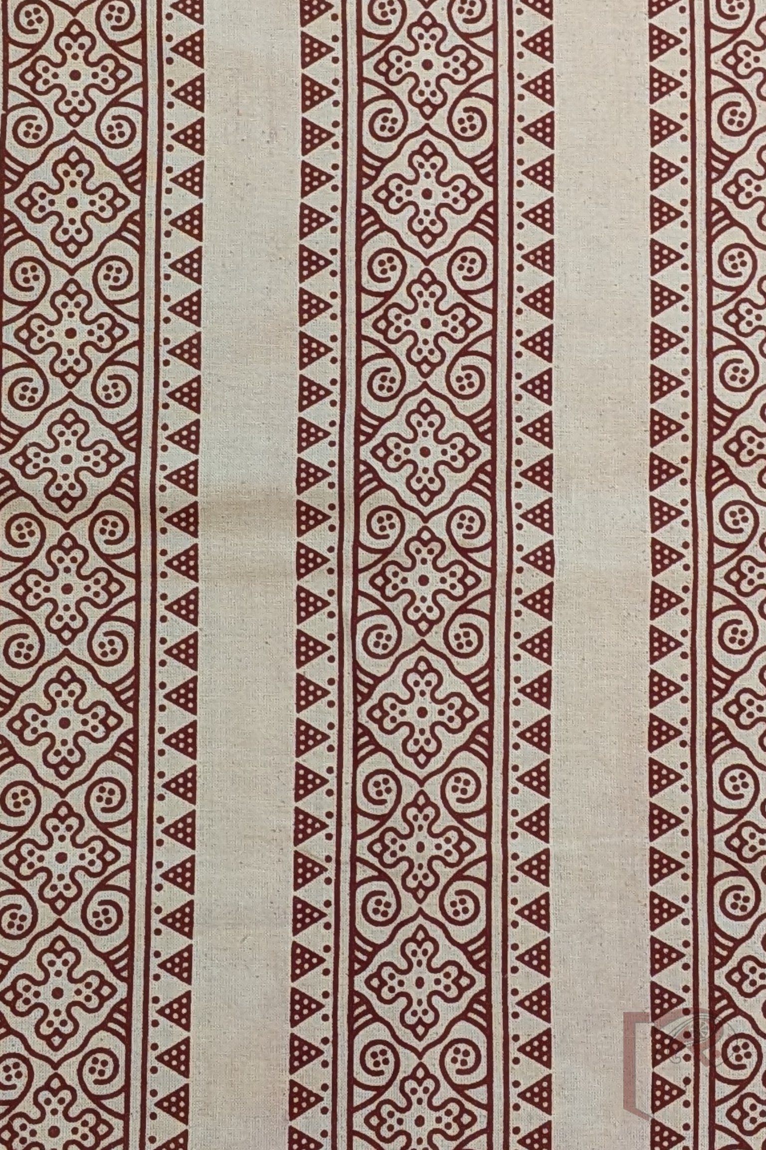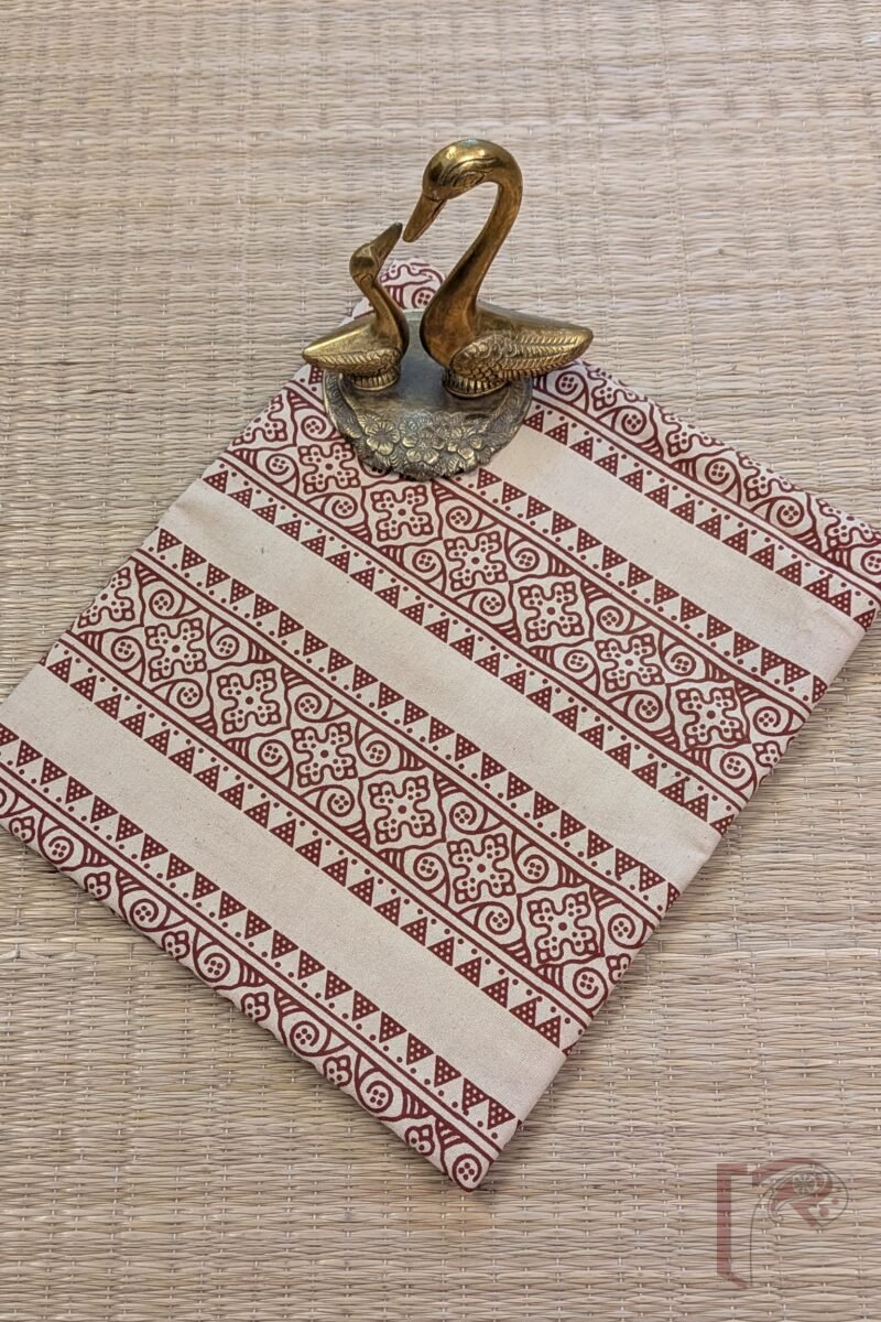 Elegant and distinctive, this cream cotton blouse piece features Ajrakh-inspired floral and triangle motifs arranged in parallel border-like lines. The design draws inspiration from traditional layout techniques, giving it a refined architectural feel. An excellent choice for light-toned sarees, this piece radiates understated charm.