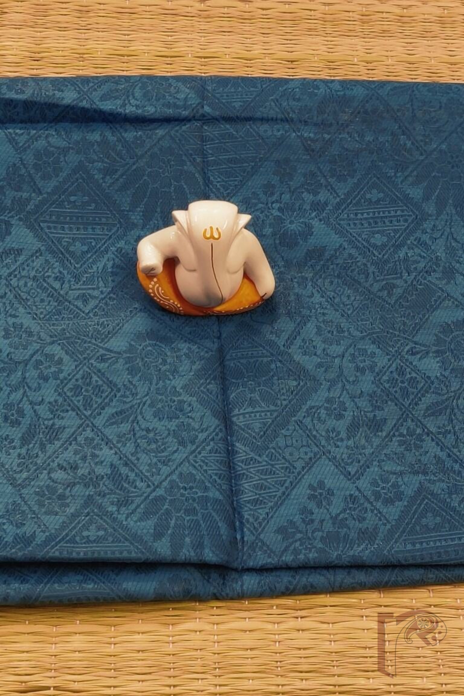 This deep blue handwoven Khadi silk blouse piece carries a timeless richness, highlighted by subtle motifs in dull dark blue thread. The fabric showcases the artistry of traditional weaving, where every motif is closely set to create a refined surface texture. Soft to the touch yet durable, this blouse piece embodies the unique quality of Khadi silk—comfort with sophistication. Its versatile tone makes it suitable for pairing with both contrasting and harmonizing sarees, offering a look that is both modern and steeped in tradition.