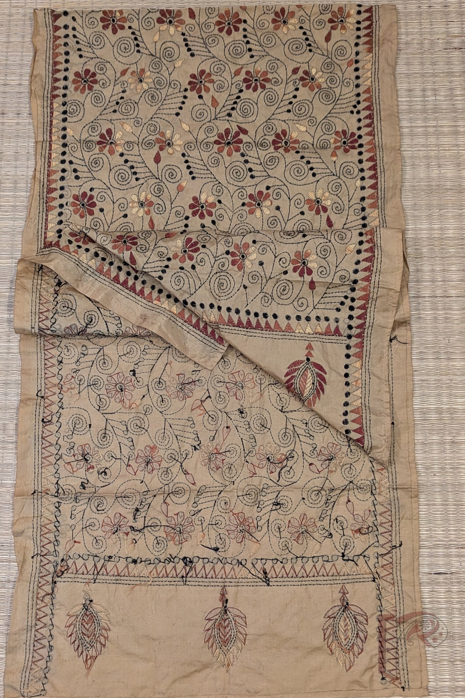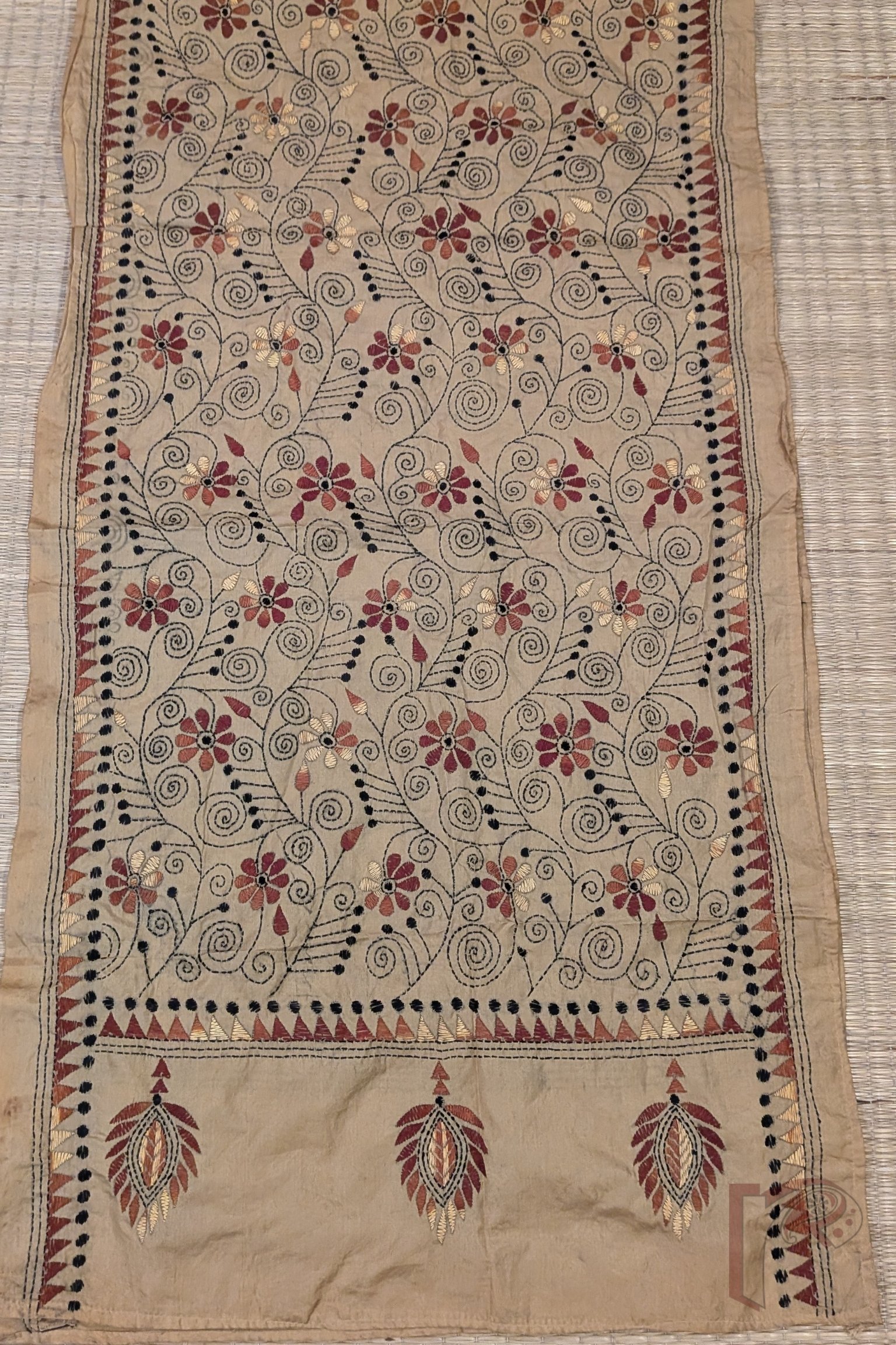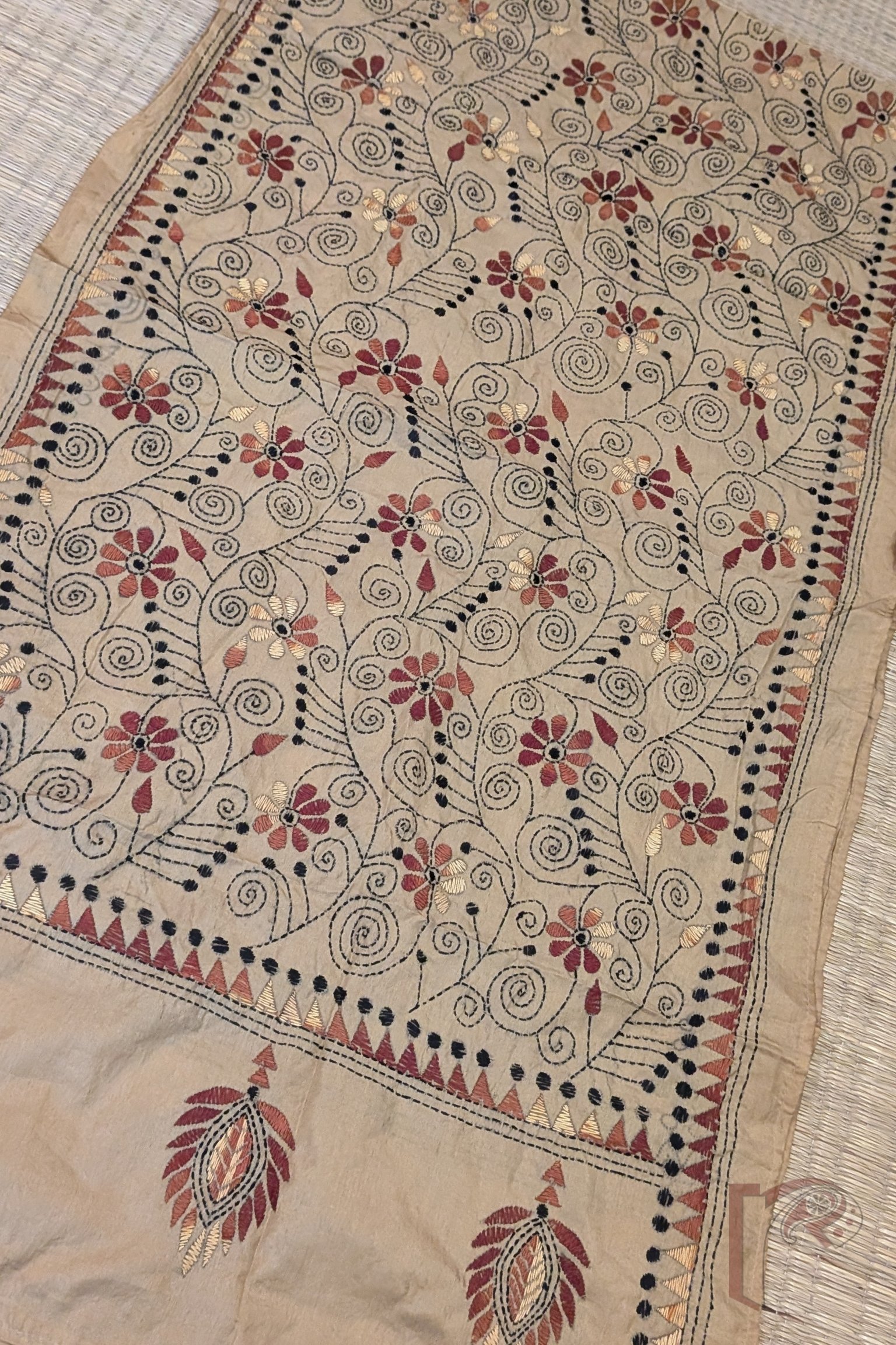 Dreamy Drapes – Biscuit Brown Blended Silk Kantha Stole with Floral Stem & Circular Bud Motifs in Brown and Black