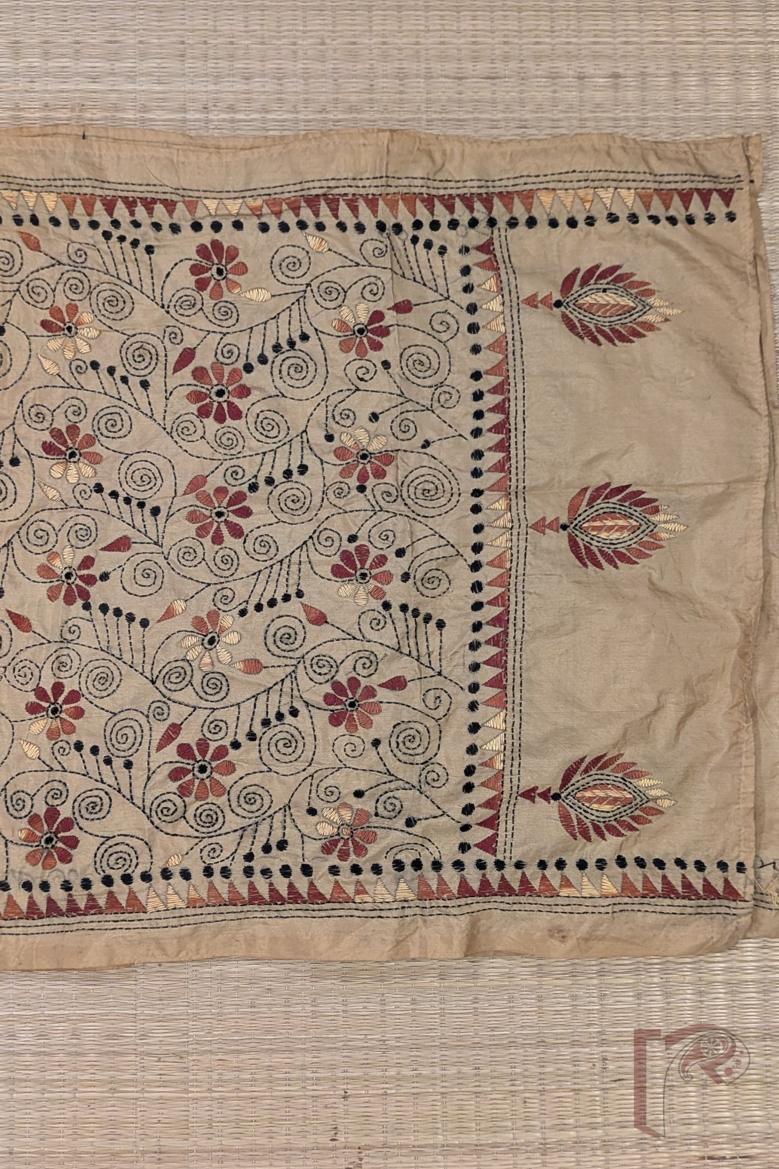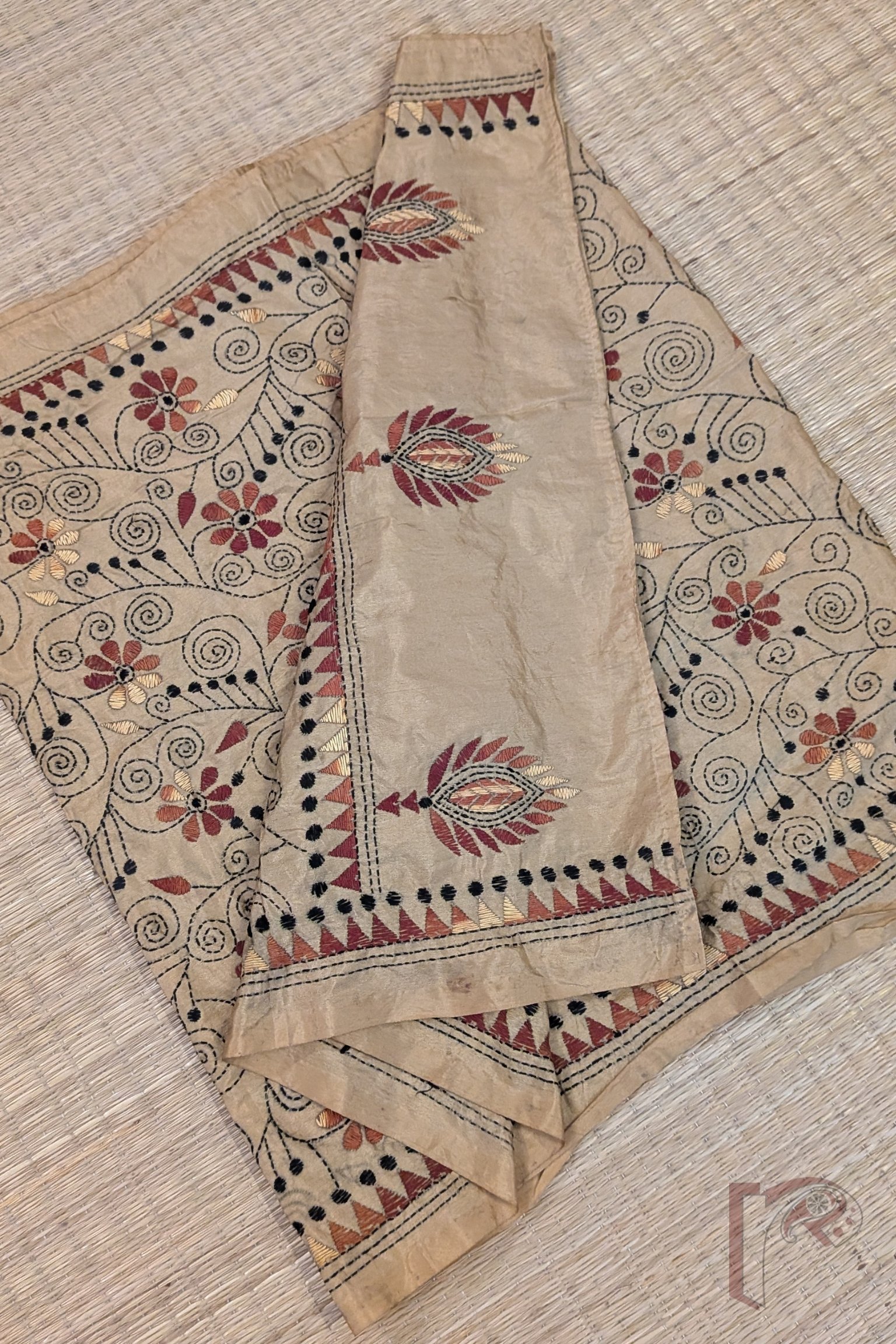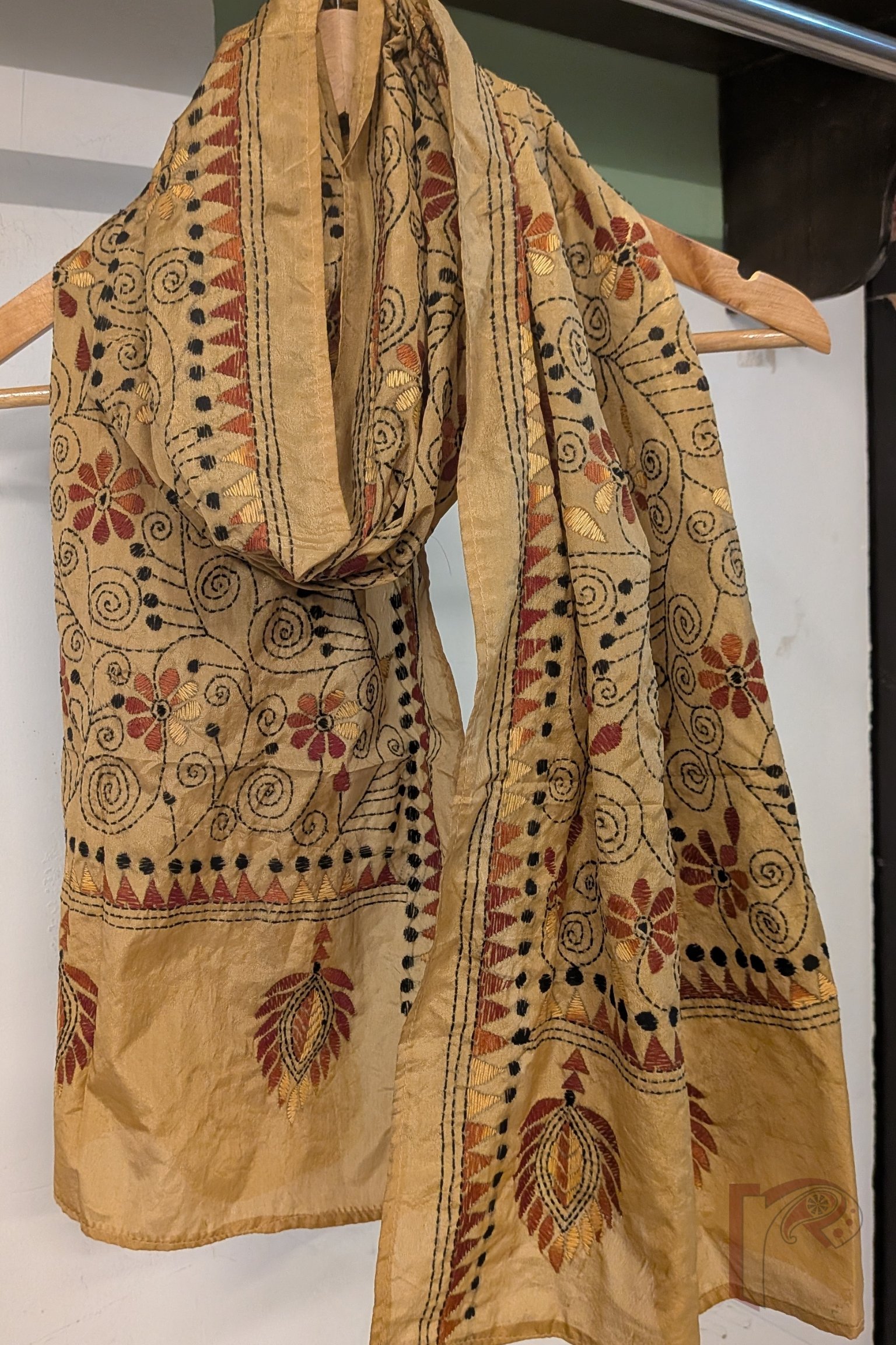 Dreamy Drapes – Biscuit Brown Blended Silk Kantha Stole with Floral Stem & Circular Bud Motifs in Brown and Black