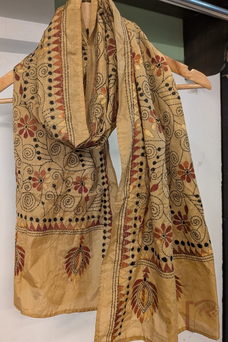 Wrap yourself in the timeless elegance of Bengal’s heritage with our exquisite collection of kantha-embroidered stoles, where every stitch tells a story. Crafted from luxurious blended silks and pure tussar silk, these stoles are as soft as a whisper yet rich in texture, making them perfect for both everyday grace and festive glamour. The breathable, lightweight fabrics drape effortlessly, while the intricate kantha embroidery—a centuries-old Bengali craft—adds a touch of handcrafted opulence.