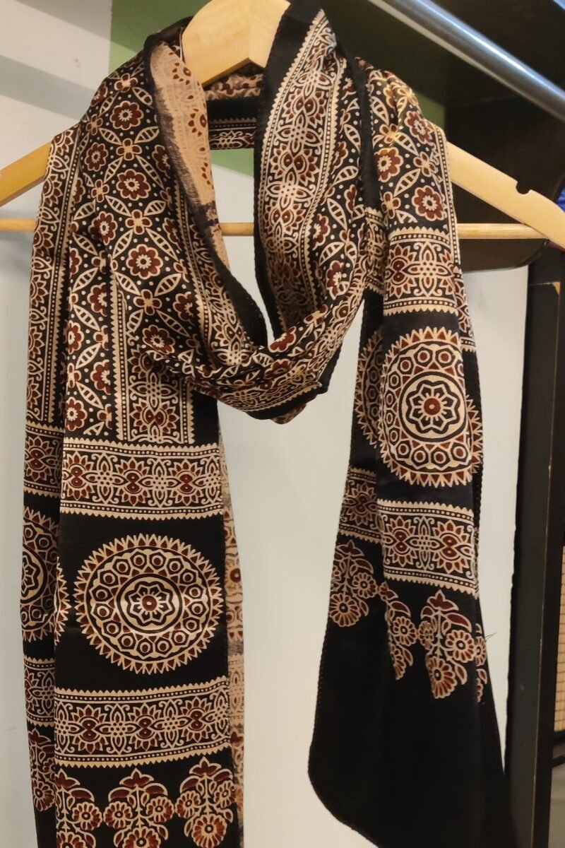 Whether you choose a bold black-and-cream piece with elephant and bird motifs or a subtle zigzag-patterned stole, these Ajrakh creations are more than accessories—they’re wearable art. Ethically crafted and sustainably dyed, each piece supports the preservation of this UNESCO-recognized craft. Wrap yourself in history, one drape at a time.