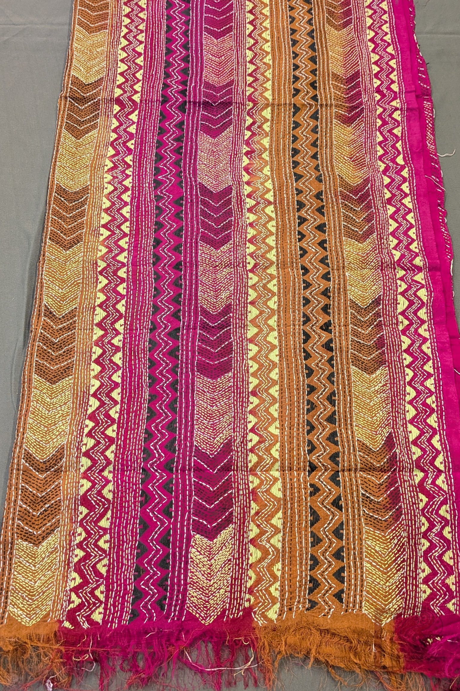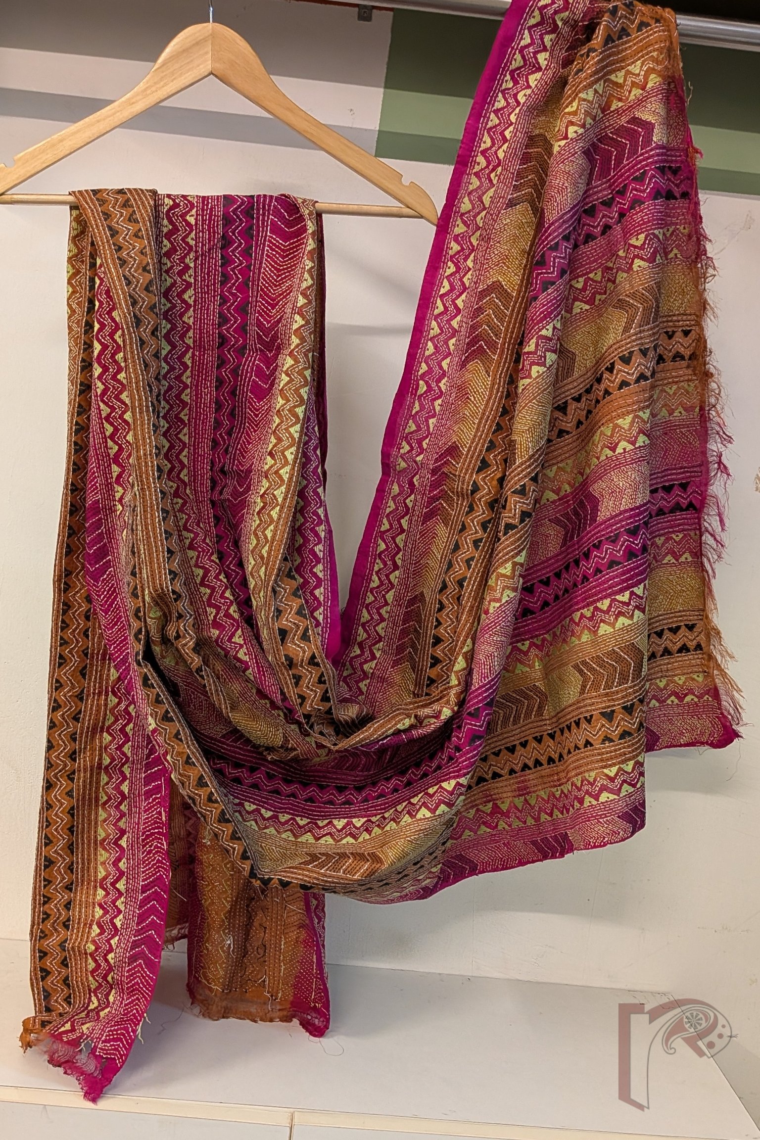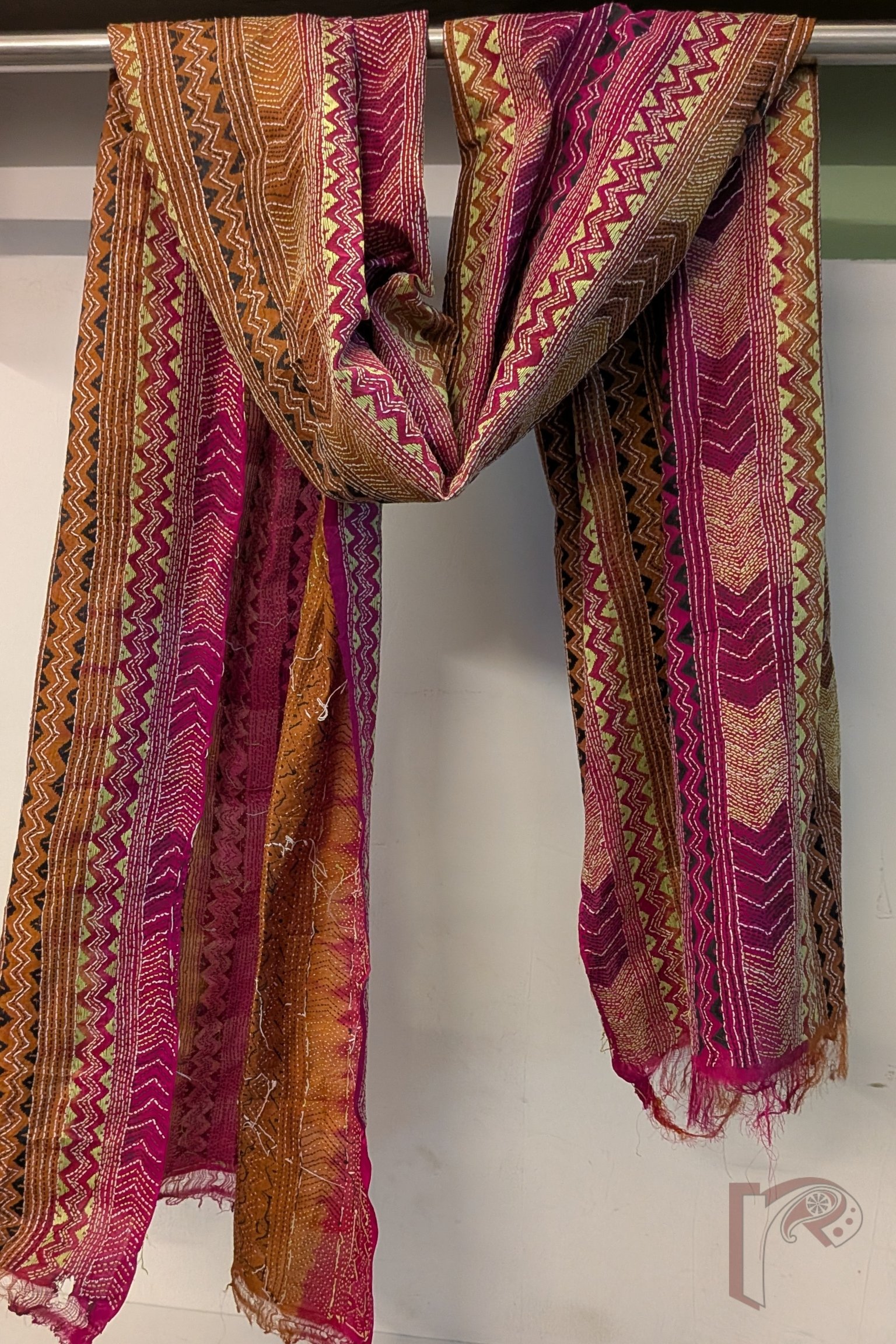 Dreamy Drapes – Brown Magenta Dual Tone Tussar Kantha Dupatta with Lime Green Zigzag and Triangle Patterns