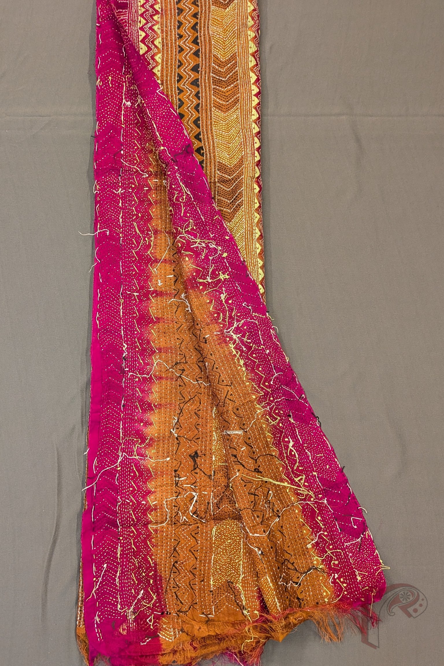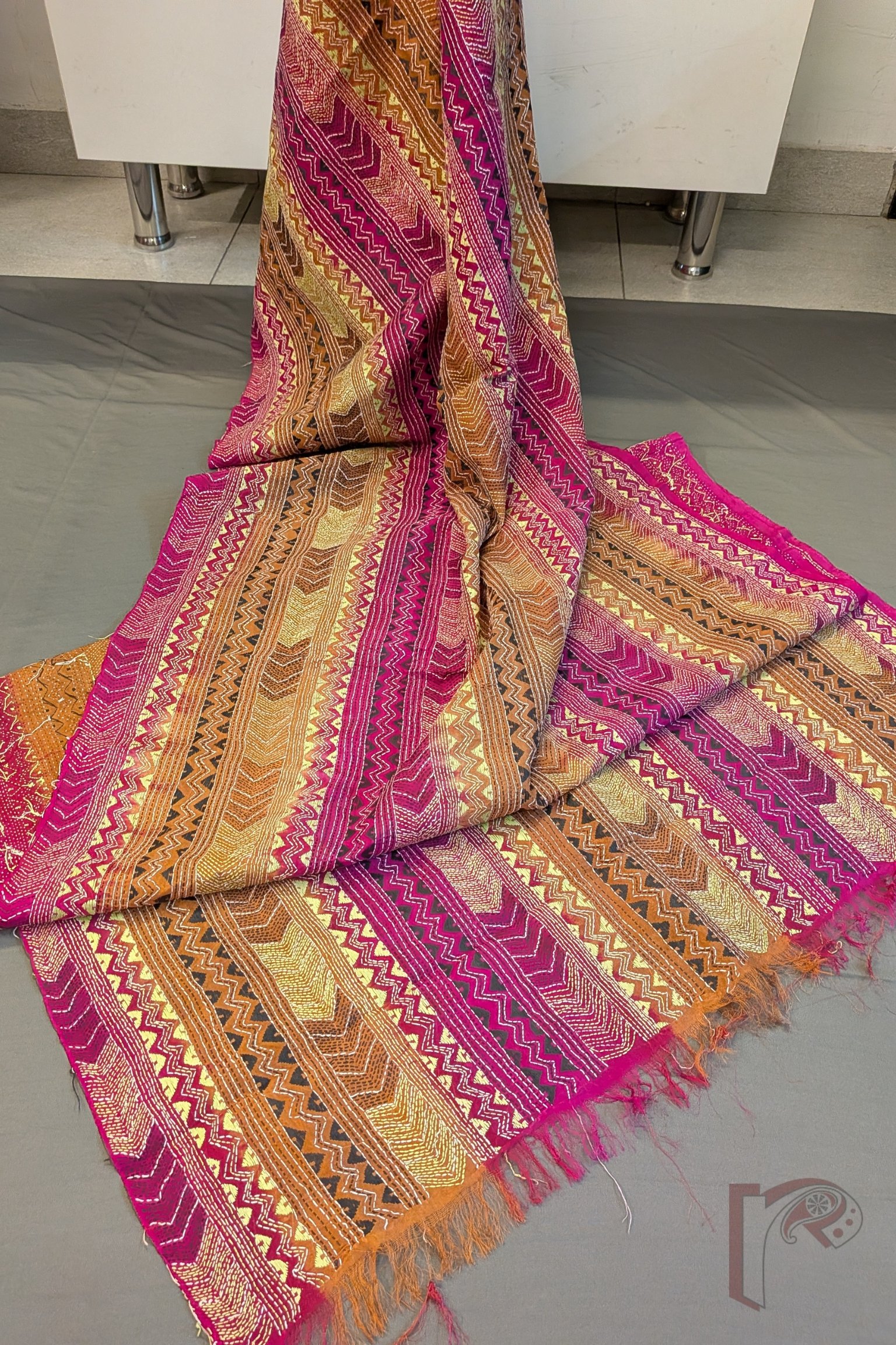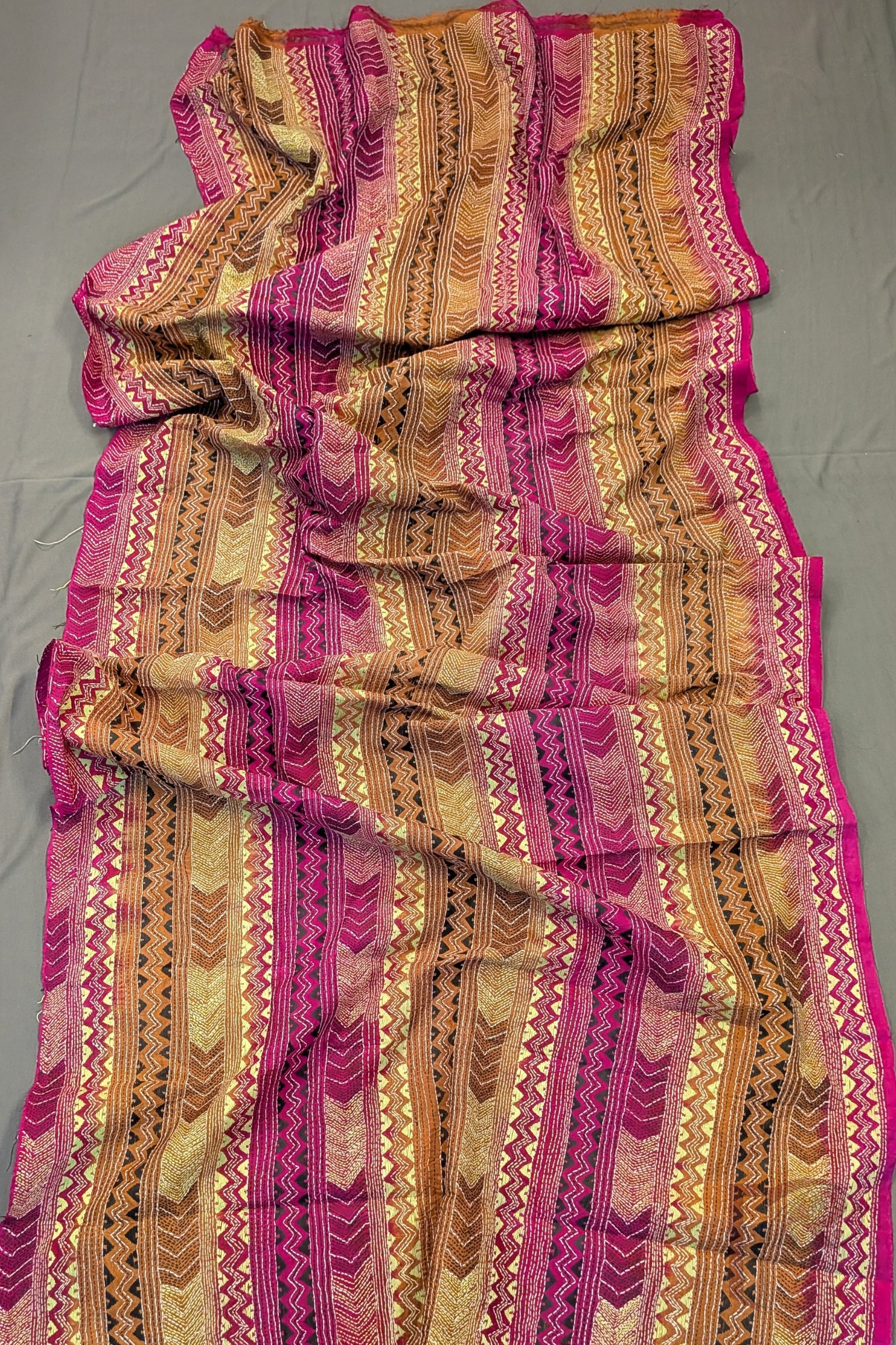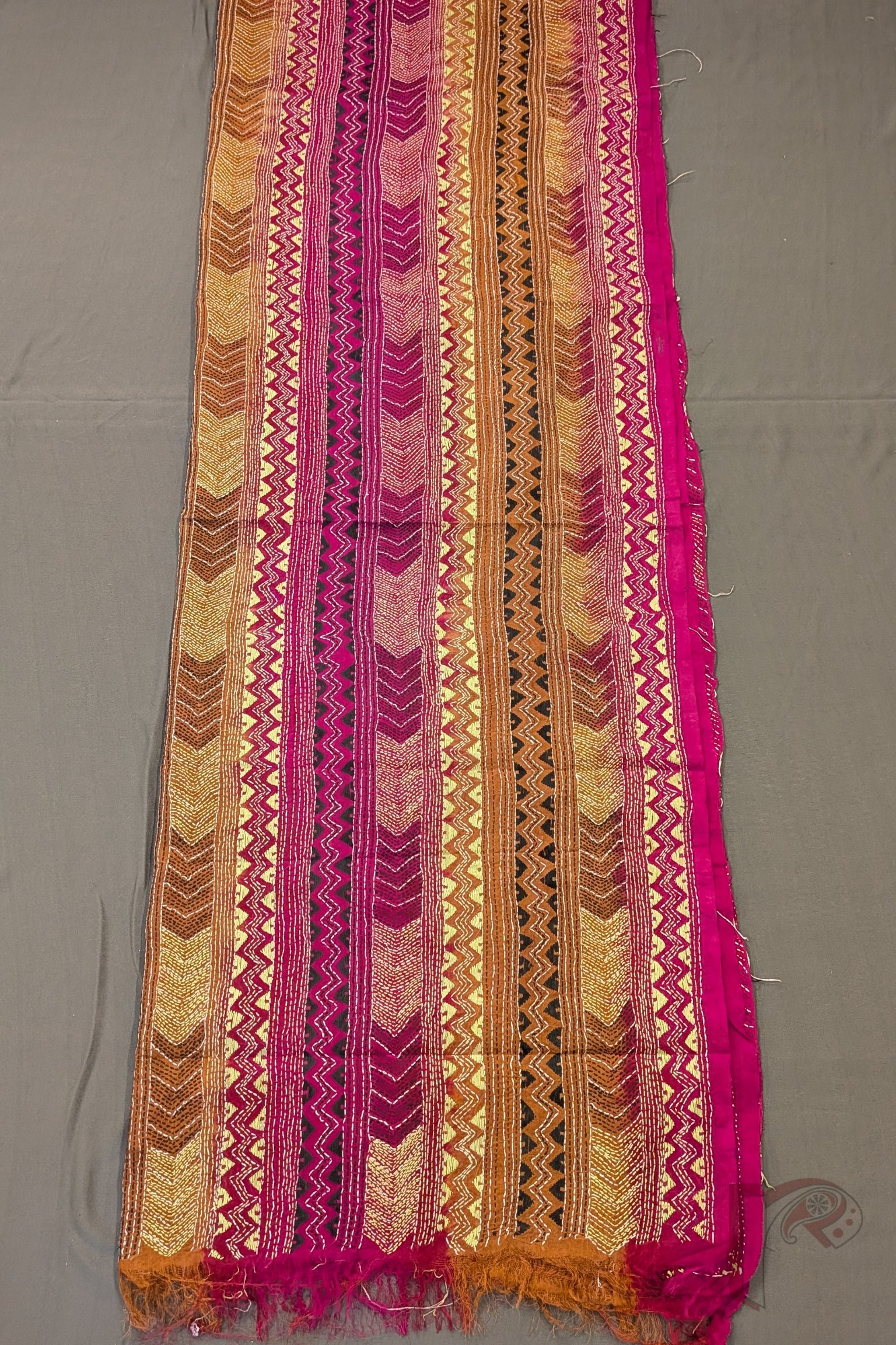 Dreamy Drapes – Brown Magenta Dual Tone Tussar Kantha Dupatta with Lime Green Zigzag and Triangle Patterns