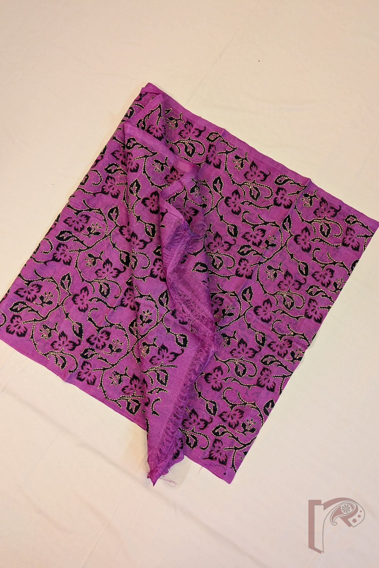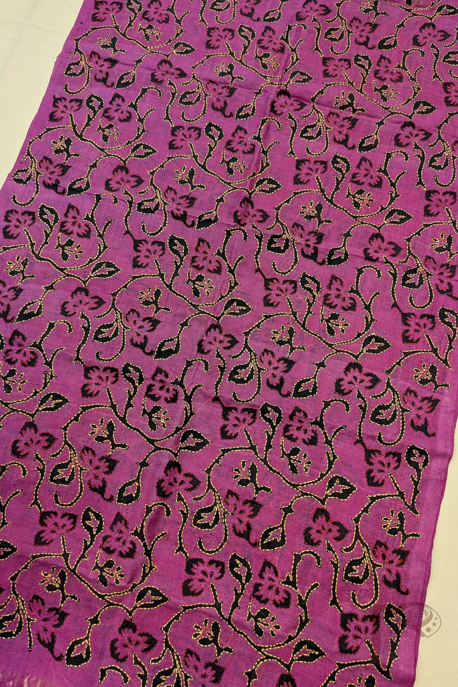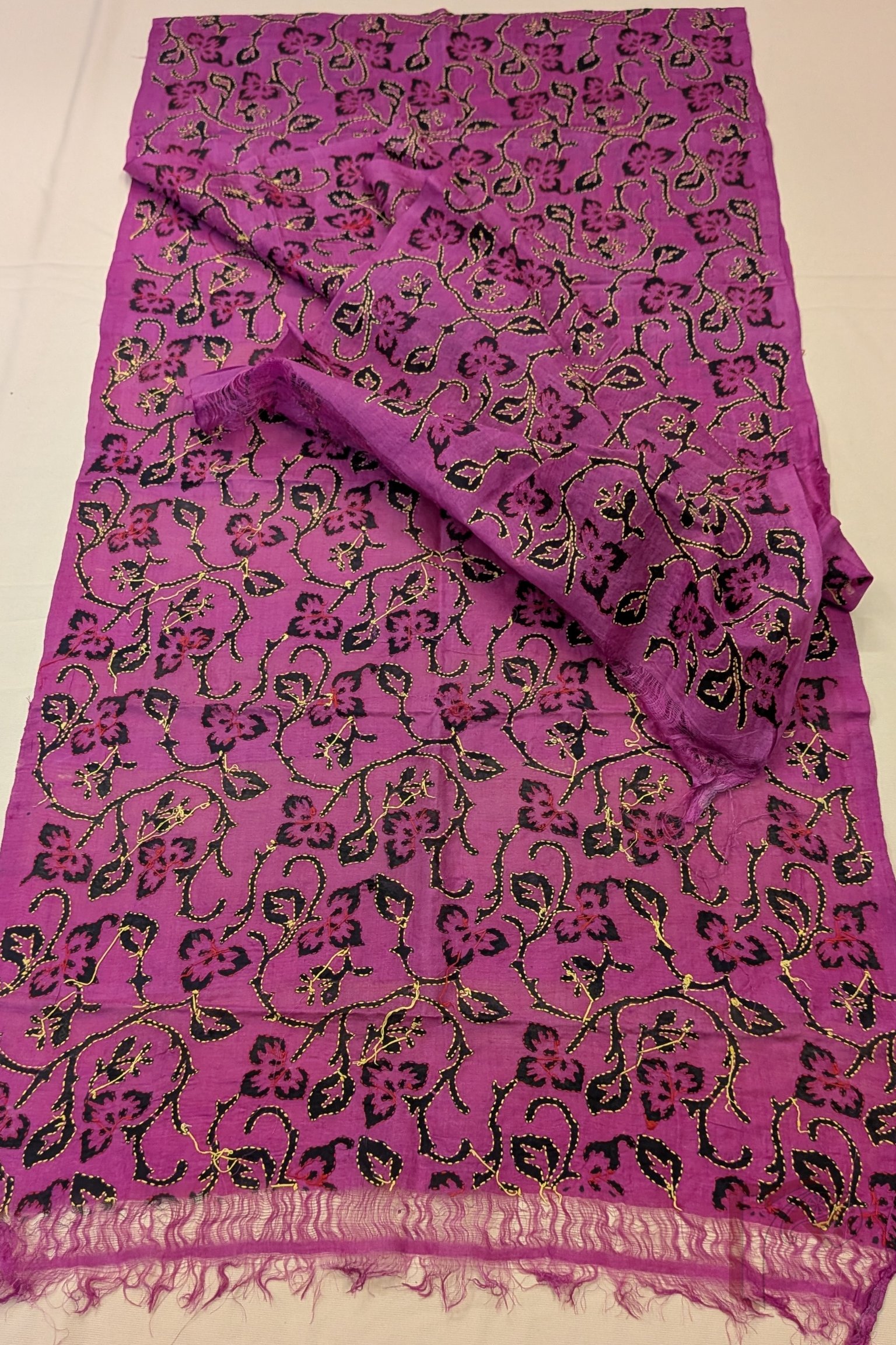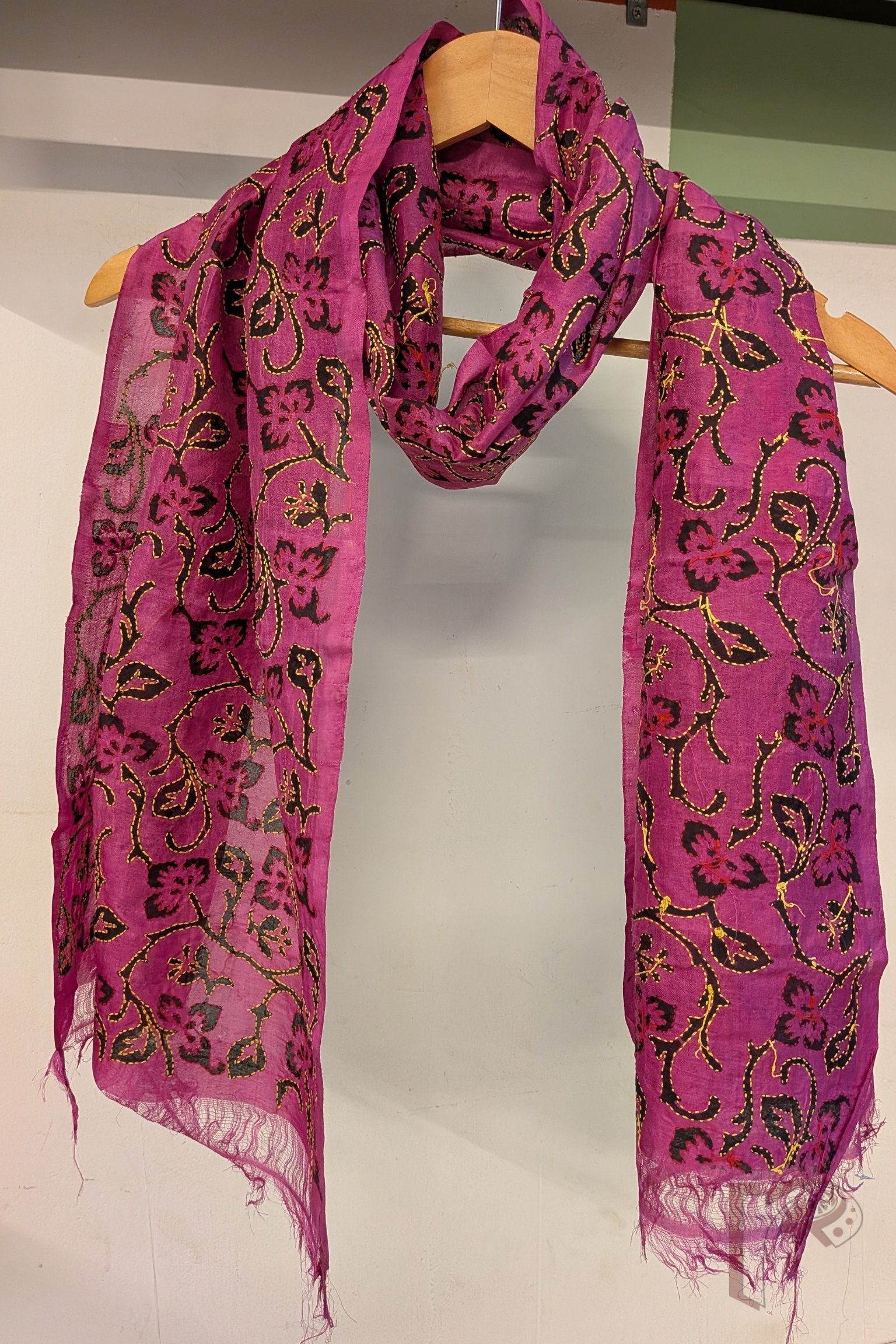This candy pink tussar silk stole showcases charming three-petal flower motifs paired with winding stems and leaves, hand printed in striking black. The motifs are brought alive with running Kantha stitch embroidery in vibrant yellow, creating a playful yet refined contrast. The natural texture of tussar silk adds depth while remaining lightweight and breathable, making it ideal for everyday elegance. Artistic and expressive, this stole beautifully balances bold detailing with delicate craftsmanship.