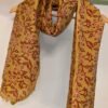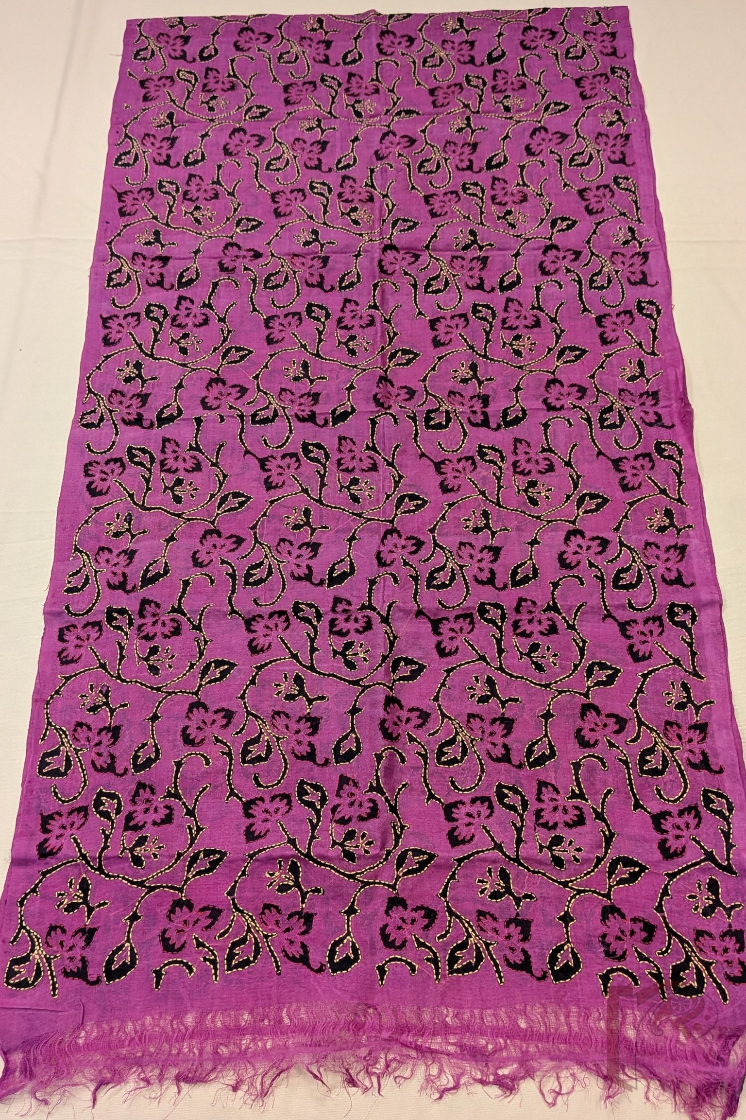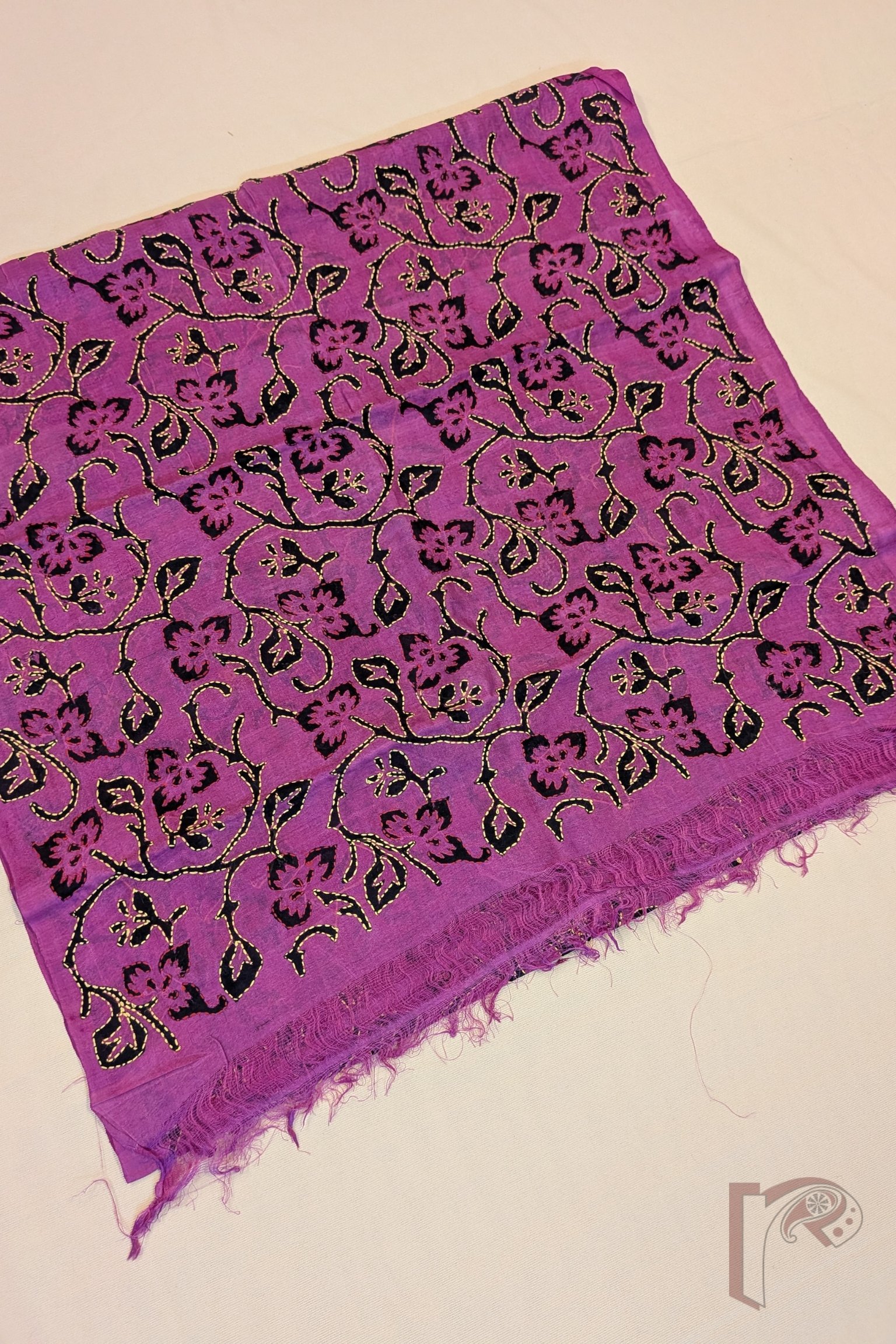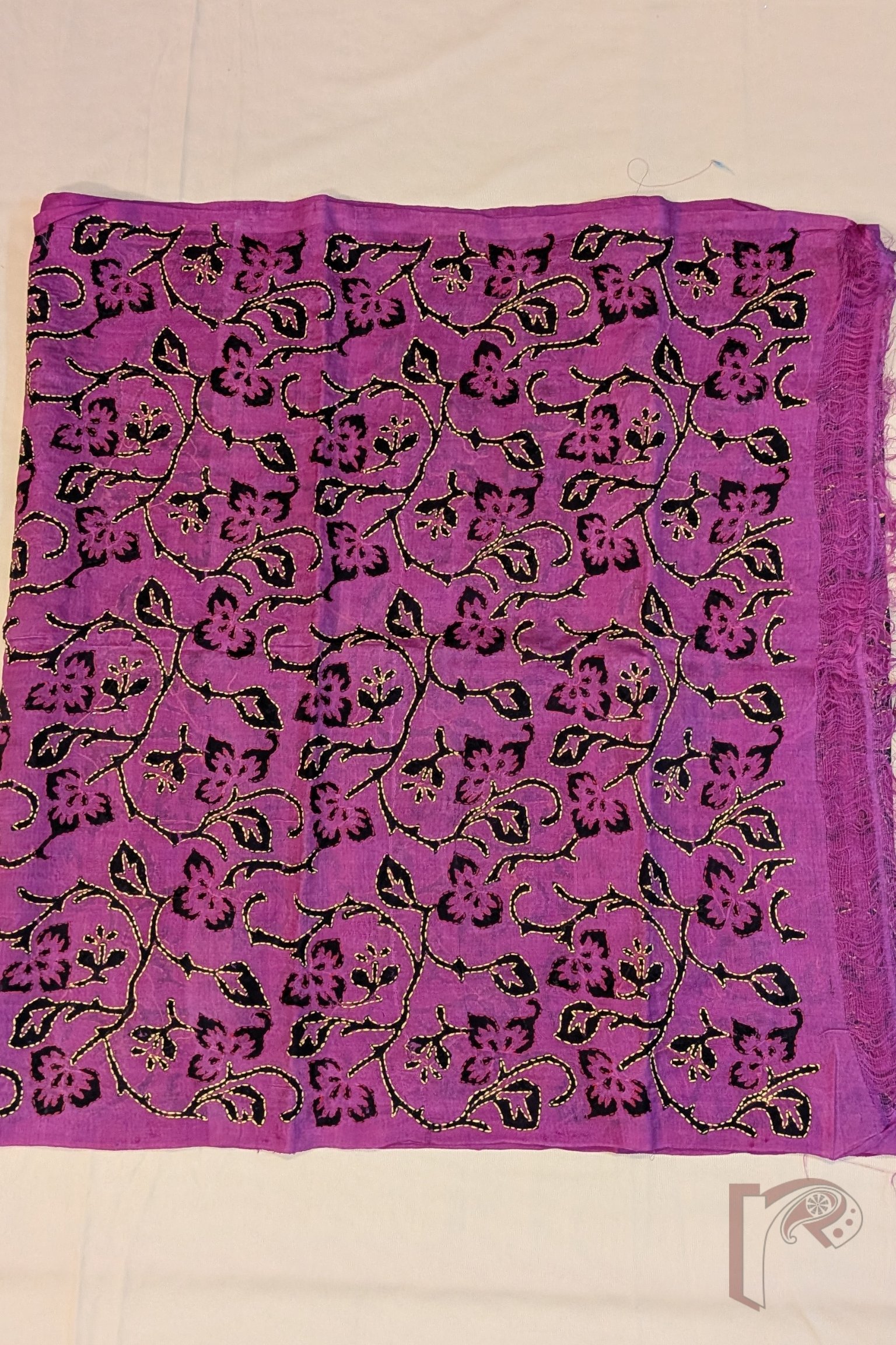 This candy pink tussar silk stole showcases charming three-petal flower motifs paired with winding stems and leaves, hand printed in striking black. The motifs are brought alive with running Kantha stitch embroidery in vibrant yellow, creating a playful yet refined contrast. The natural texture of tussar silk adds depth while remaining lightweight and breathable, making it ideal for everyday elegance. Artistic and expressive, this stole beautifully balances bold detailing with delicate craftsmanship.