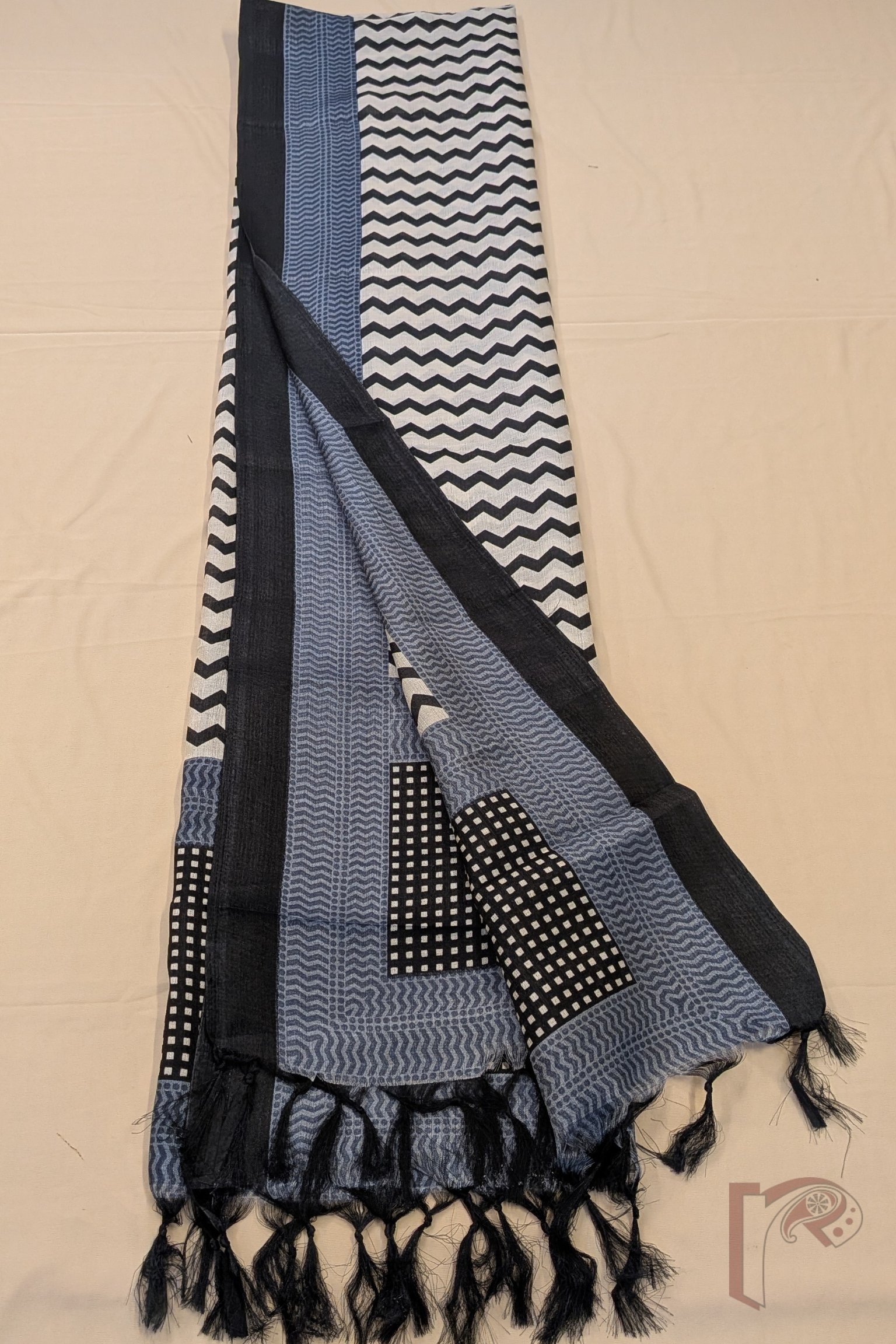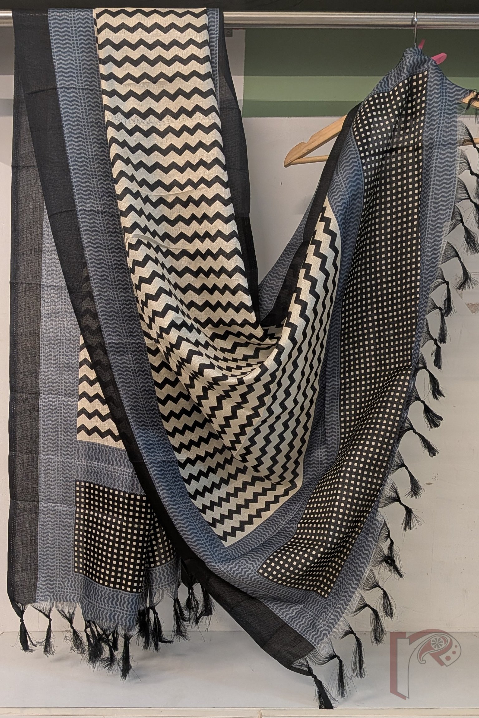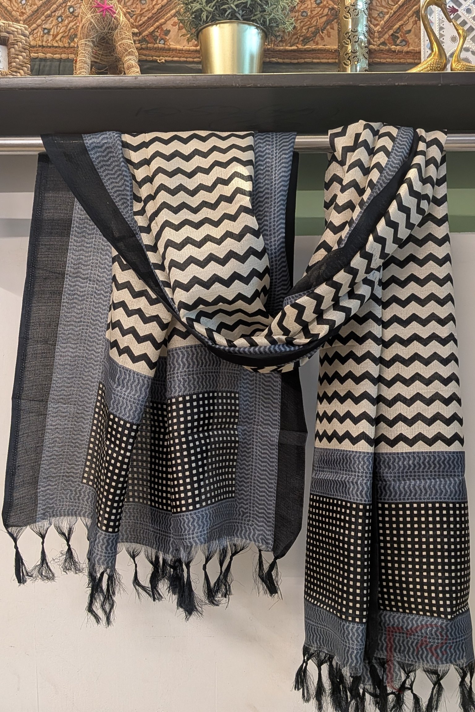 Gracefully minimal yet visually striking, this dupatta features a soft cream base adorned with spade-shaped leaf motifs arranged in a delicate dotted pattern in black, lending it a refined and contemporary charm. The design is beautifully framed with broad side borders showcasing dotted rectangular box patterns, each highlighted with a central spade leaf motif that adds structure and visual rhythm to the piece. All four sides are finished with a fine black border carrying intricate traditional motifs in white print, creating a subtle contrast that enhances the overall elegance. Crafted from breathable banana fiber fabric, the dupatta offers a lightweight feel, natural sheen, and a crisp yet graceful drape, making it an ideal accessory for both everyday sophistication and understated festive styling.