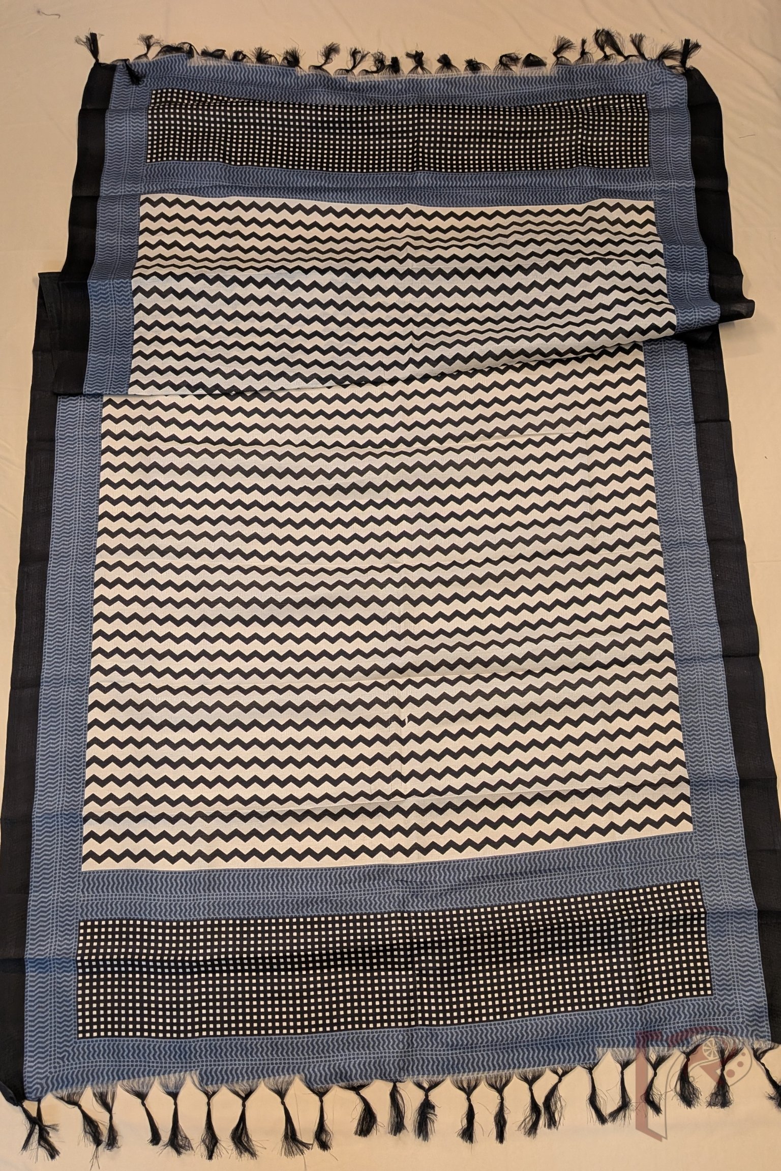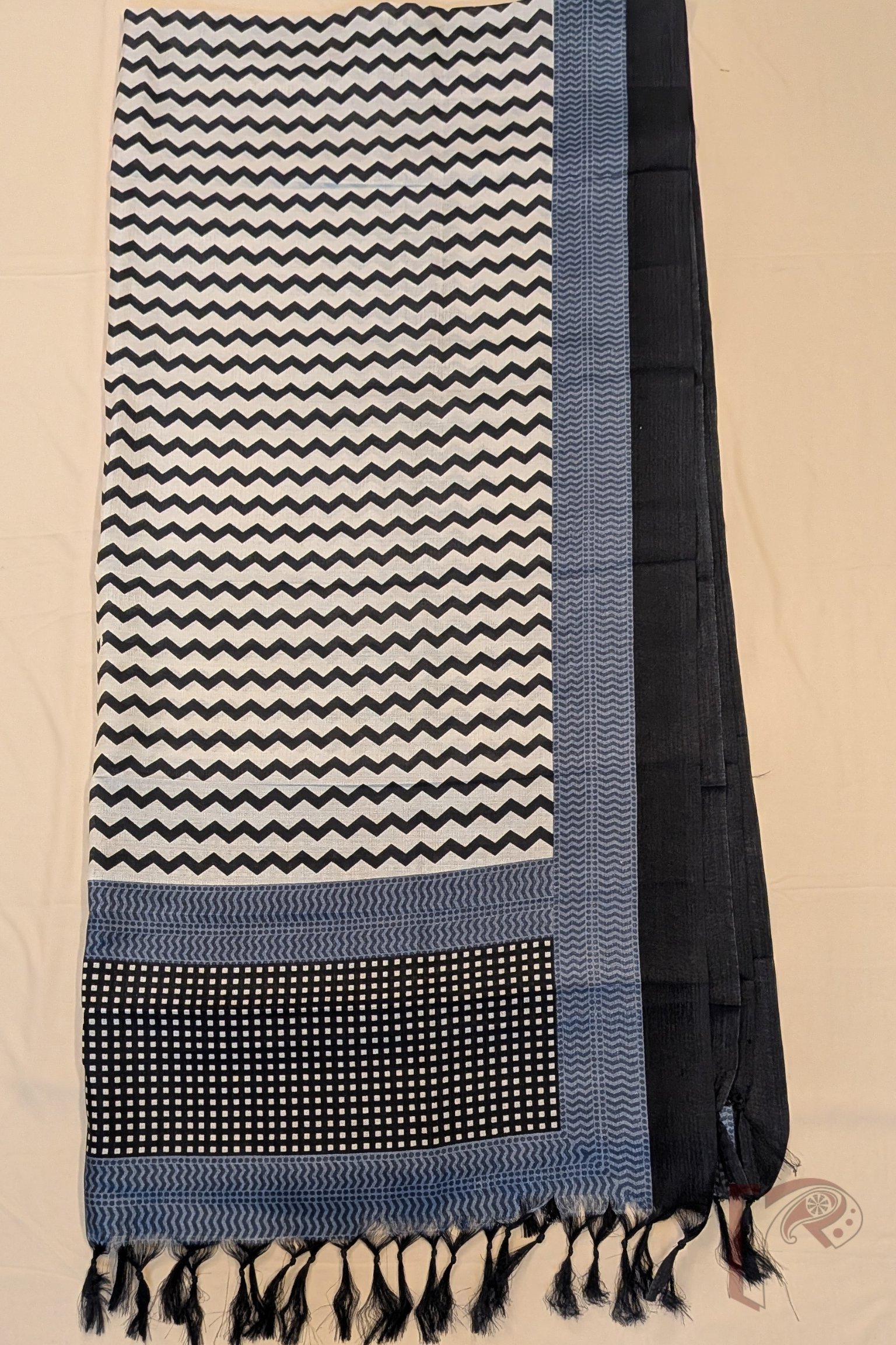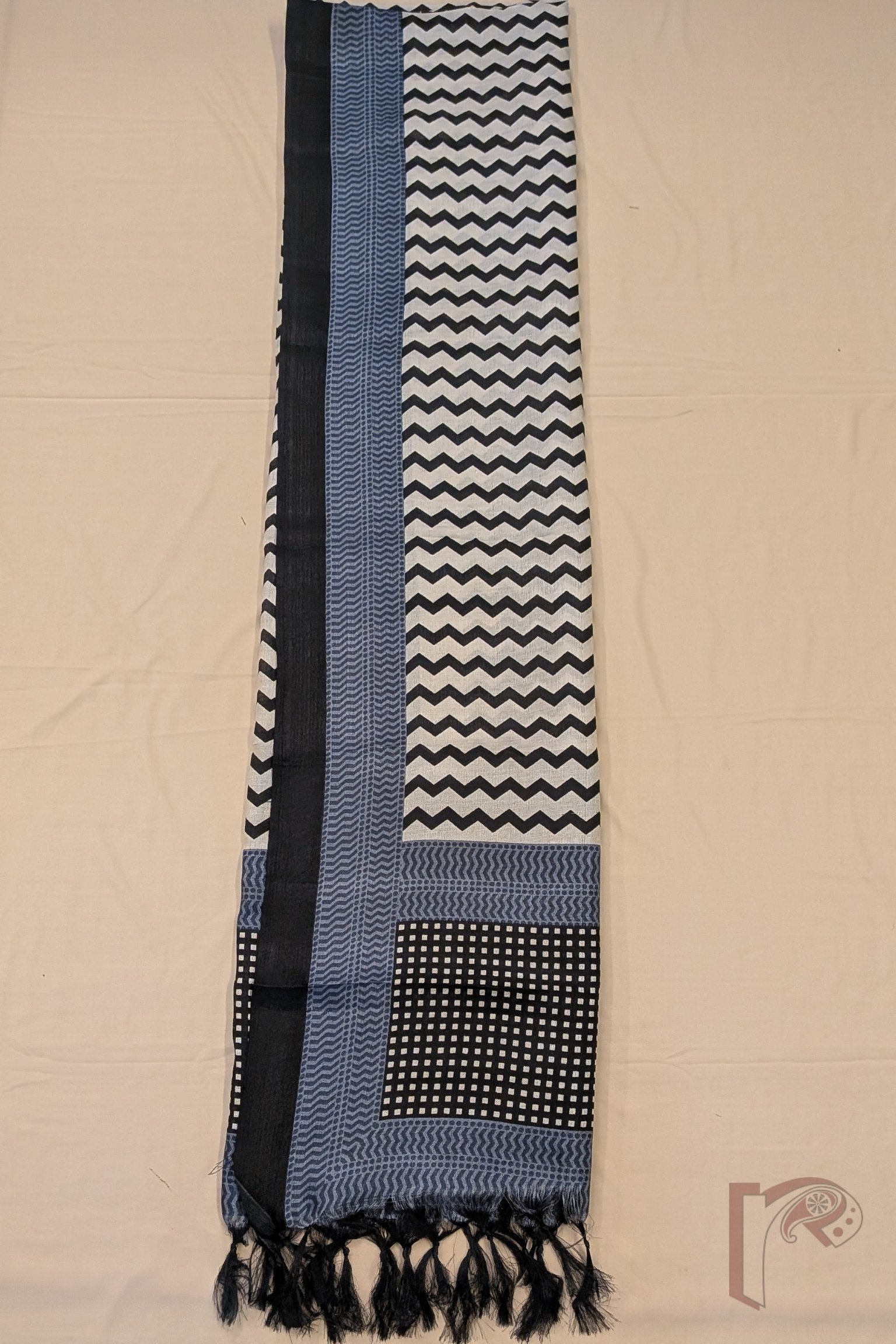 Gracefully minimal yet visually striking, this dupatta features a soft cream base adorned with spade-shaped leaf motifs arranged in a delicate dotted pattern in black, lending it a refined and contemporary charm. The design is beautifully framed with broad side borders showcasing dotted rectangular box patterns, each highlighted with a central spade leaf motif that adds structure and visual rhythm to the piece. All four sides are finished with a fine black border carrying intricate traditional motifs in white print, creating a subtle contrast that enhances the overall elegance. Crafted from breathable banana fiber fabric, the dupatta offers a lightweight feel, natural sheen, and a crisp yet graceful drape, making it an ideal accessory for both everyday sophistication and understated festive styling.