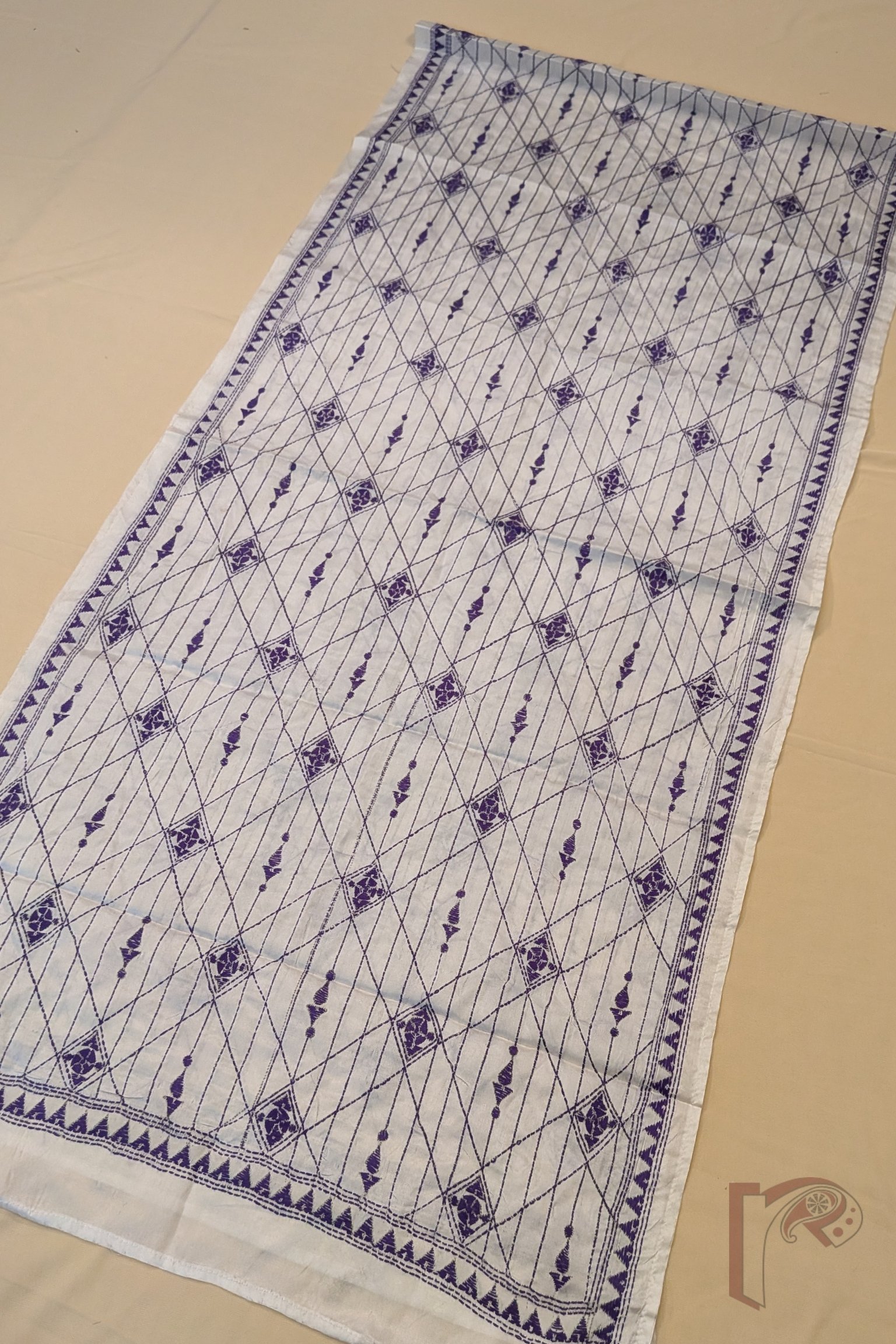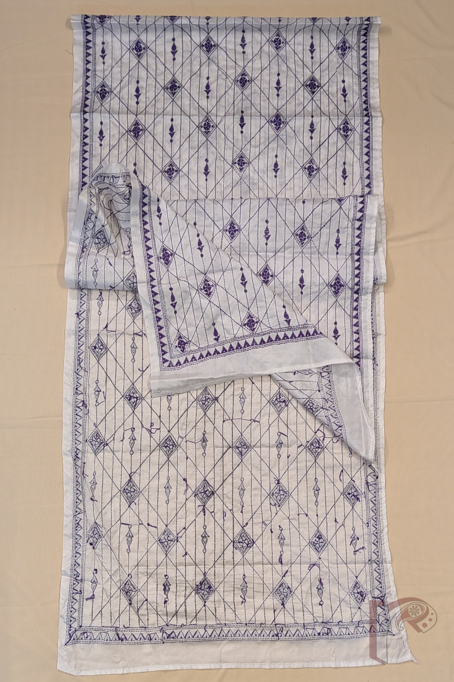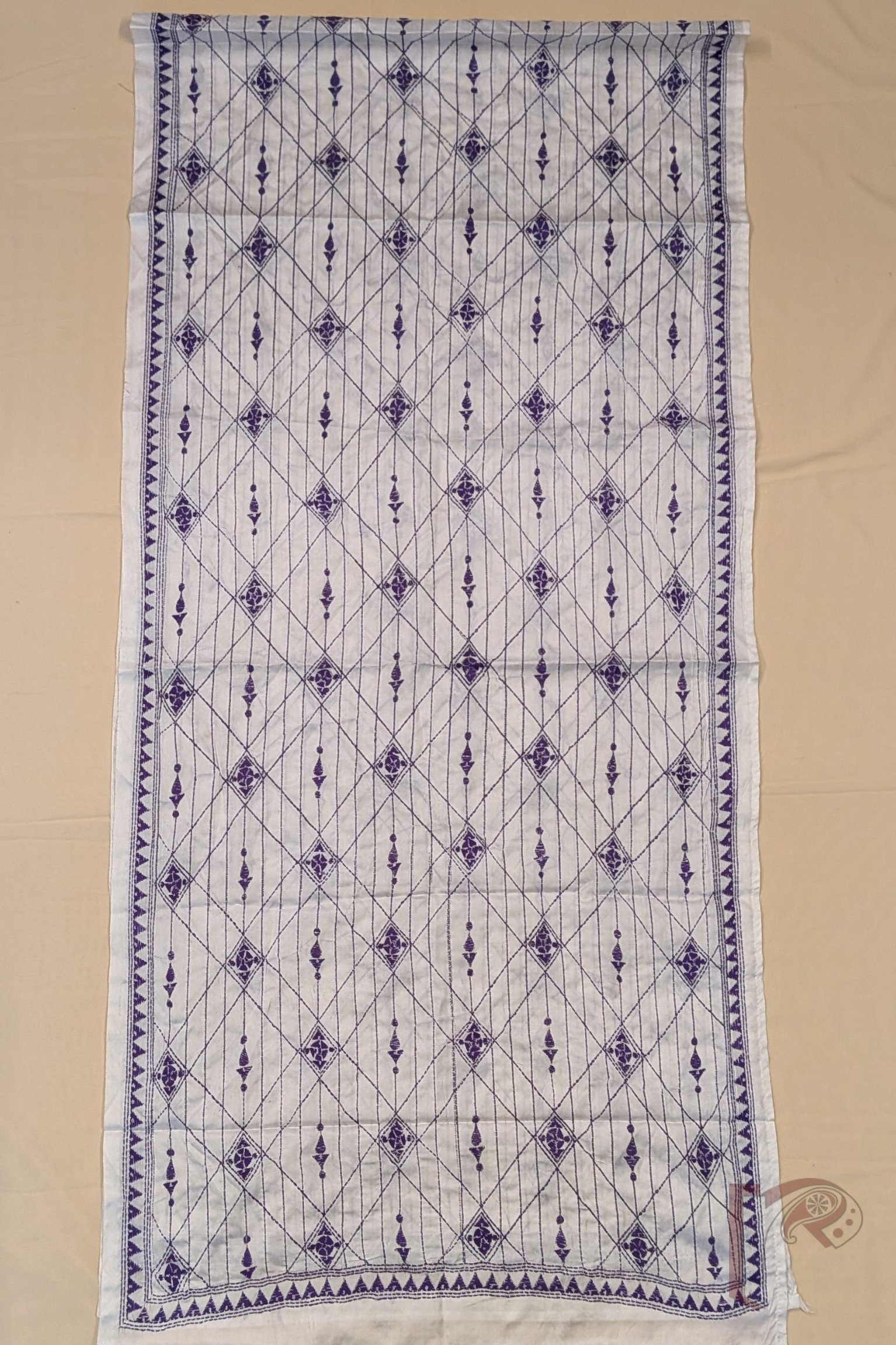 Dreamy Drapes – Cream Blended Silk Kantha Stole with Purple Geometric Lines and Diamond Patterns