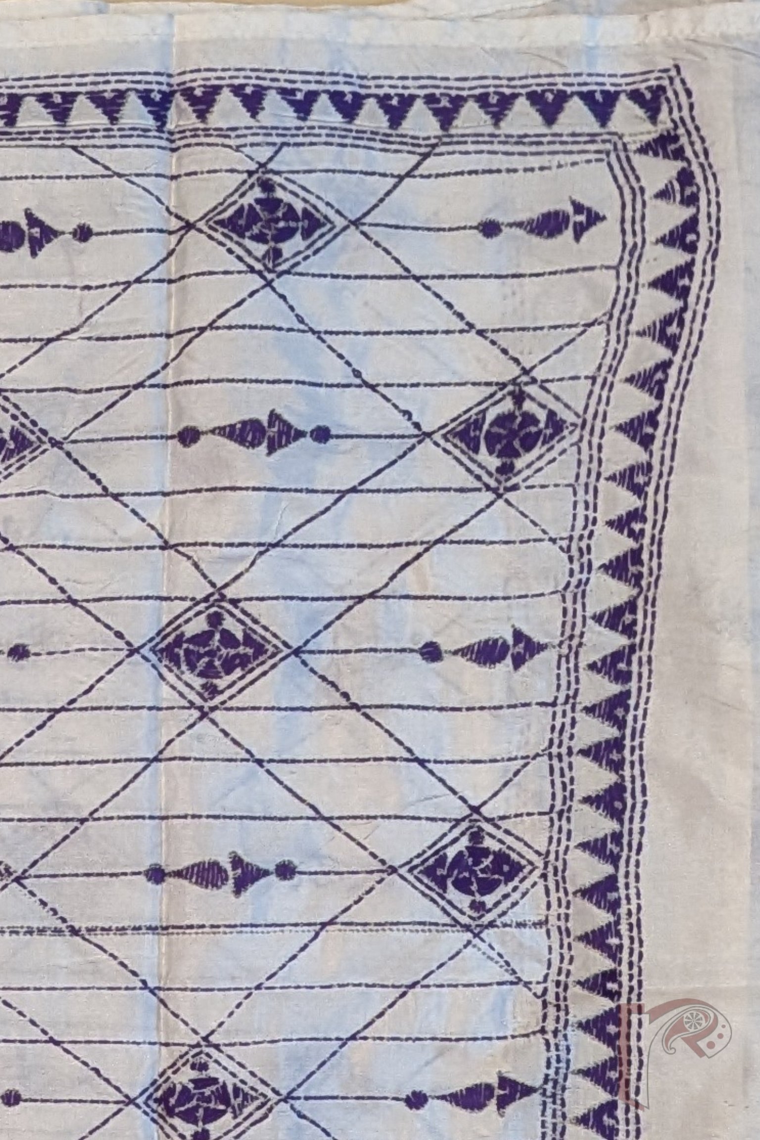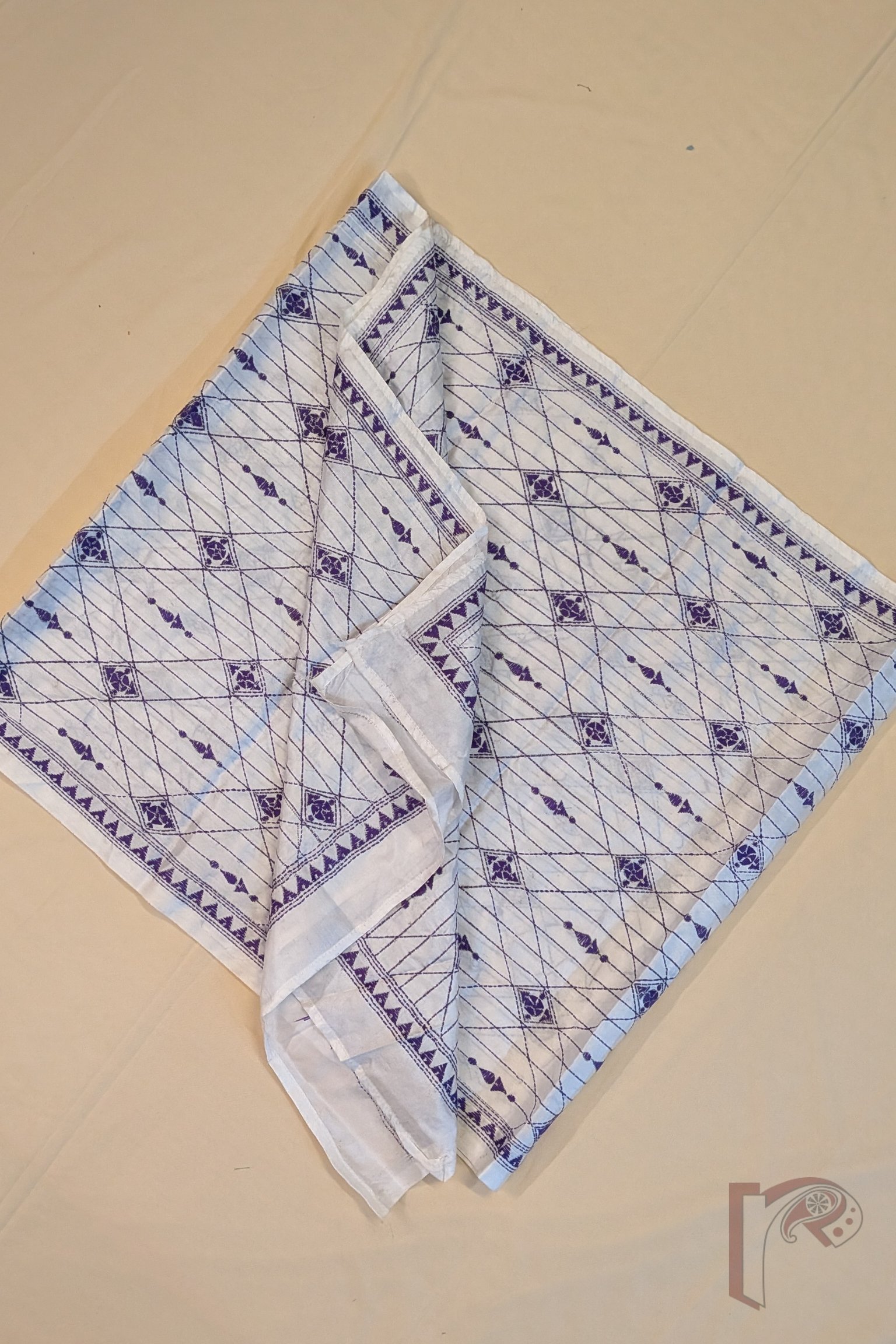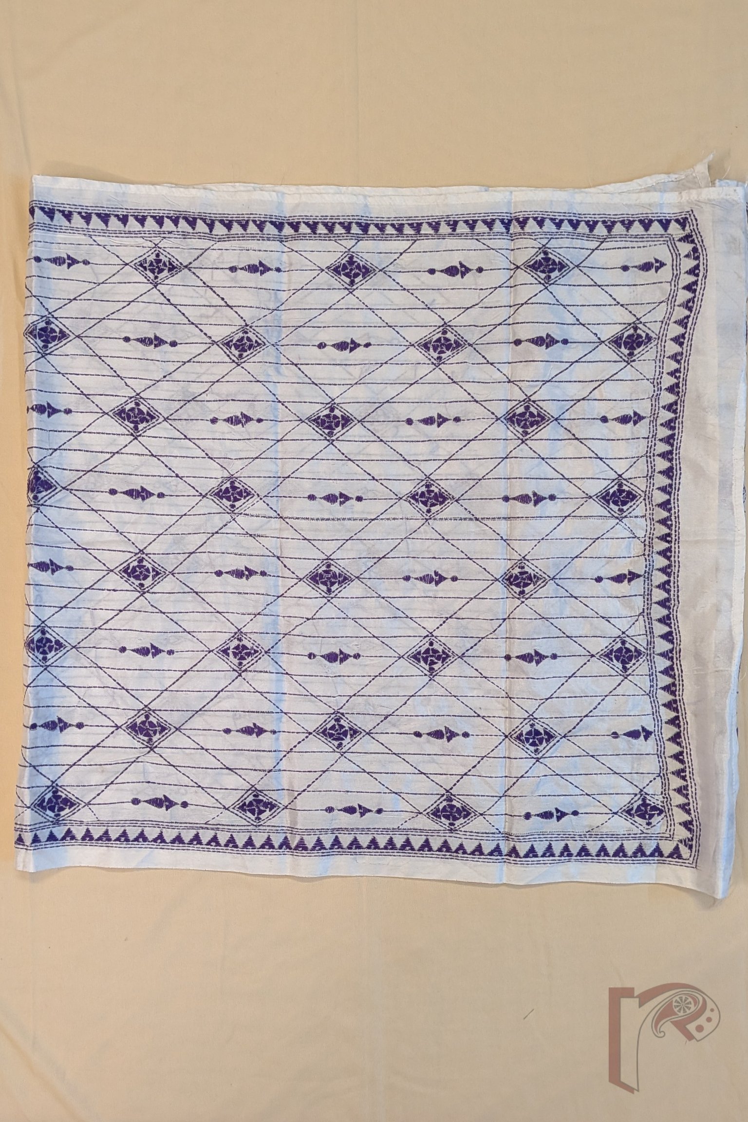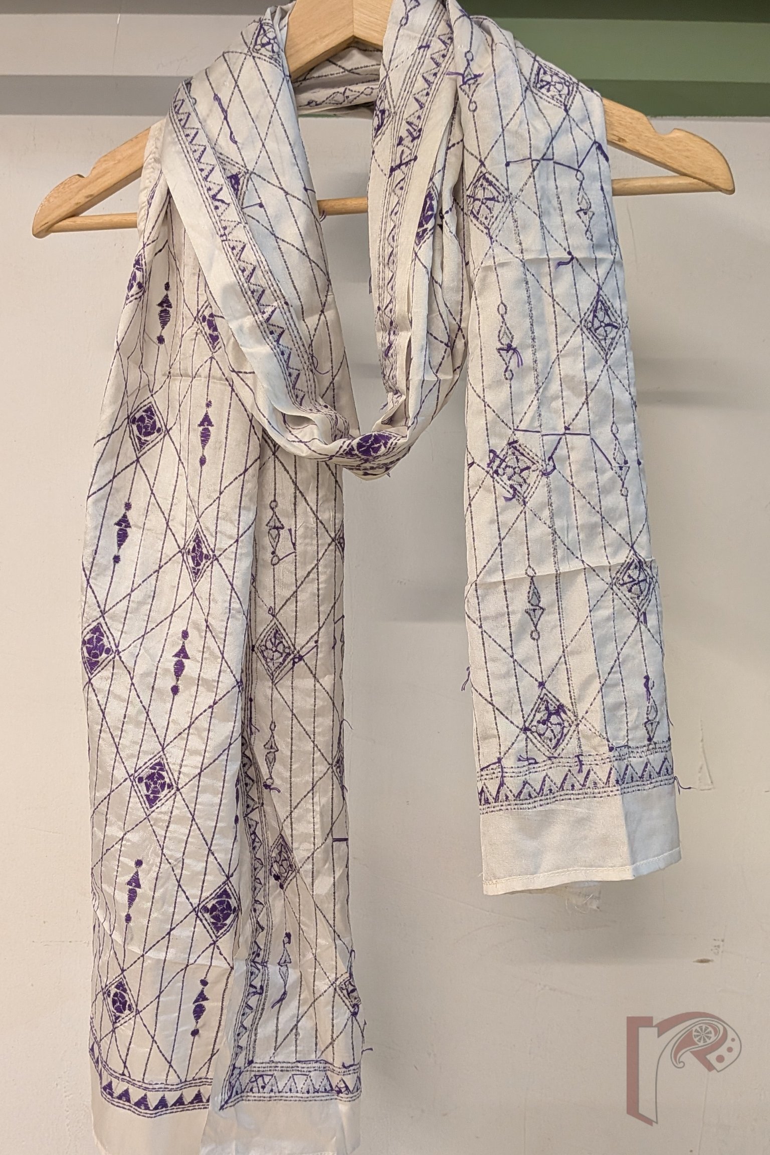 Dreamy Drapes – Cream Blended Silk Kantha Stole with Purple Geometric Lines and Diamond Patterns