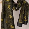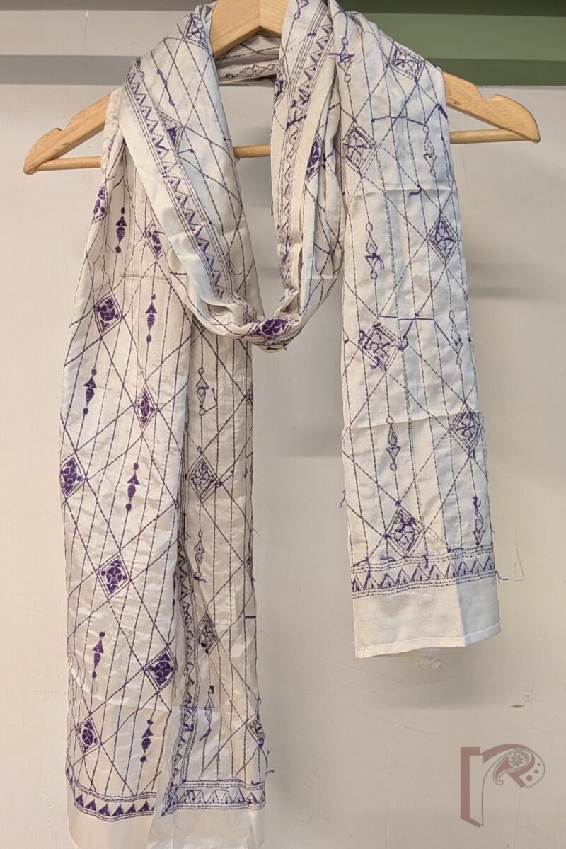 This elegant cream blended silk stole is adorned with a sophisticated geometric pattern created entirely with purple Kantha stitch lines. The design features structured linear arrangements, with several lines crisscrossing diagonally to form subtle diamond shapes across the surface. The clean contrast between the cream base and purple thread gives the stole a refined and contemporary aesthetic. Crafted in smooth blended silk, it offers a soft feel, graceful fall, and breathable comfort, making it ideal for effortless styling. The interplay of lines and geometric rhythm highlights the beauty of minimalist design combined with traditional Kantha craftsmanship.