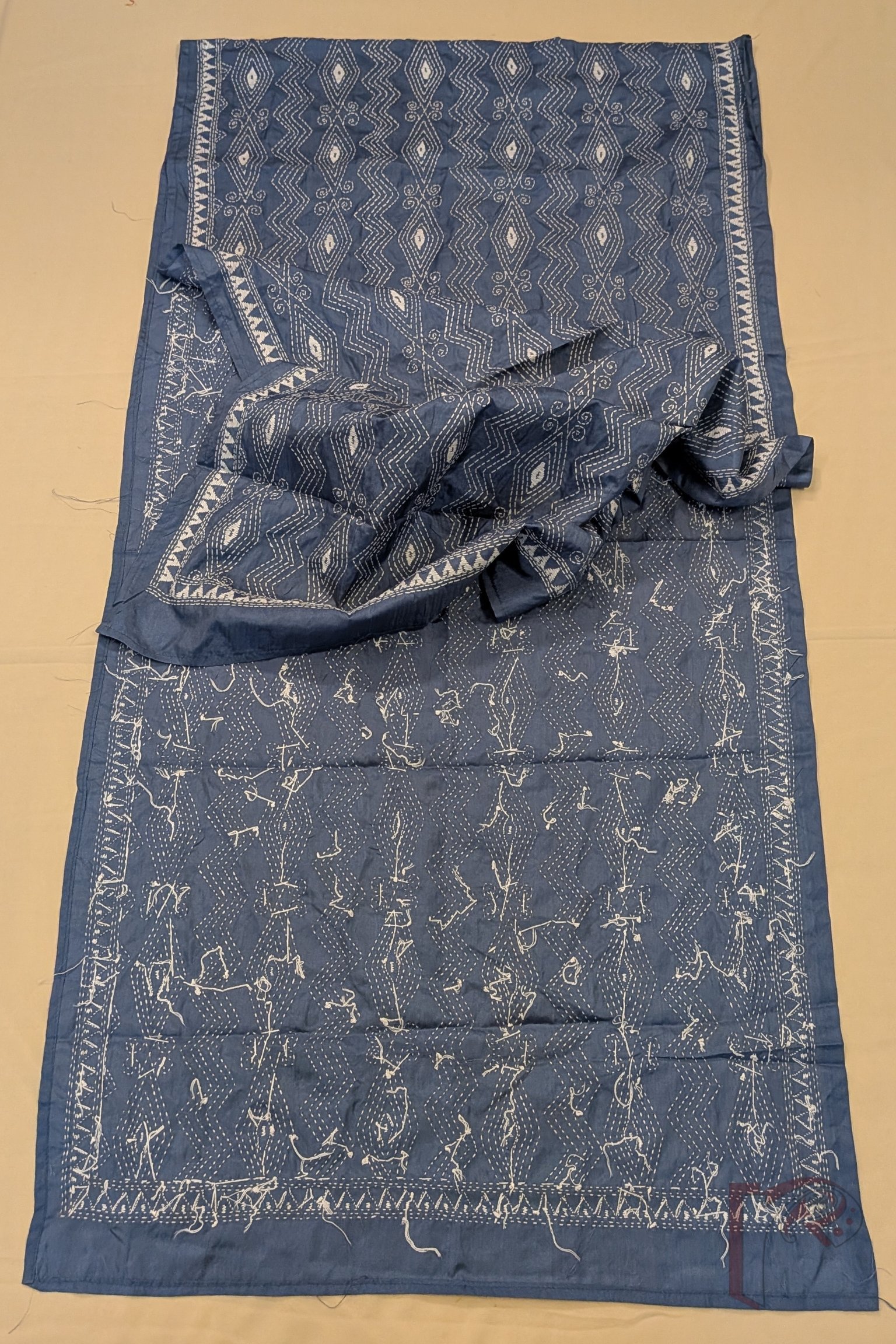 Dreamy Drapes – Grey Blended Silk Kantha Stole with White Zigzag and Diamond Geometric Embroidery