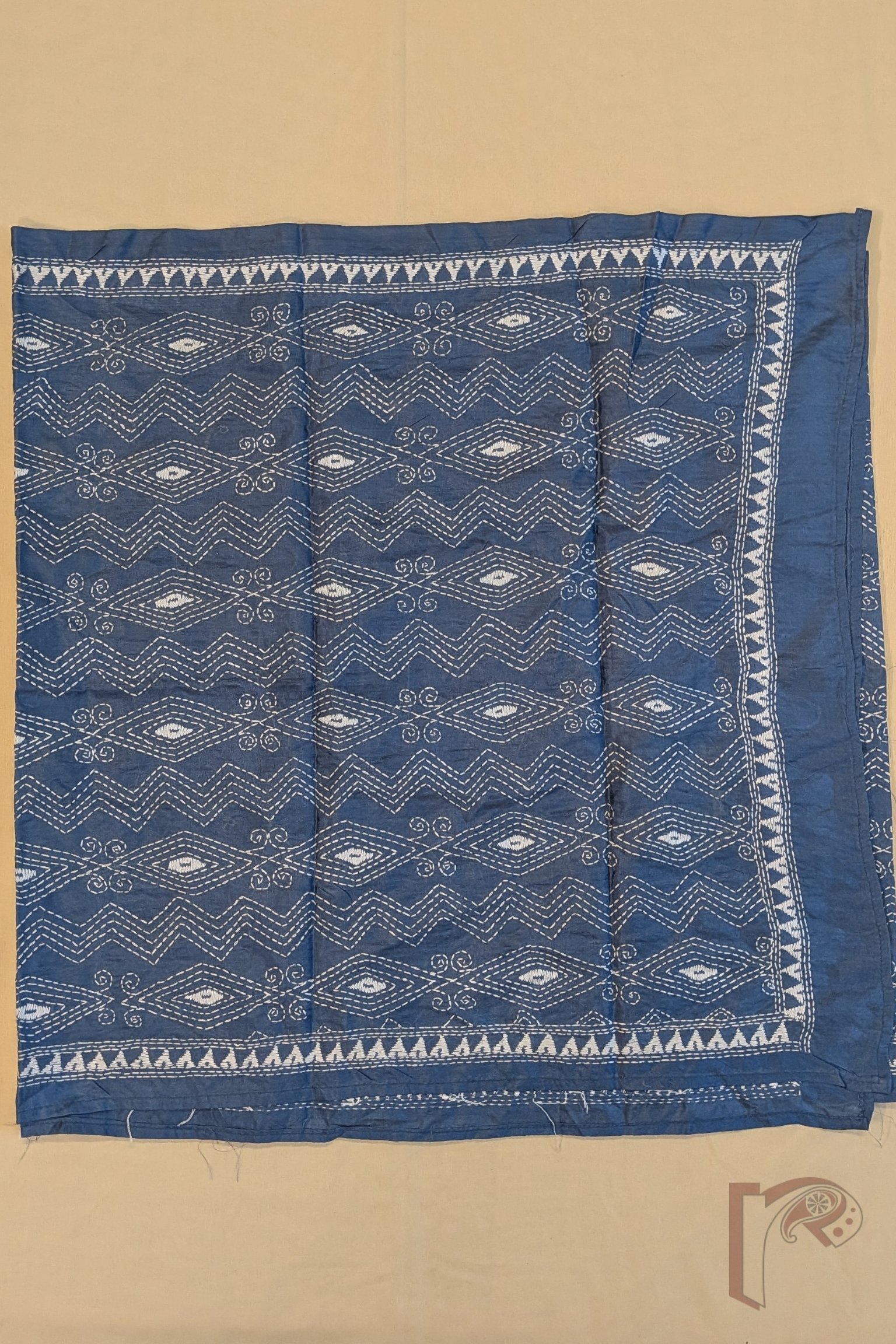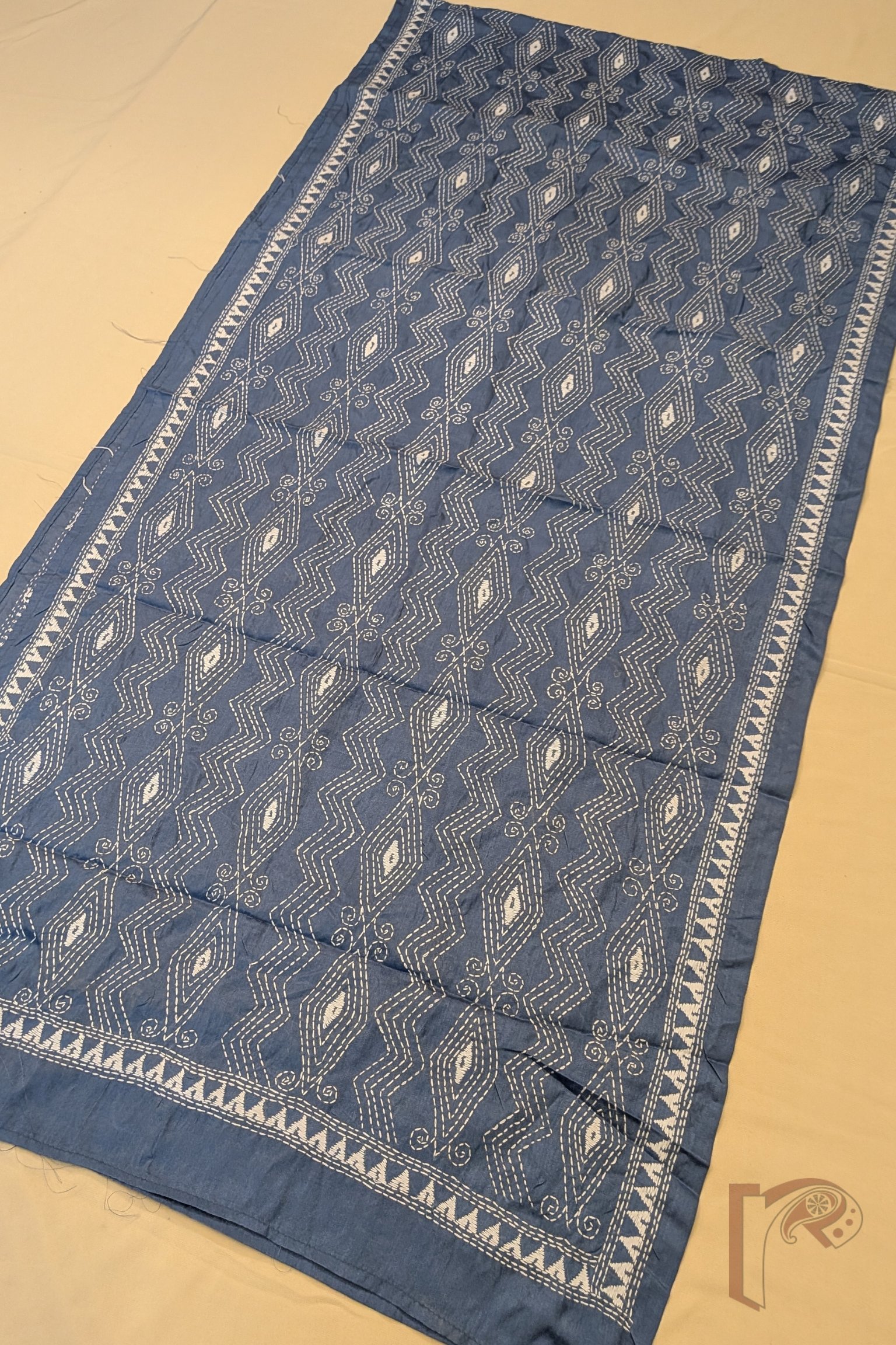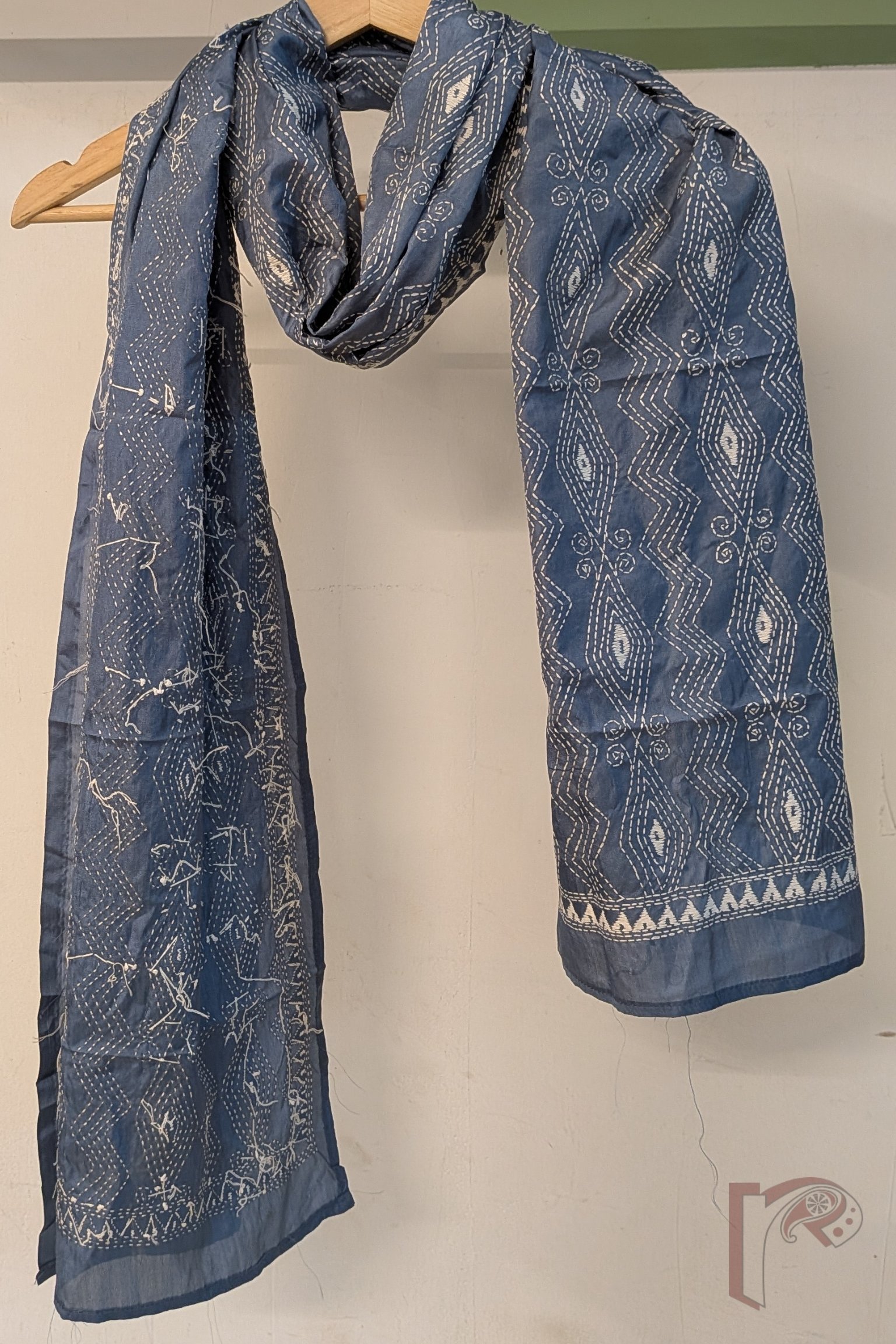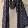This smart grey blended silk stole showcases a refined geometric pattern of zigzag lines combined with horizontal diamond formations, all delicately embroidered in white Kantha stitches. The structured arrangement of the motifs creates a rhythmic and balanced design across the surface. A subtle white embroidered border along the sides frames the composition beautifully, enhancing its elegance. The blended silk fabric offers a smooth texture, breathable quality, and graceful drape, ensuring both comfort and style. With its understated colour palette and crisp geometric detailing, this stole reflects modern sophistication rooted in traditional embroidery techniques.