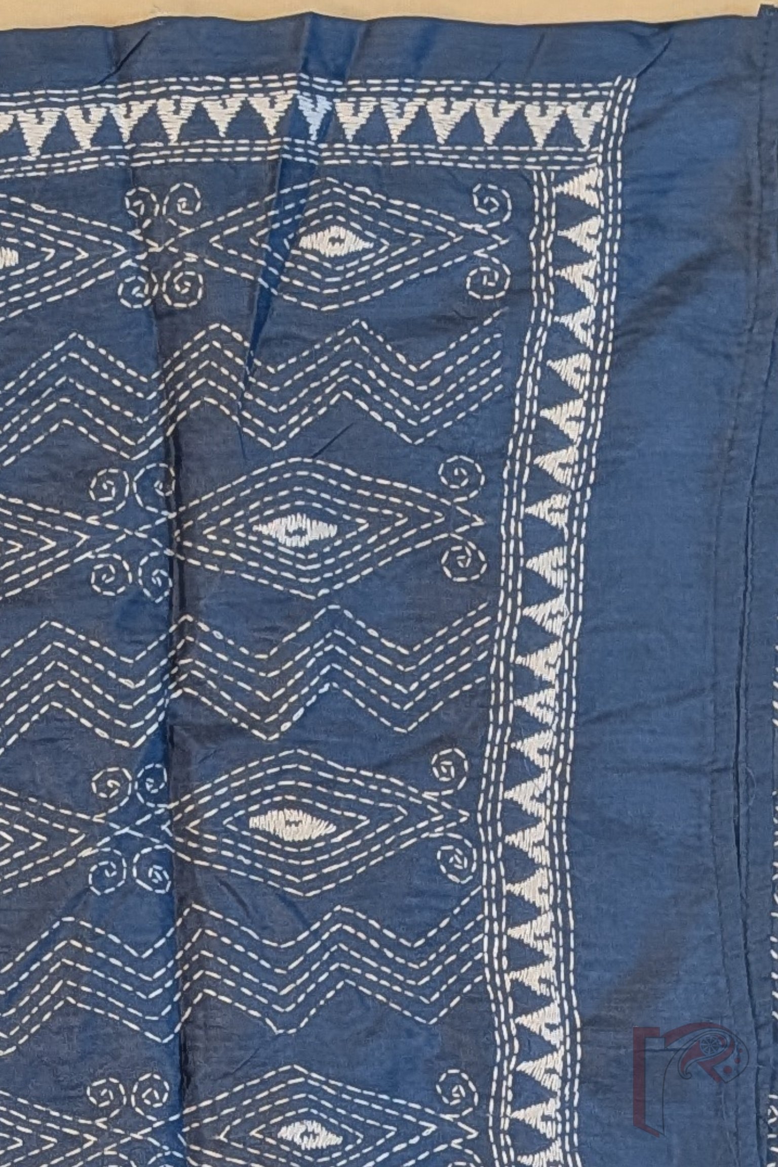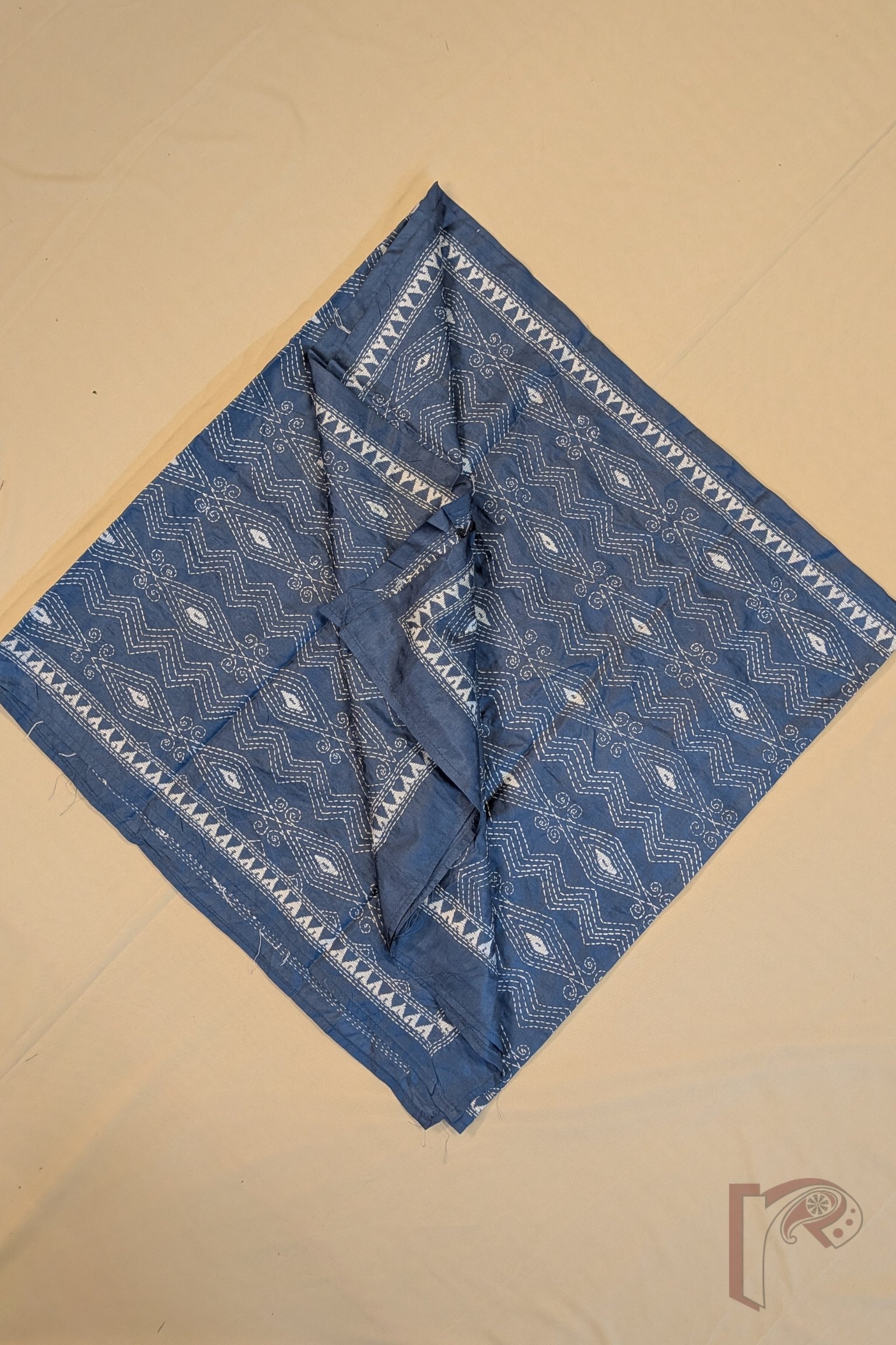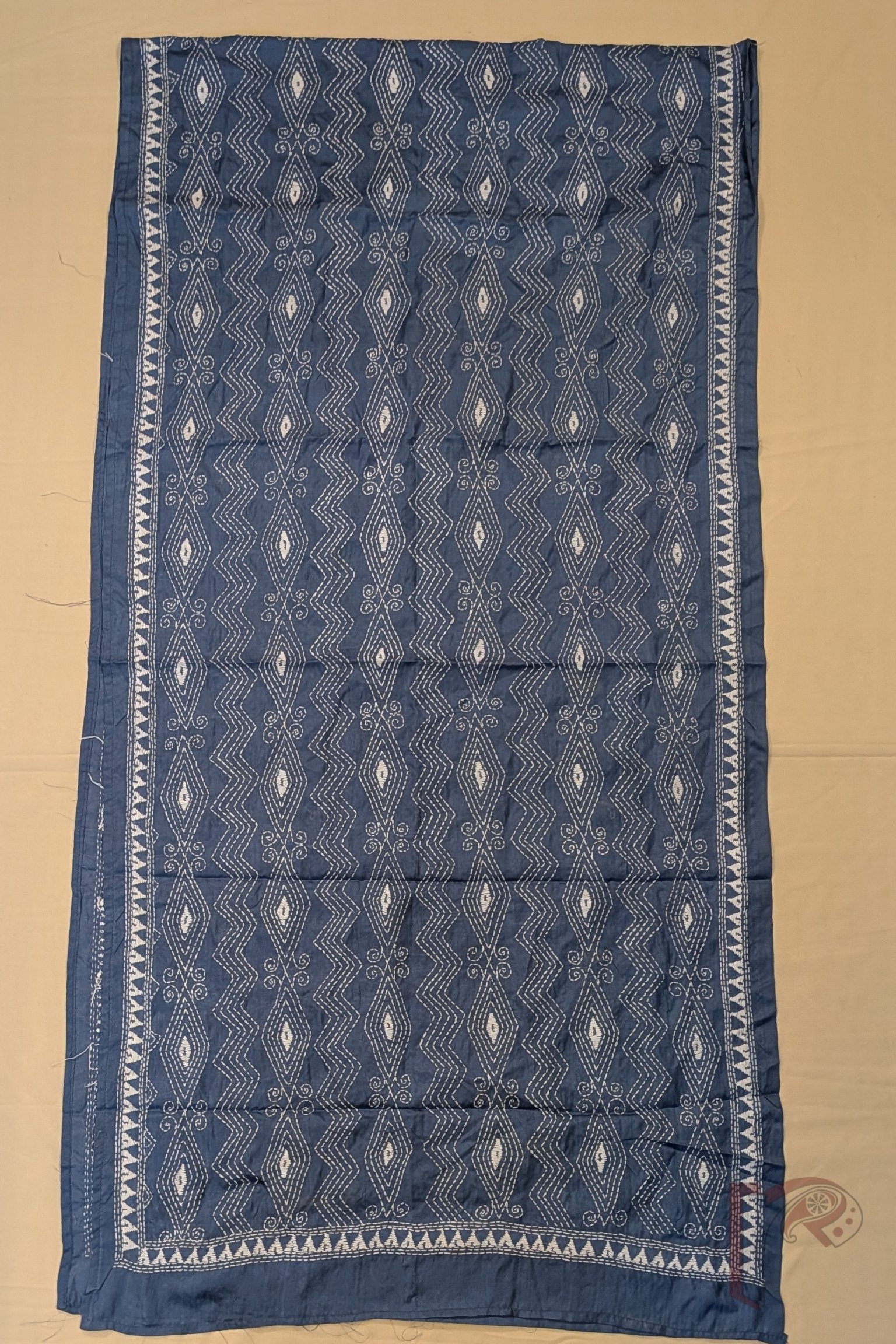 This smart grey blended silk stole showcases a refined geometric pattern of zigzag lines combined with horizontal diamond formations, all delicately embroidered in white Kantha stitches. The structured arrangement of the motifs creates a rhythmic and balanced design across the surface. A subtle white embroidered border along the sides frames the composition beautifully, enhancing its elegance. The blended silk fabric offers a smooth texture, breathable quality, and graceful drape, ensuring both comfort and style. With its understated colour palette and crisp geometric detailing, this stole reflects modern sophistication rooted in traditional embroidery techniques.