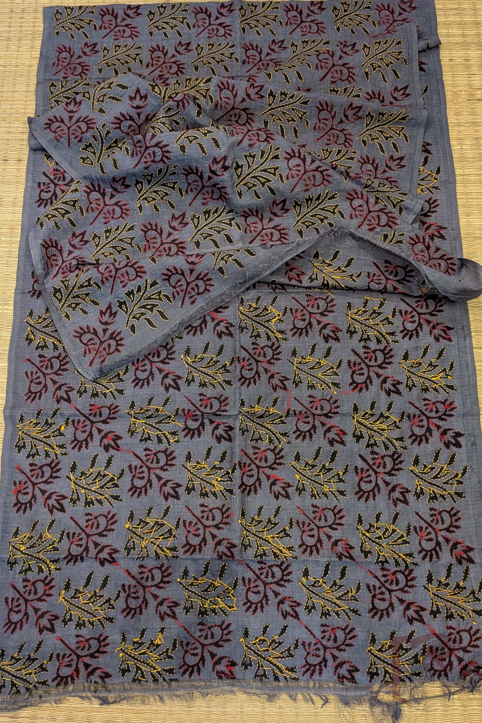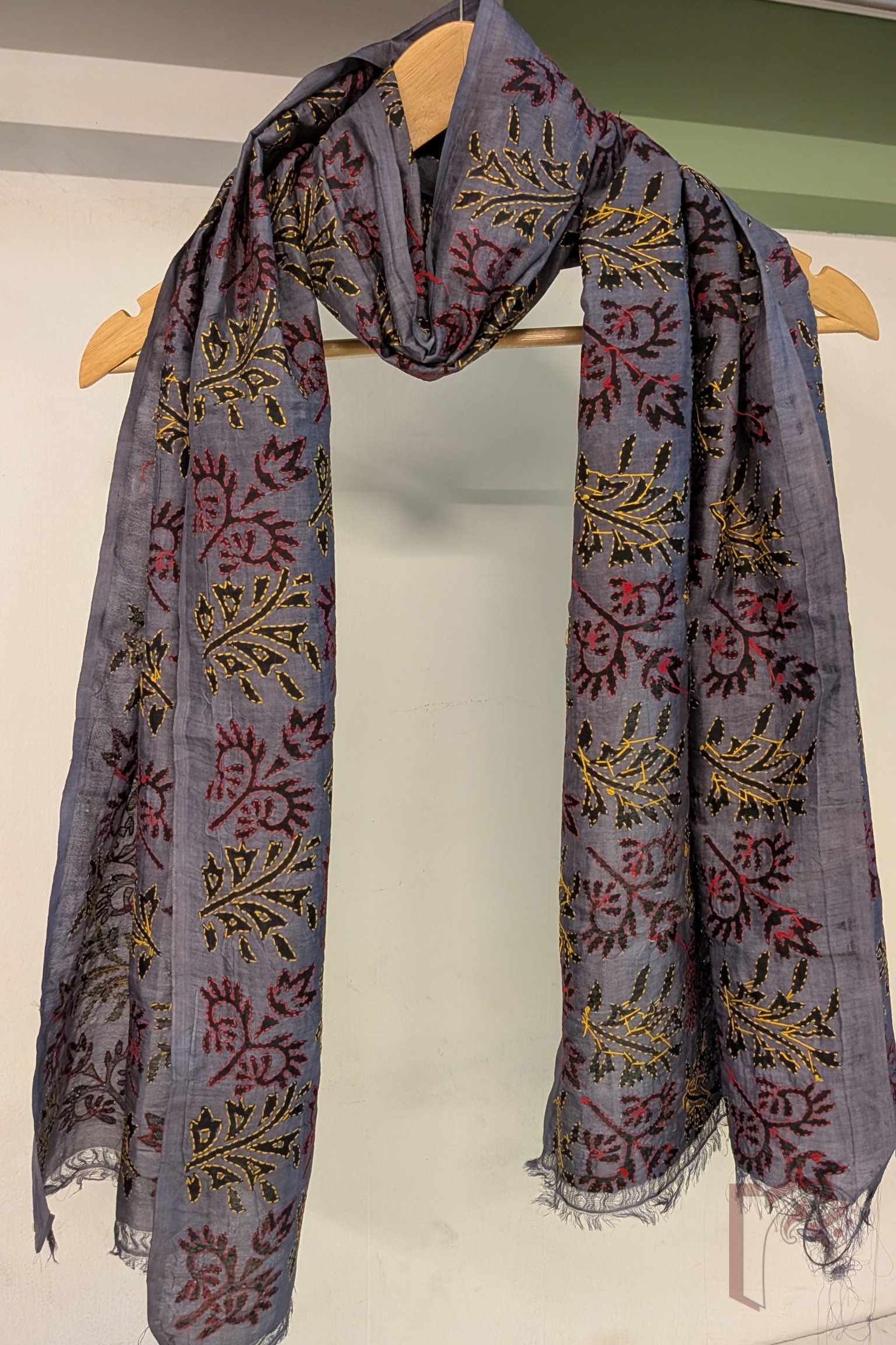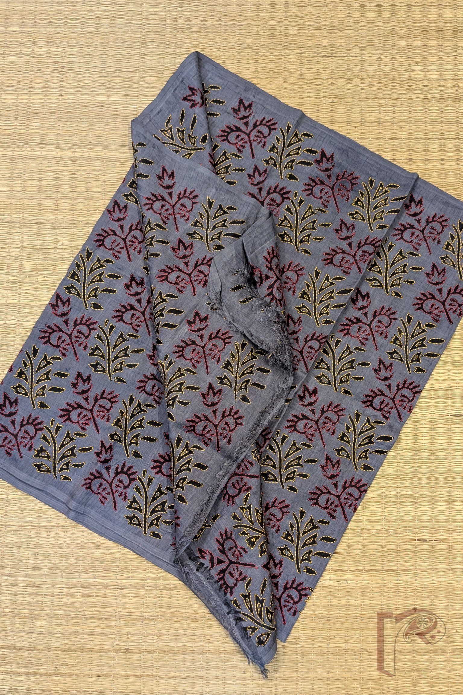 Dreamy Drapes – Grey Tussar Silk Dual Leaf Motif Hand Printed Kantha Stole with Red and Yellow Stitch