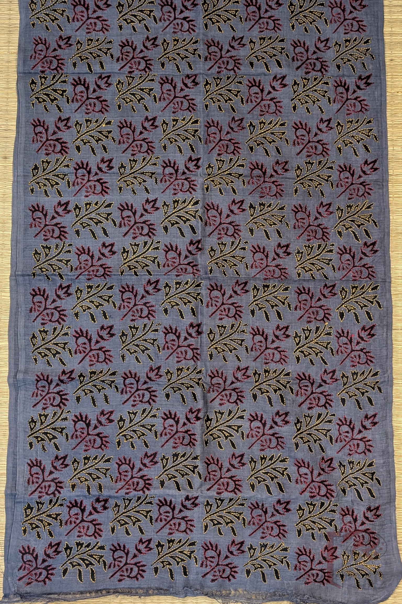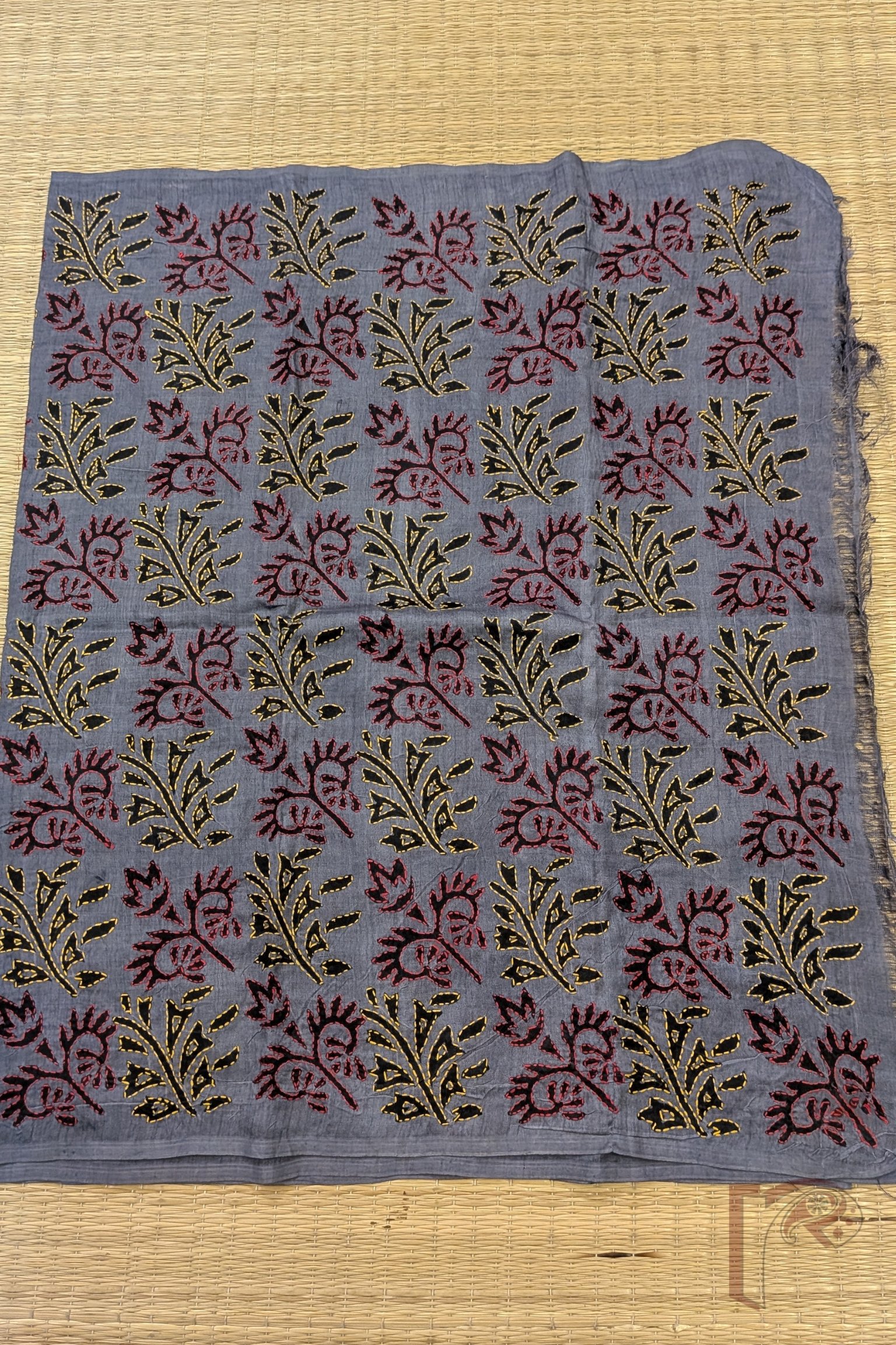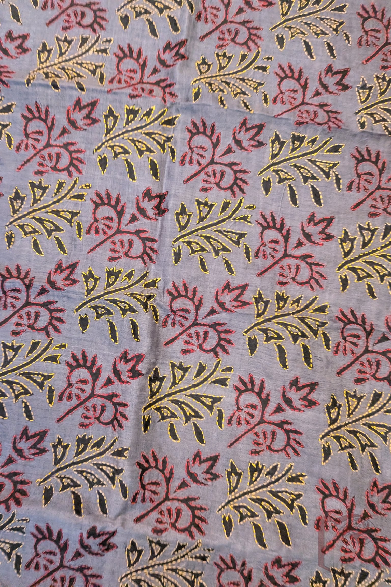 Dreamy Drapes – Grey Tussar Silk Dual Leaf Motif Hand Printed Kantha Stole with Red and Yellow Stitch