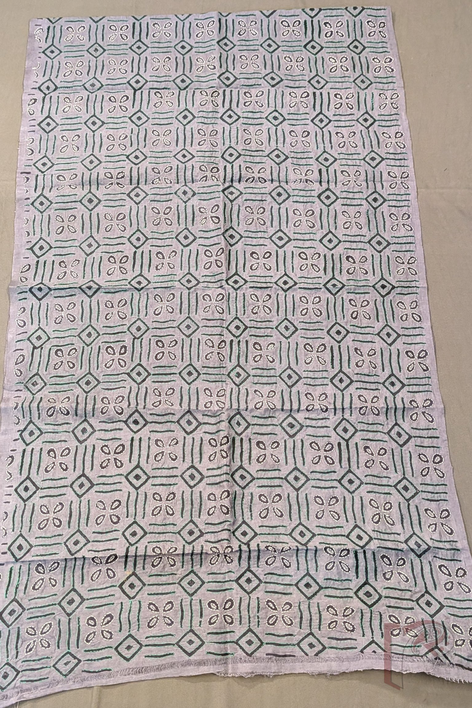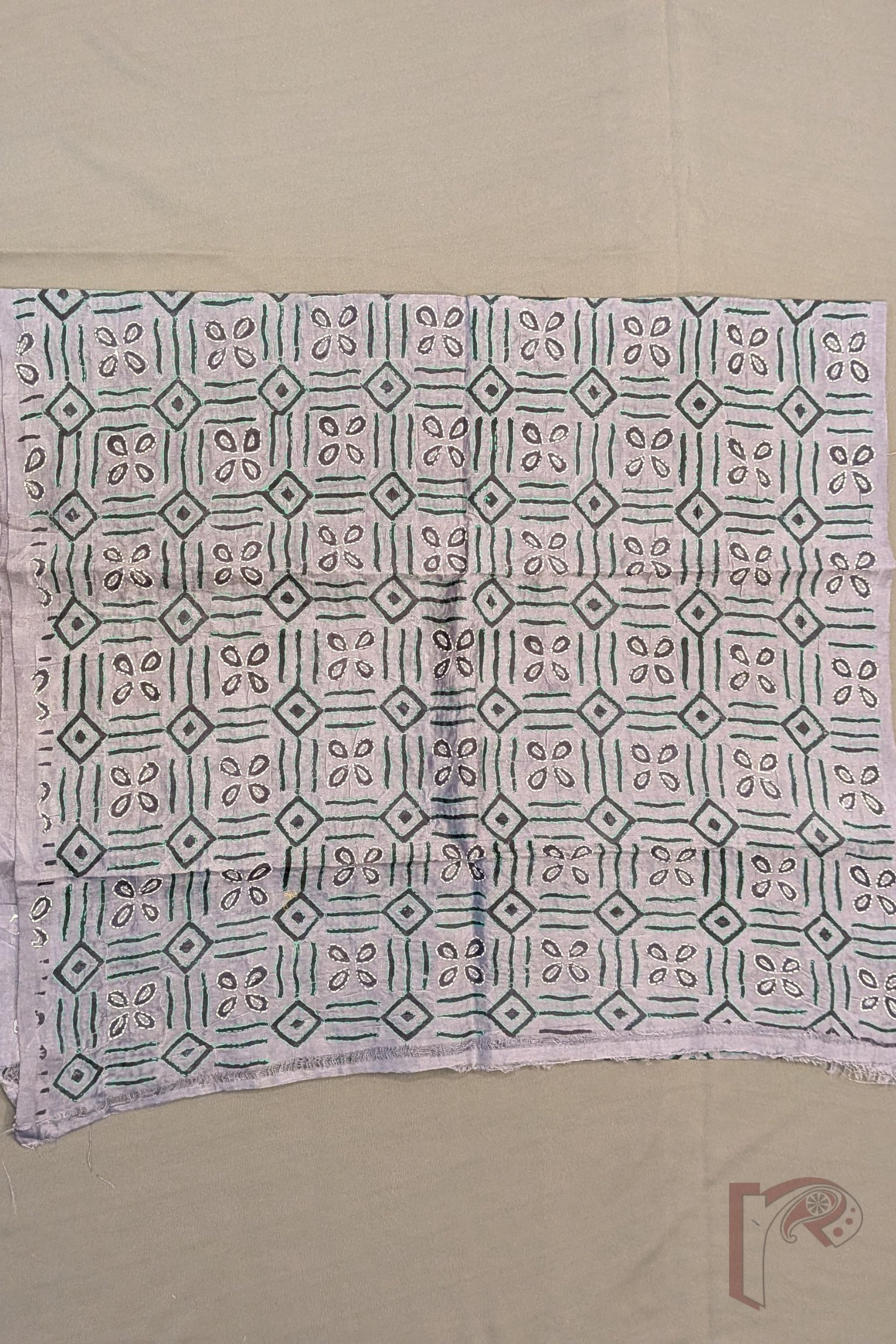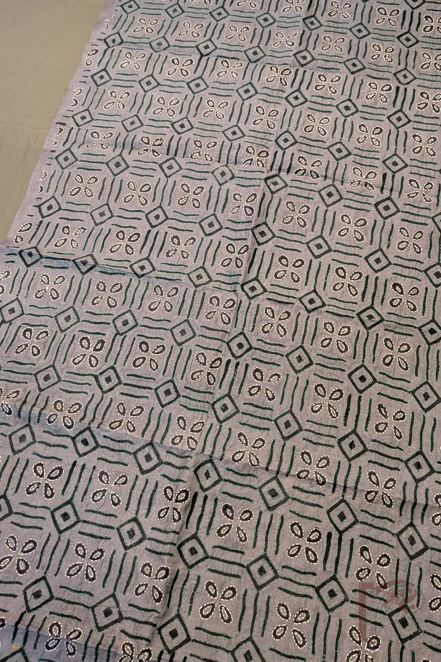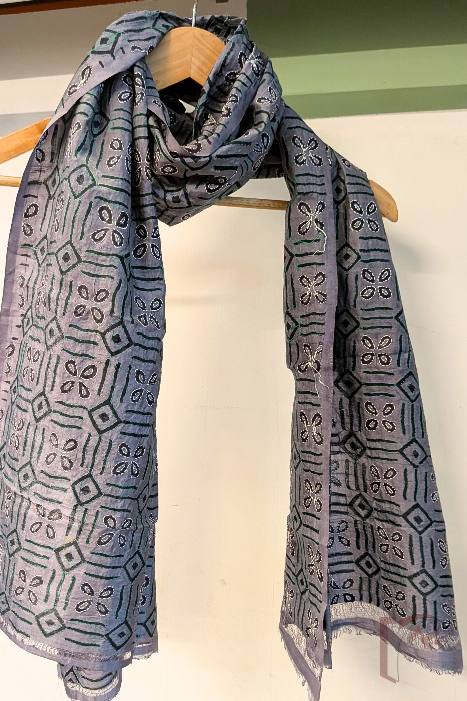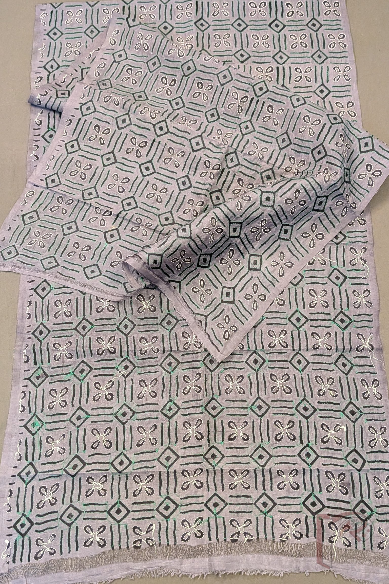 Dreamy Drapes – Grey Tussar Silk Geometric Diamond Grid and Four-Petal Floral Block Printed Kantha Stole with Green and White Embroidery