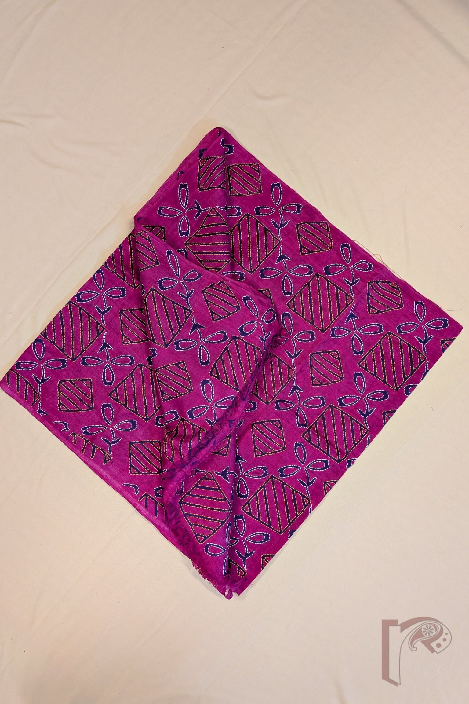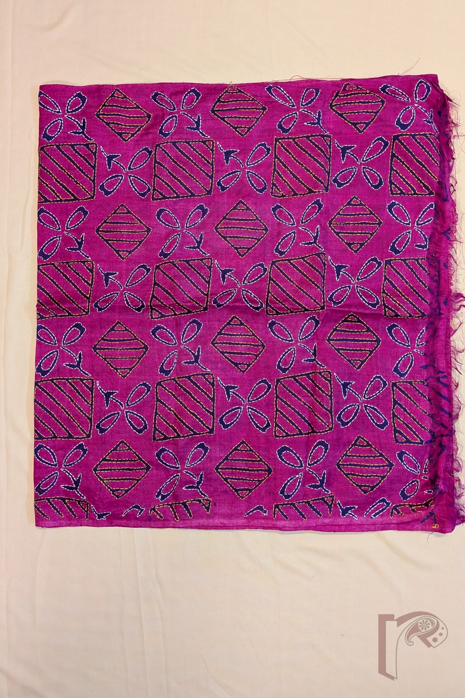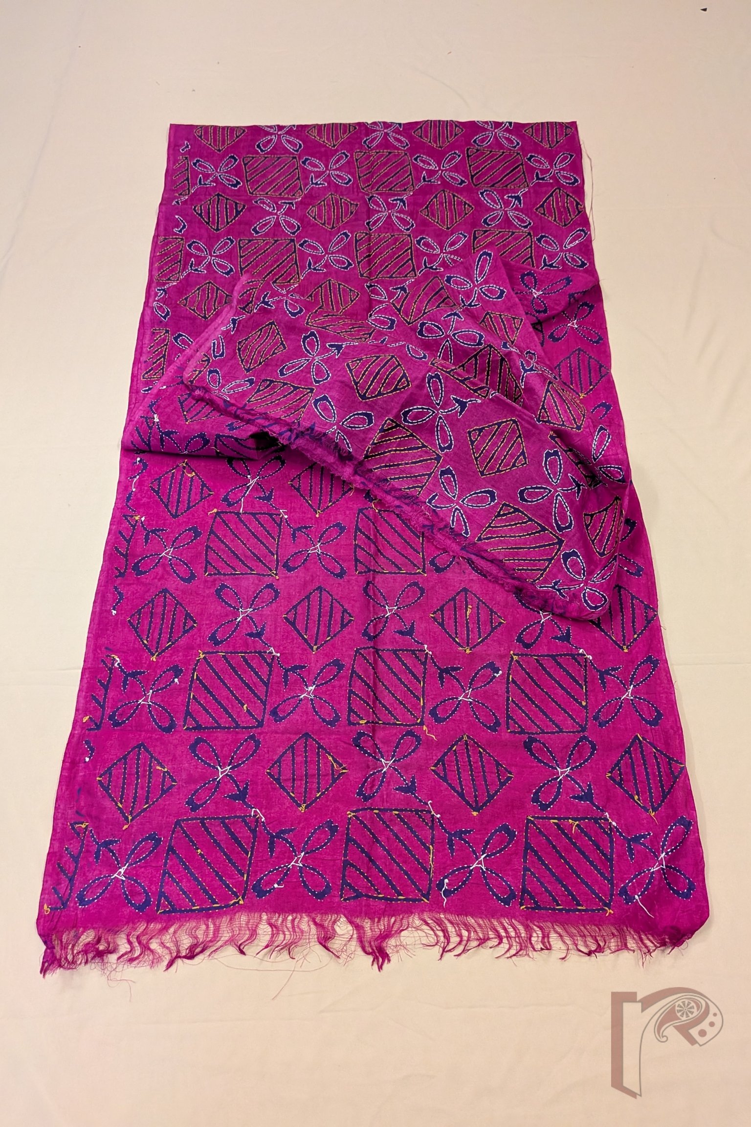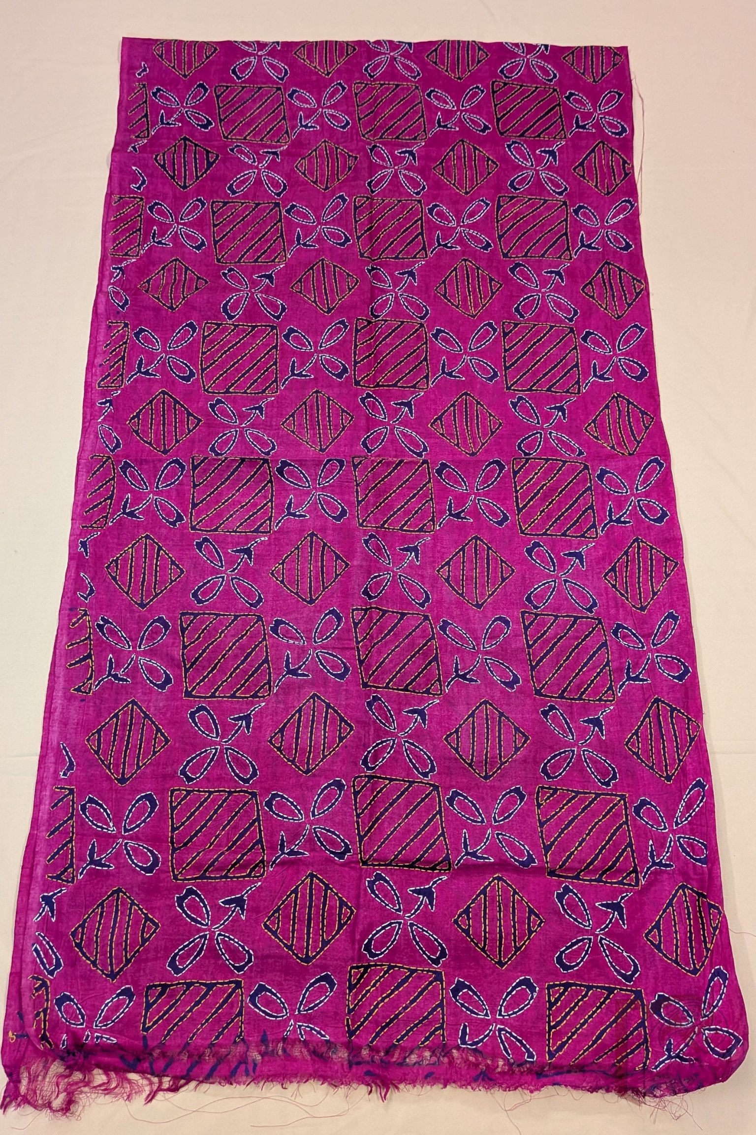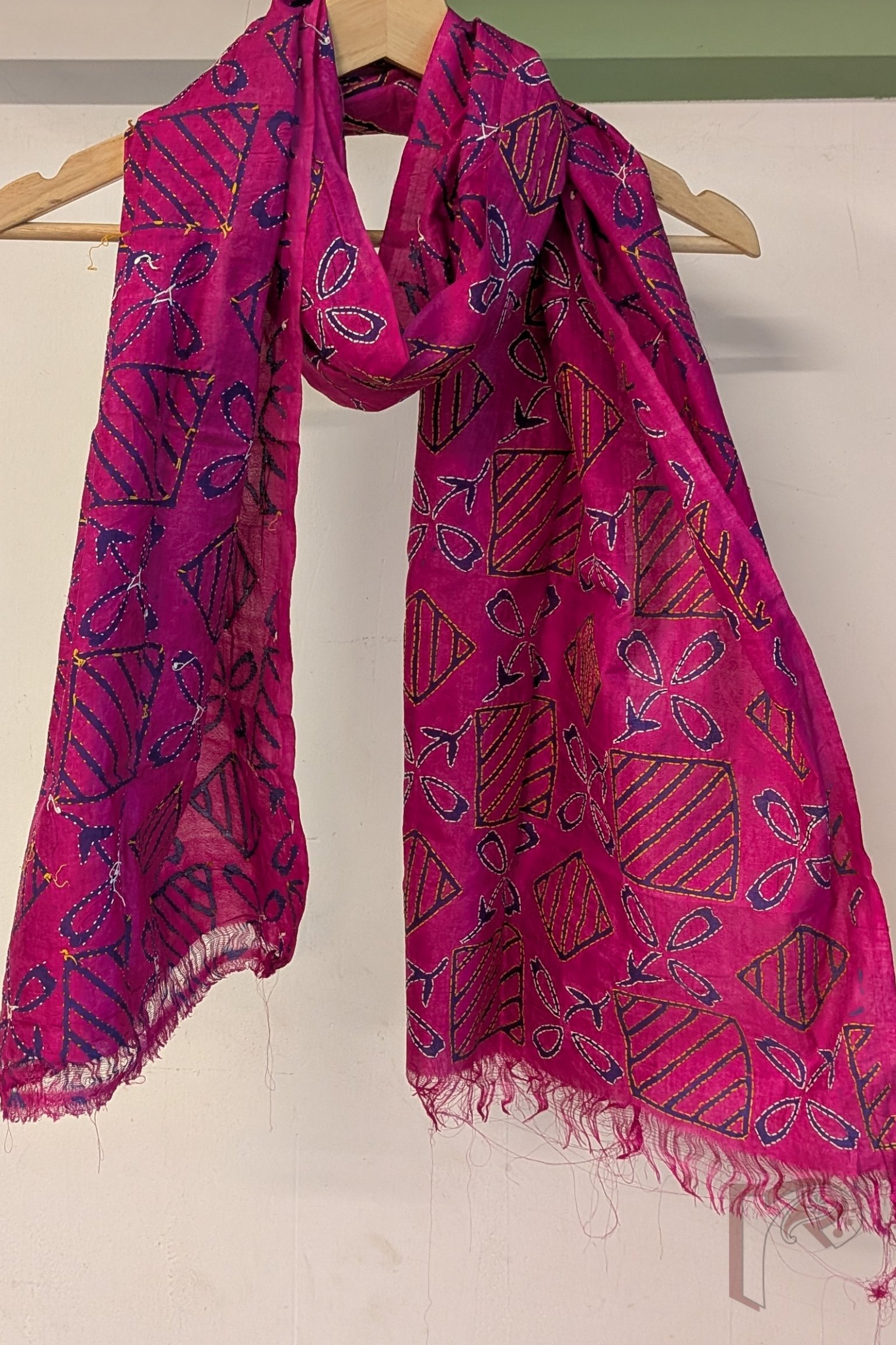 This striking hot pink tussar silk stole features an intricate geometric box pattern filled with diagonal line detailing, creating a rhythmic grid across the fabric. Nestled within this structured layout are elegant three-petal floral motifs on elongated stems, block printed in deep navy blue to create a dramatic contrast against the bright base. The motifs and geometric lines are beautifully enhanced with handcrafted Kantha embroidery in white and yellow thread, adding texture and dimension to the design. Crafted from naturally textured tussar silk, the stole offers a lightweight drape, breathable comfort, and subtle natural sheen. With its blend of bold colour, structured geometry, and delicate embroidery, this piece brings together modern graphic charm and traditional Bengali craftsmanship.