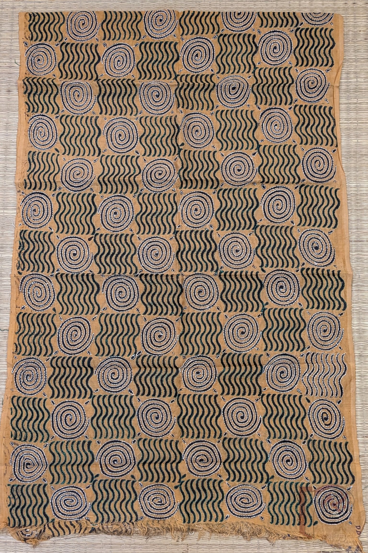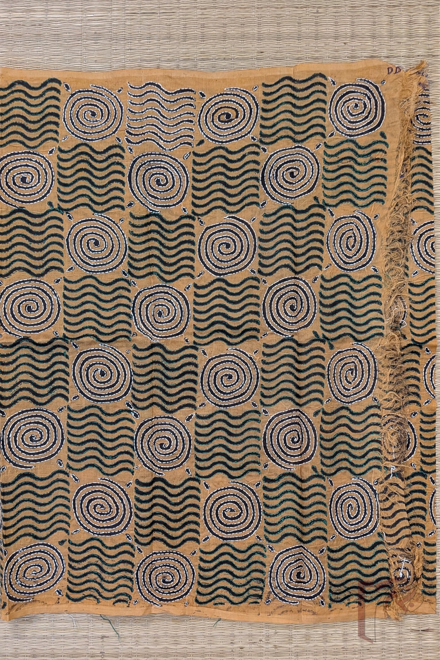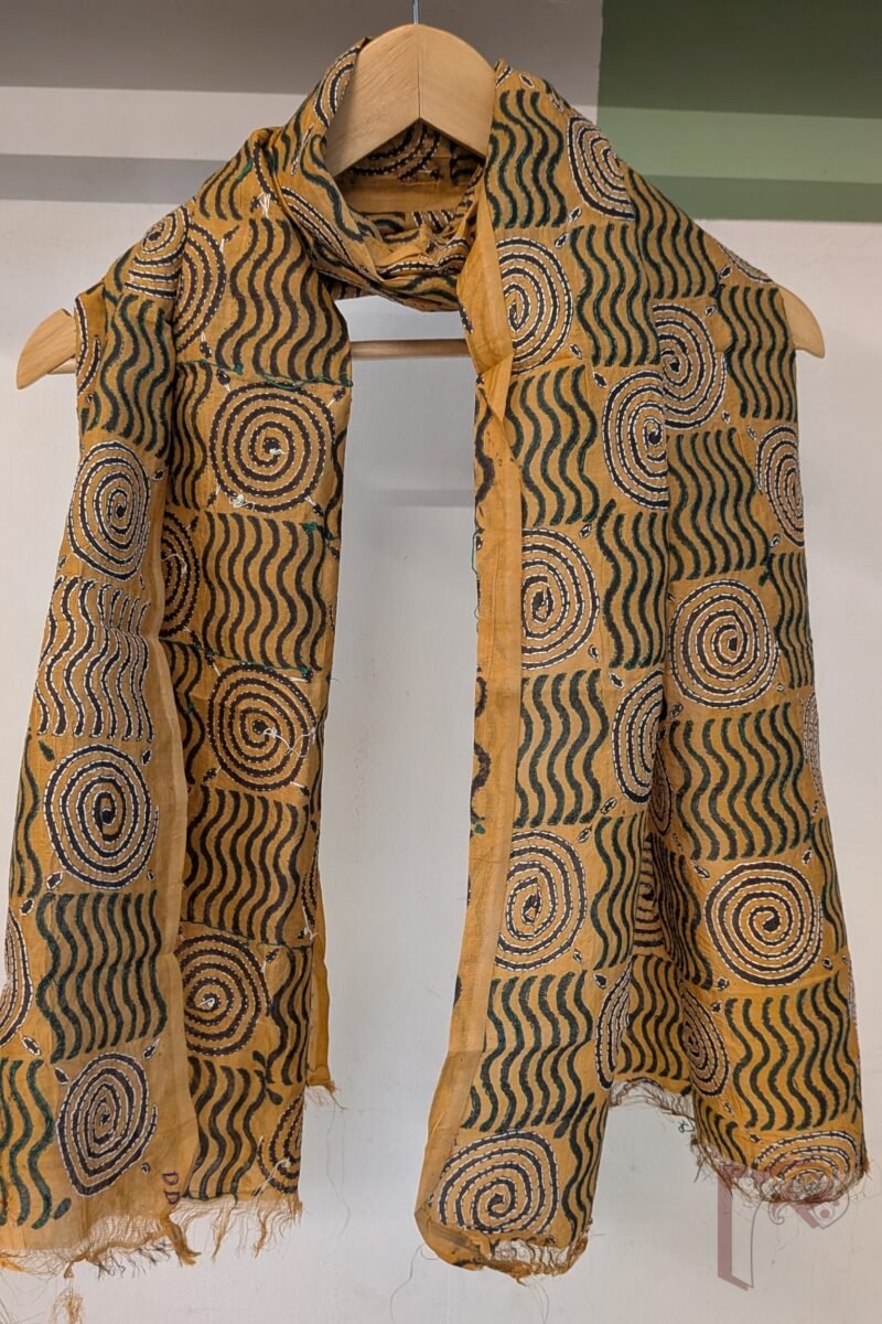 This light orange tussar silk stole presents a contemporary take on tradition with abstract line and circular motifs hand printed in black. The shapes are carefully outlined using Kantha stitch embroidery in green and white, adding clarity and rhythm to the design. The tussar silk base enhances the modern aesthetic while offering breathable comfort and a fluid drape. Bold yet balanced, this stole is ideal for those who appreciate artistic expression rooted in heritage techniques.