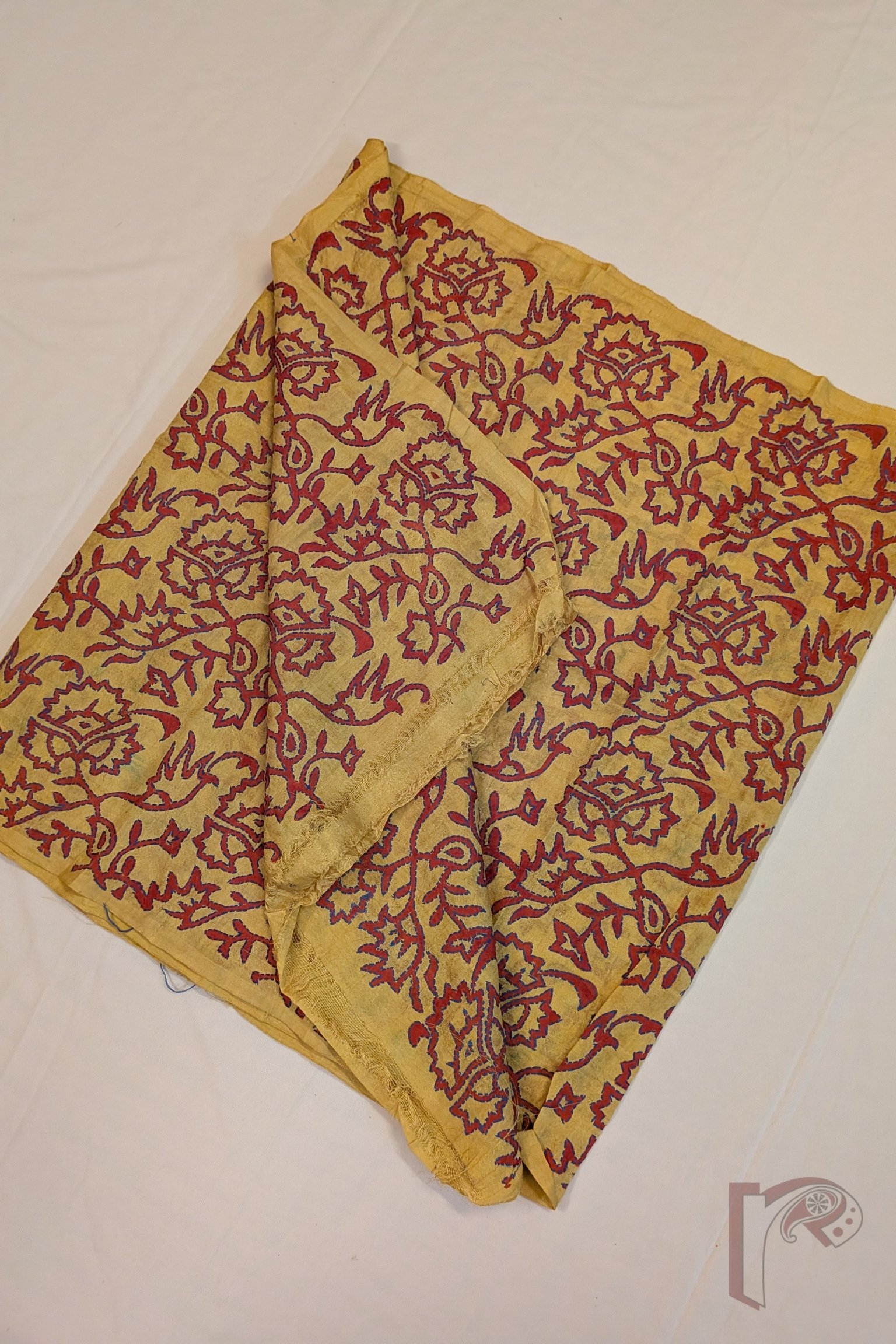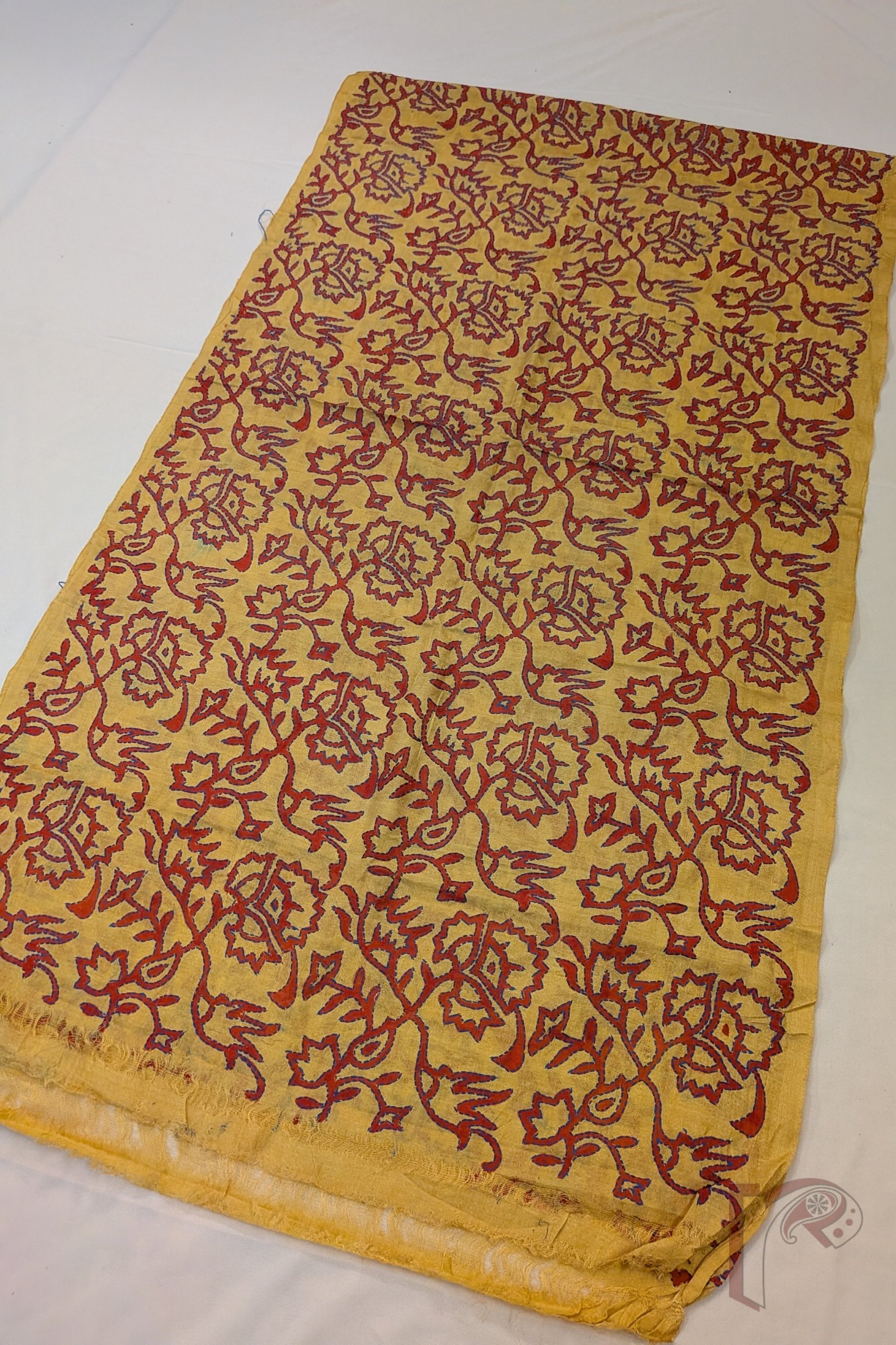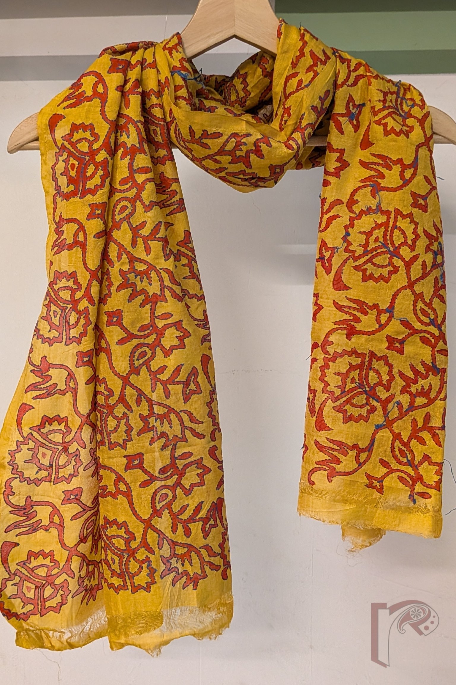 Radiating warmth and vibrancy, this mango yellow tussar silk stole showcases charming hand block printed flower and leaf bunch motifs rendered in bright red. The lively motifs are further accentuated with delicate Kantha embroidery in blue thread, carefully outlining the forms and bringing the floral clusters to life. The natural texture of tussar silk lends the stole a soft matte sheen, breathable structure, and graceful fall, making it both elegant and comfortable to wear. The contrast of red prints with blue embroidery creates a visually striking composition that feels joyful yet refined. This stole beautifully celebrates traditional block printing, meticulous embroidery, and the earthy richness of natural silk.