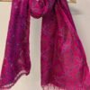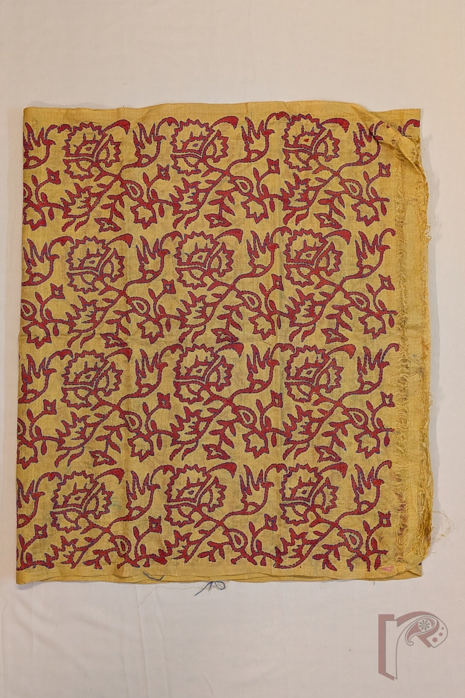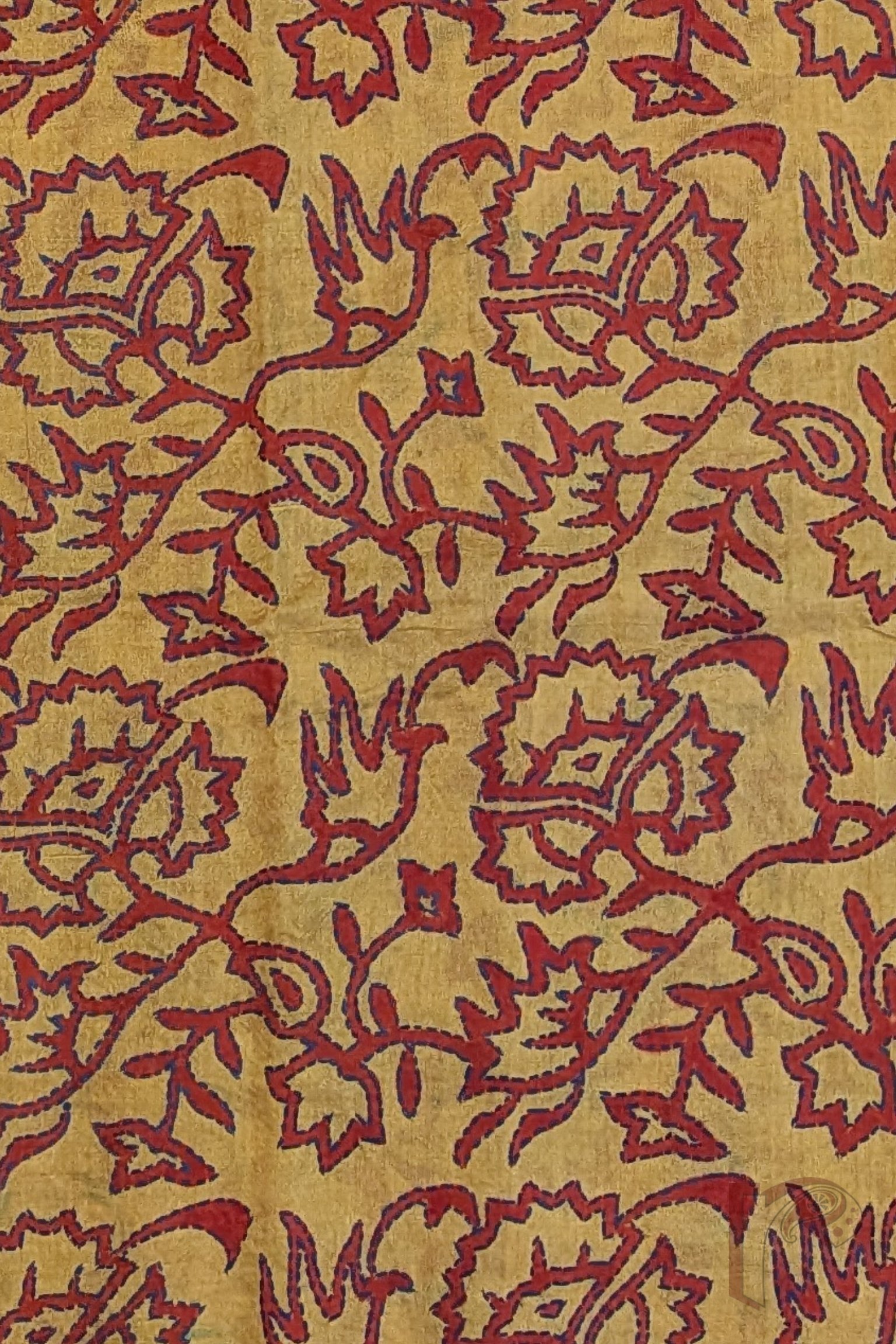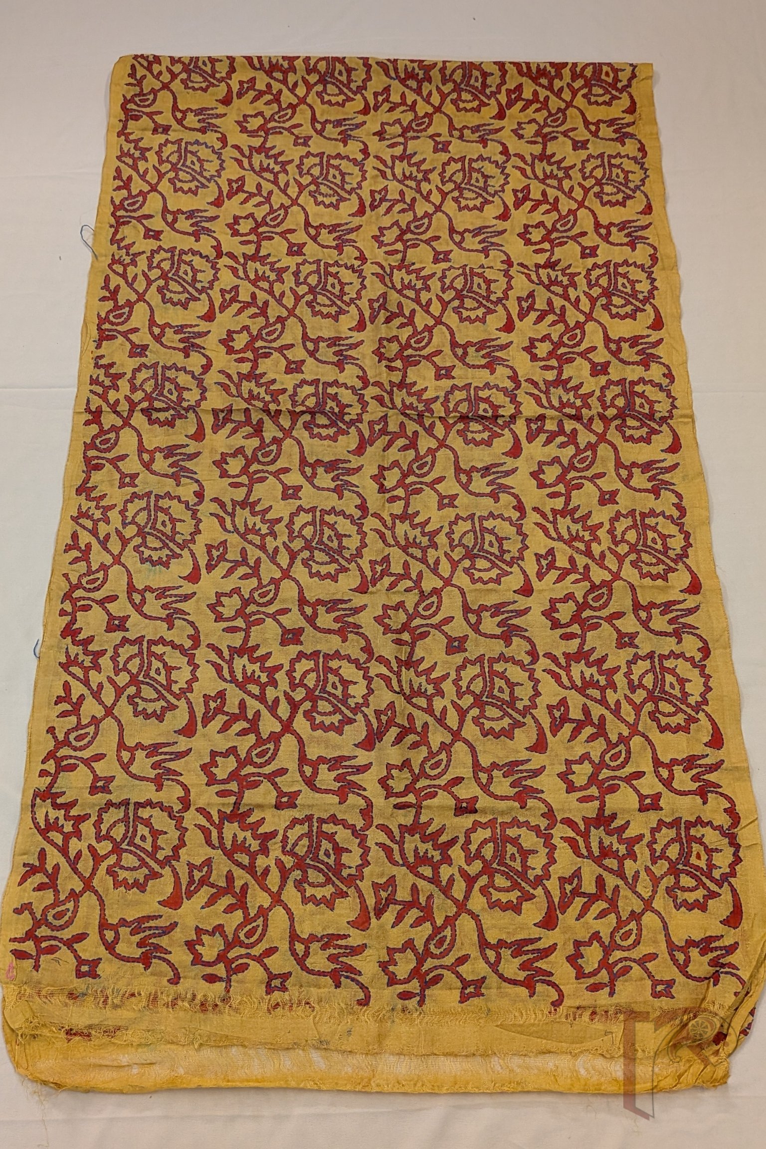 Radiating warmth and vibrancy, this mango yellow tussar silk stole showcases charming hand block printed flower and leaf bunch motifs rendered in bright red. The lively motifs are further accentuated with delicate Kantha embroidery in blue thread, carefully outlining the forms and bringing the floral clusters to life. The natural texture of tussar silk lends the stole a soft matte sheen, breathable structure, and graceful fall, making it both elegant and comfortable to wear. The contrast of red prints with blue embroidery creates a visually striking composition that feels joyful yet refined. This stole beautifully celebrates traditional block printing, meticulous embroidery, and the earthy richness of natural silk.
