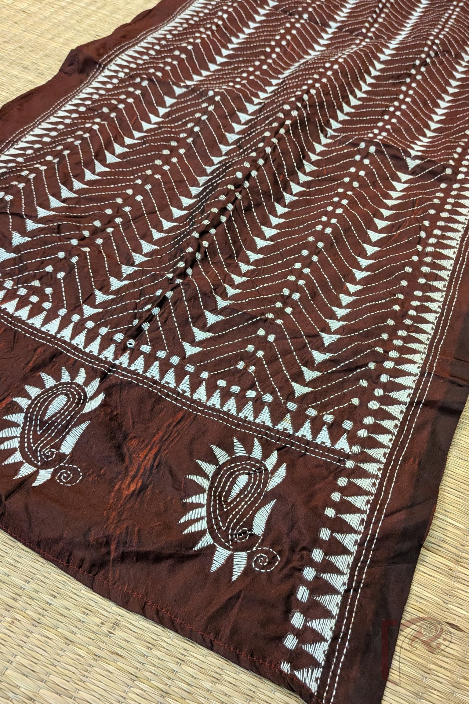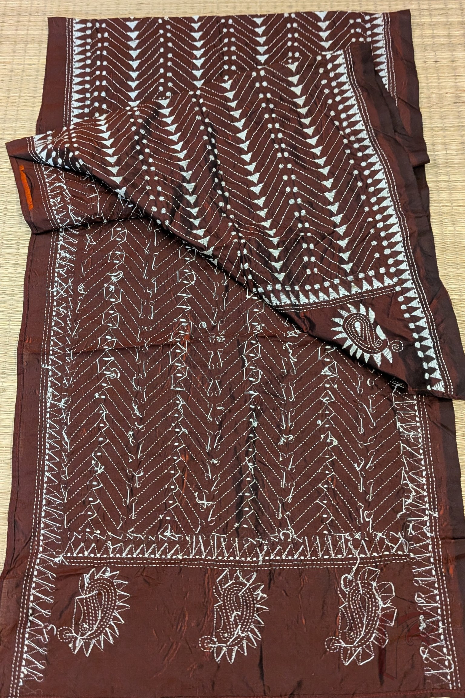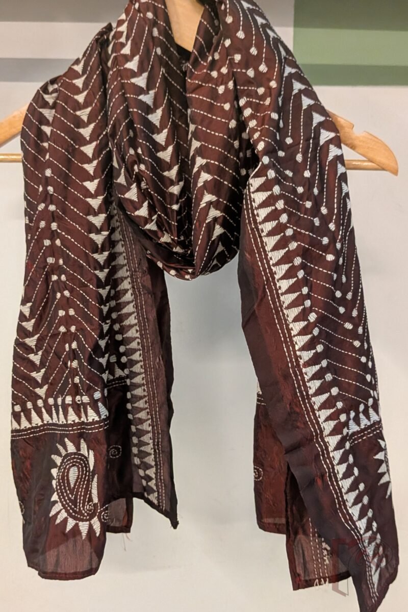 This sophisticated maroon blended silk stole is embellished with pristine white Kantha stitchwork forming geometric motifs including circles, triangles and linear designs—all intricately hand-embroidered to create a refined aesthetic. A classic temple border runs along the edges, adding a traditional touch to its contemporary patterning. The maroon blended silk base offers a rich sheen, smooth finish and graceful drape, making it ideal for both festive wear and minimal chic styling. The contrast of white on maroon provides crisp visual definition, while the hand-stitched motifs reflect meticulous craftsmanship. Perfect for elevating understated outfits, this stole combines timeless tradition with modern artistic geometry.