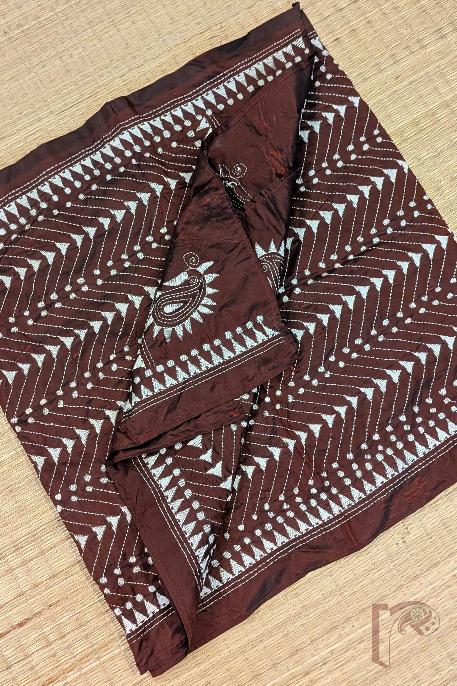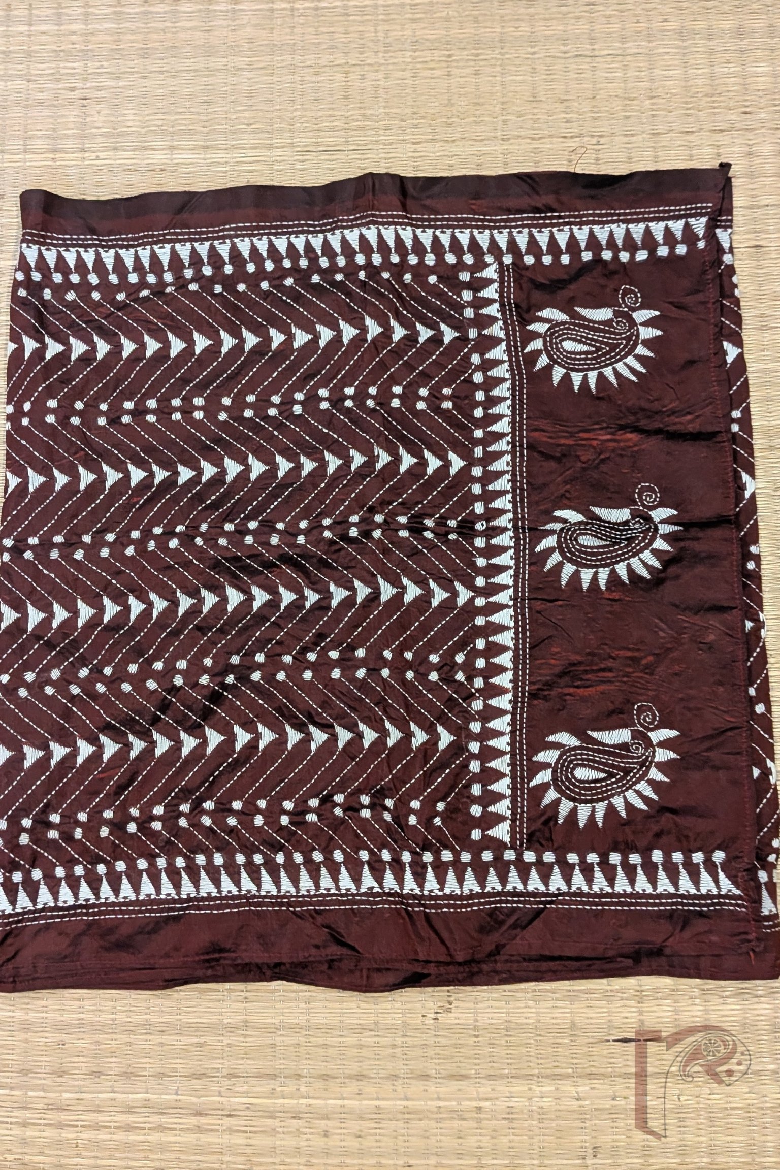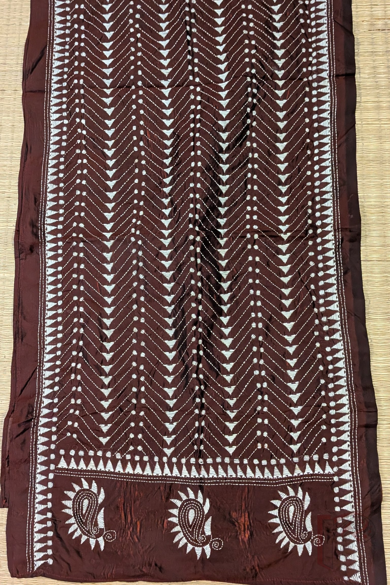 Dreamy Drapes – Maroon Blended Silk Kantha Stole with White Geometric Motifs and Temple Border