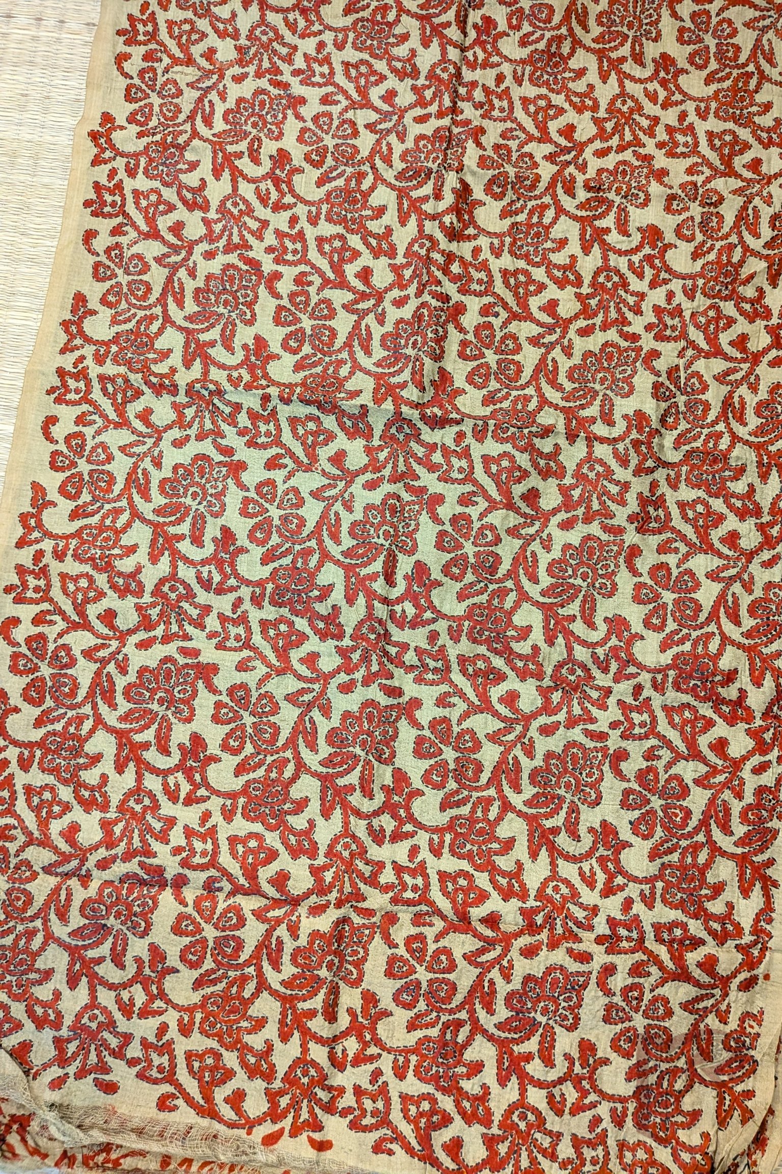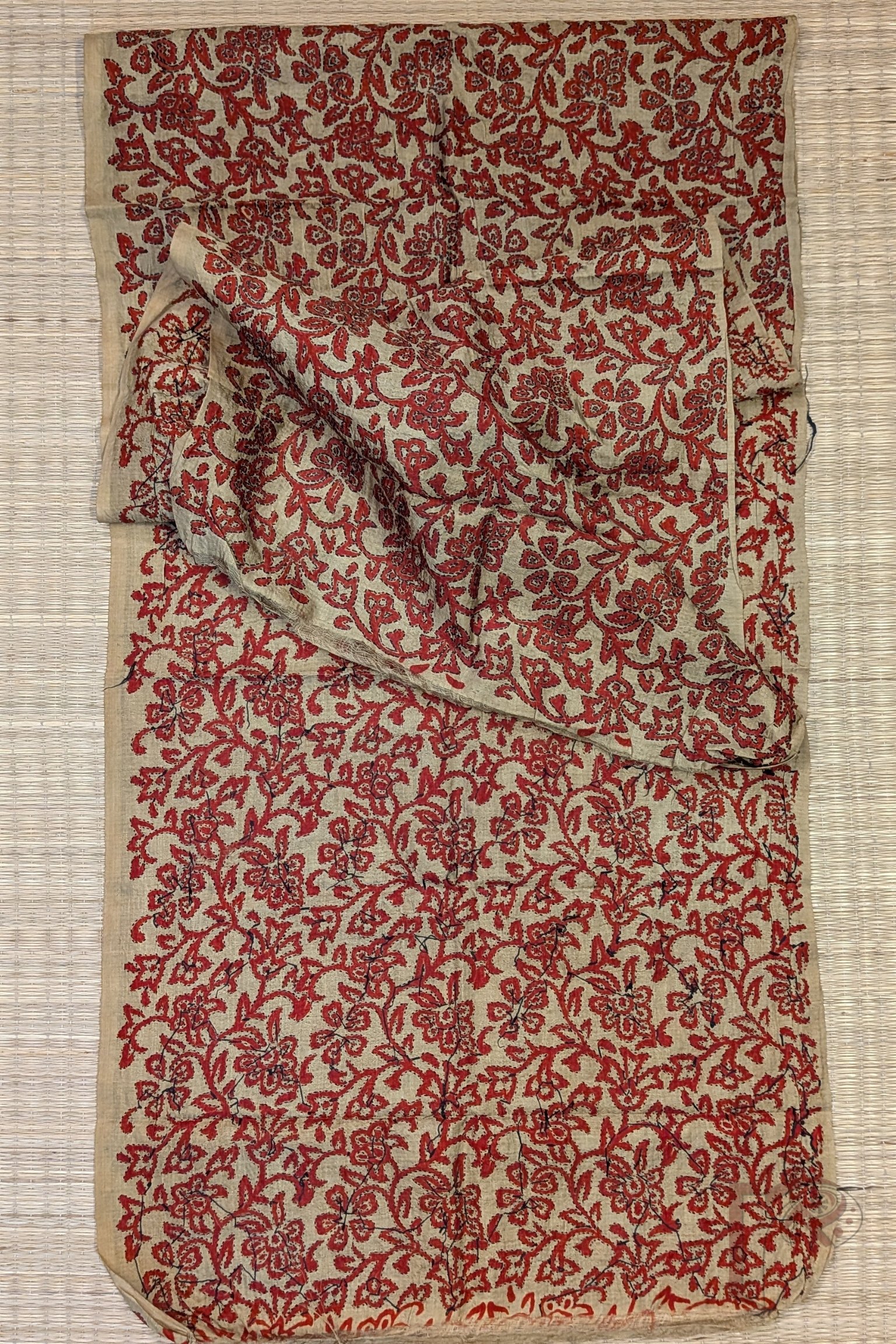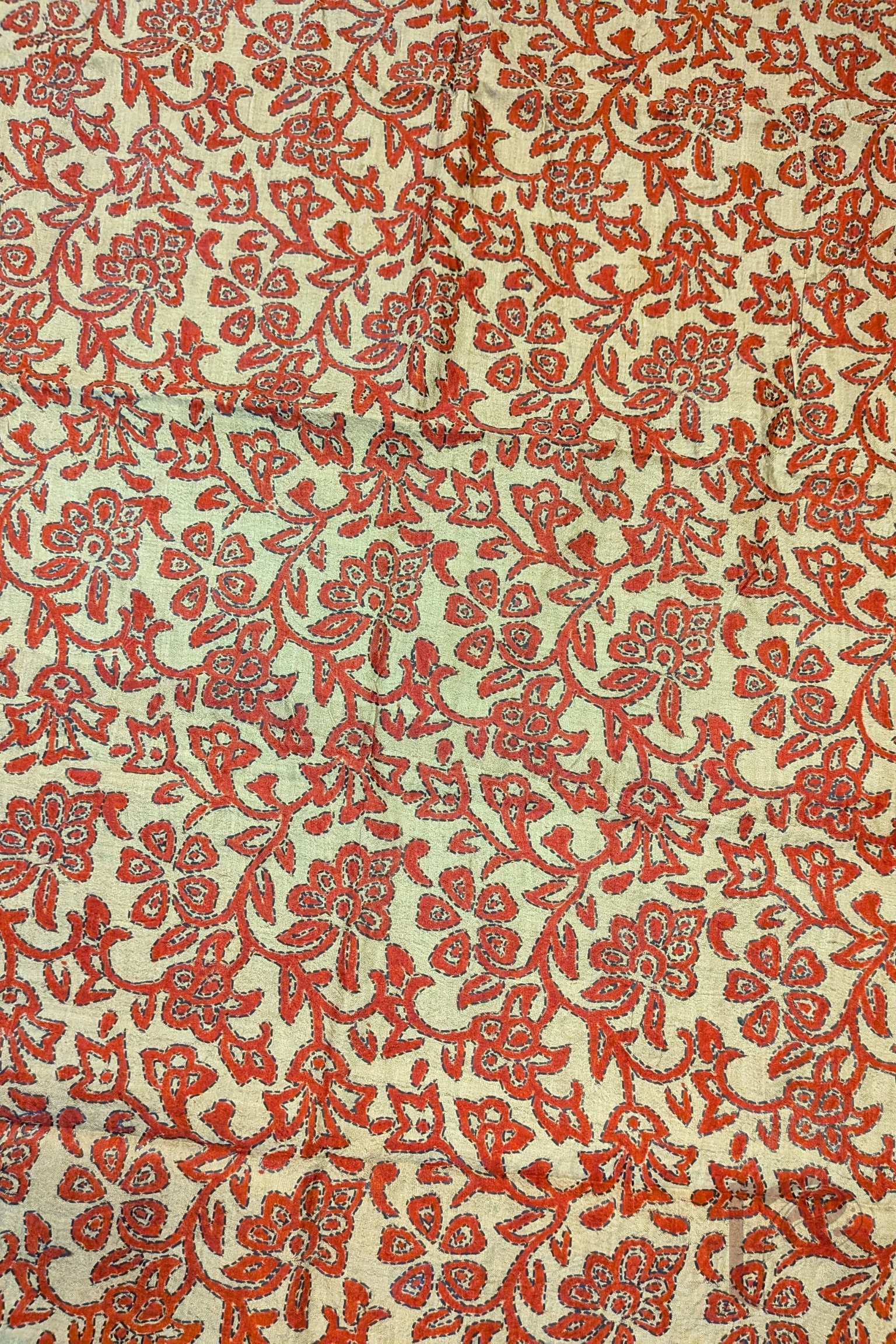 This dull mehendi green tussar silk stole is adorned with all-over floral and leaf stem motifs hand printed in rich red tones. Each motif is meticulously outlined with Kantha stitch embroidery in black, creating bold definition and visual depth. The textured silk base enhances the handcrafted feel while remaining lightweight, durable, and breathable. Elegant and rooted in tradition, this stole stands out for its strong colour contrast and detailed artisanal finish.