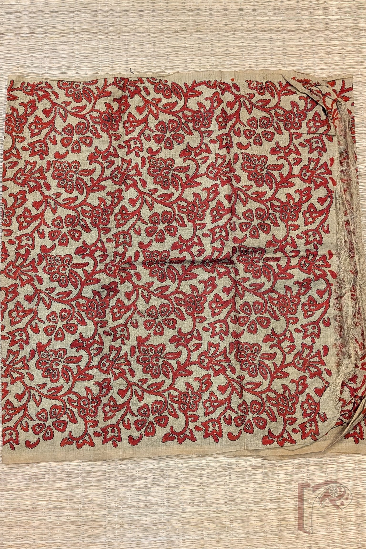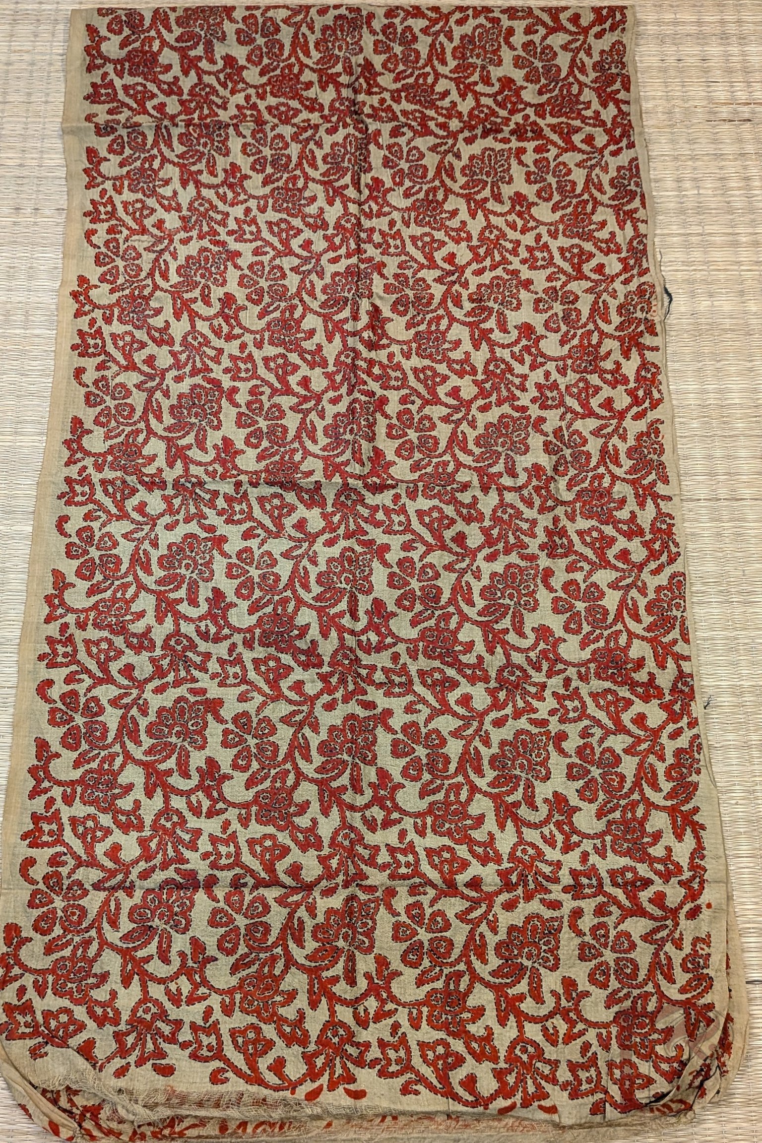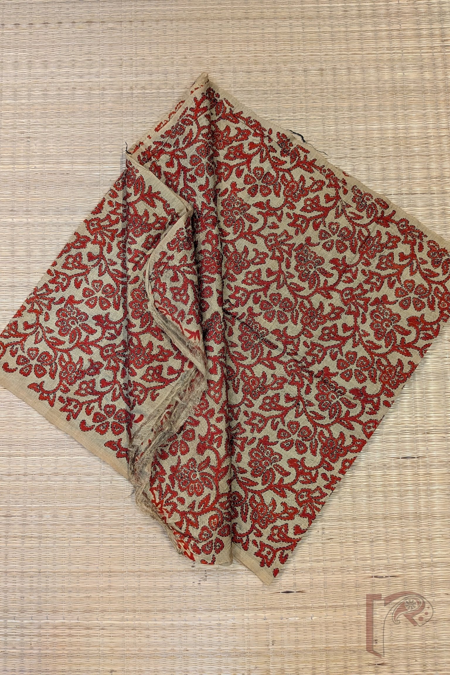 This dull mehendi green tussar silk stole is adorned with all-over floral and leaf stem motifs hand printed in rich red tones. Each motif is meticulously outlined with Kantha stitch embroidery in black, creating bold definition and visual depth. The textured silk base enhances the handcrafted feel while remaining lightweight, durable, and breathable. Elegant and rooted in tradition, this stole stands out for its strong colour contrast and detailed artisanal finish.