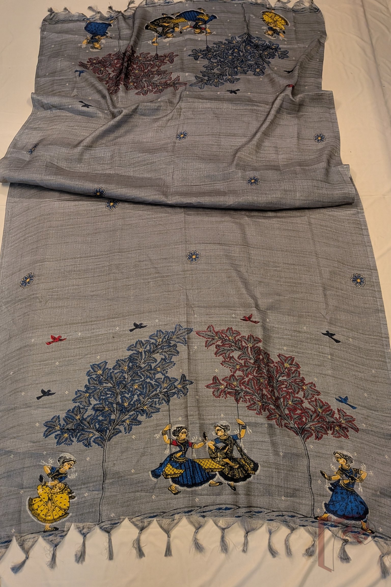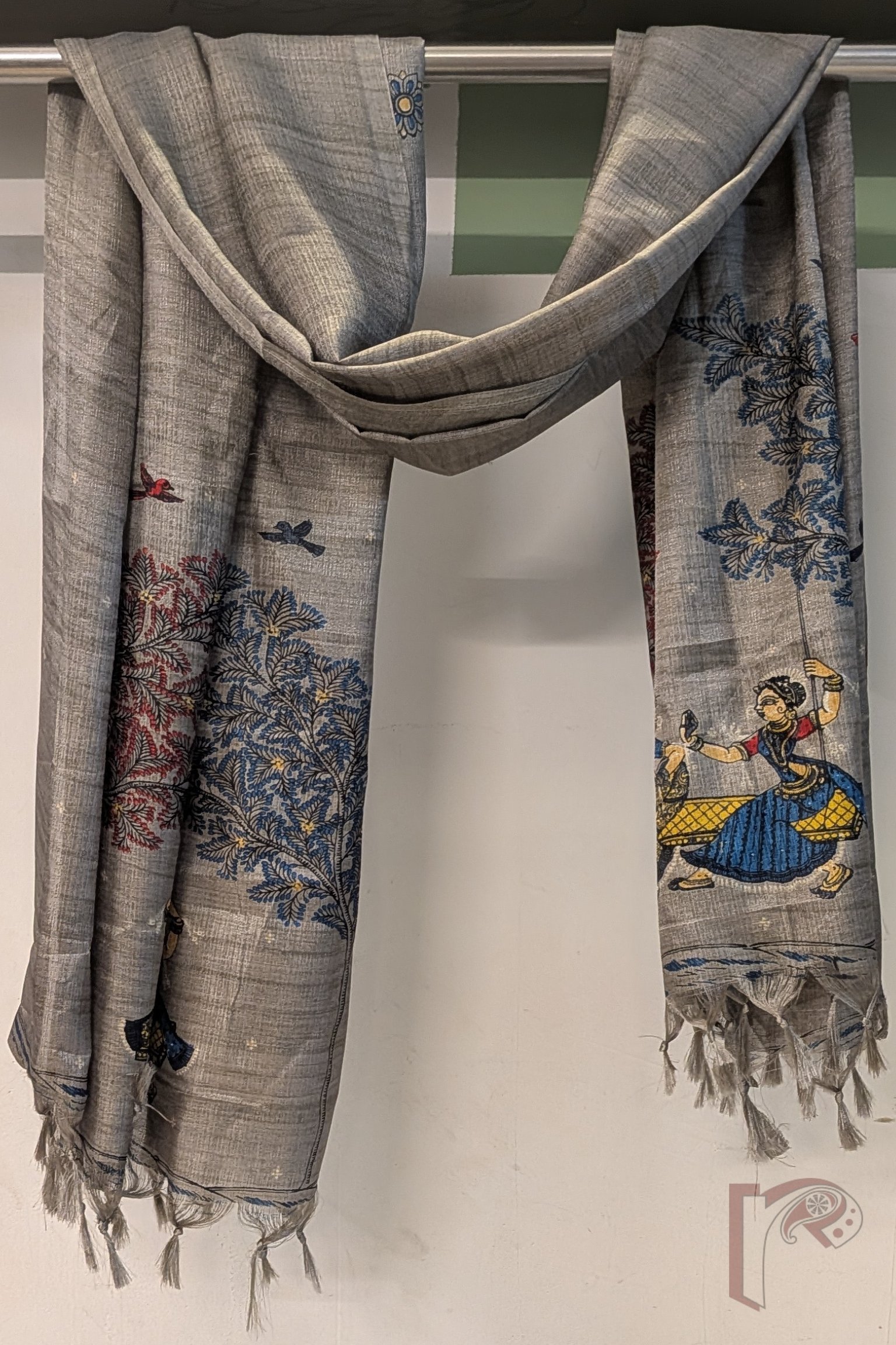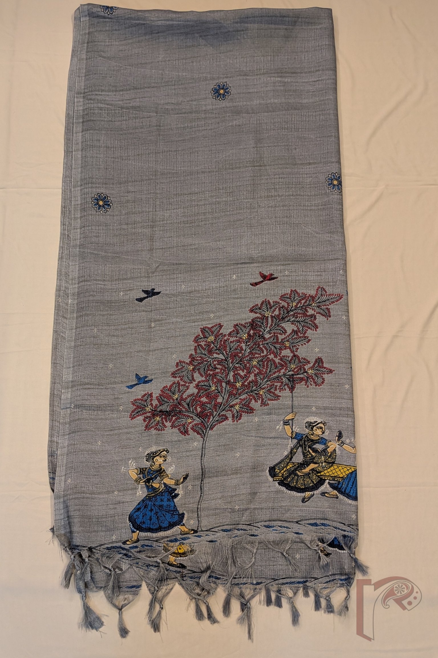 This charming dupatta features a serene slate grey base that becomes the perfect canvas for playful multicolour figurative prints. On each broad end, beautifully illustrated figures seated on swings beneath trees create a storytelling motif that brings a touch of folk artistry to the piece. The rest of the body remains minimal, allowing the artwork to stand out with elegance. The dupatta is finished with matching self-colour tassels, enhancing its graceful drape. Made from natural banana fiber fabric, it offers excellent breathability, subtle texture, and a soft structured fall, making it an effortless accessory for both everyday wear and artistic styling.