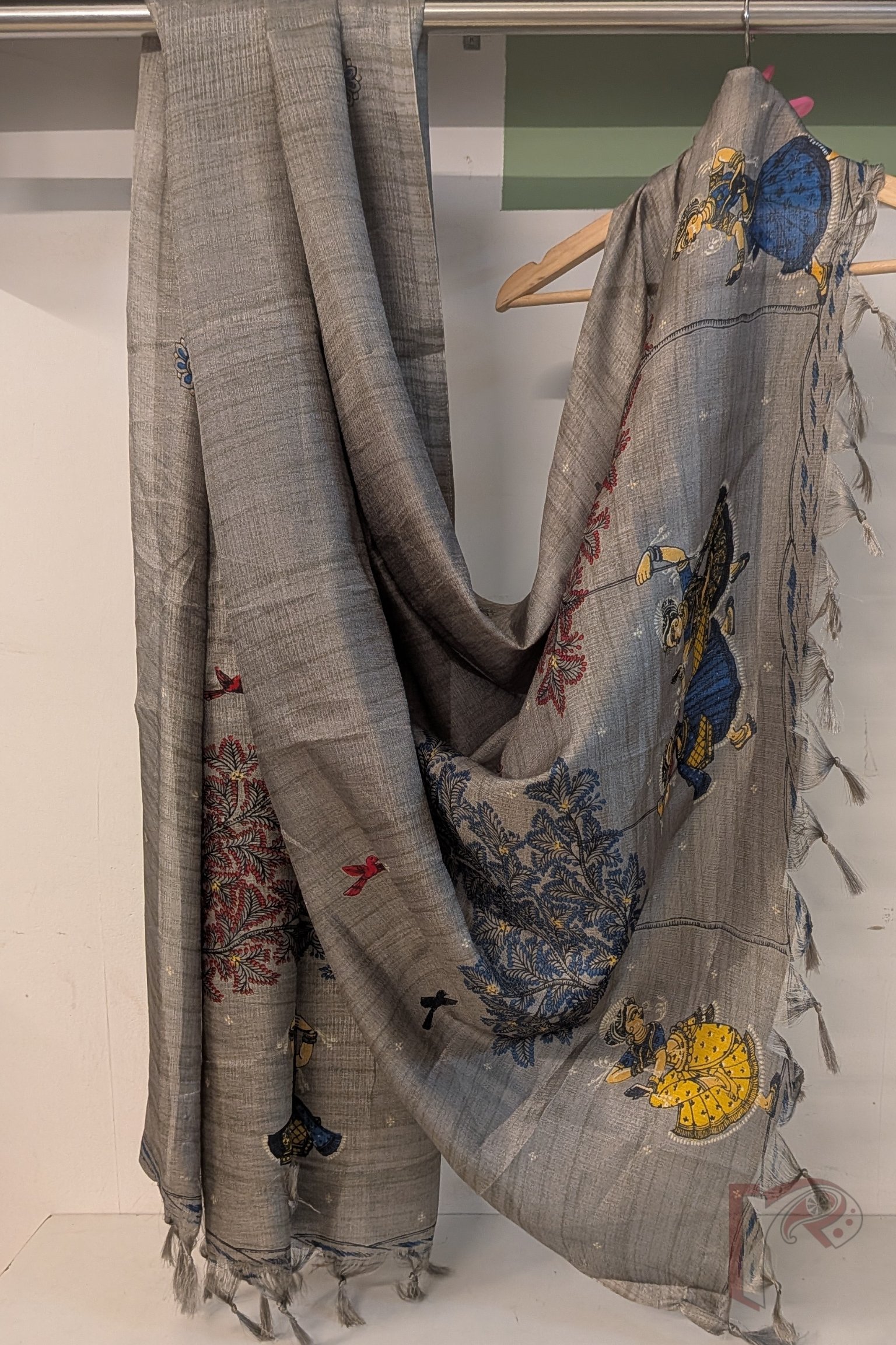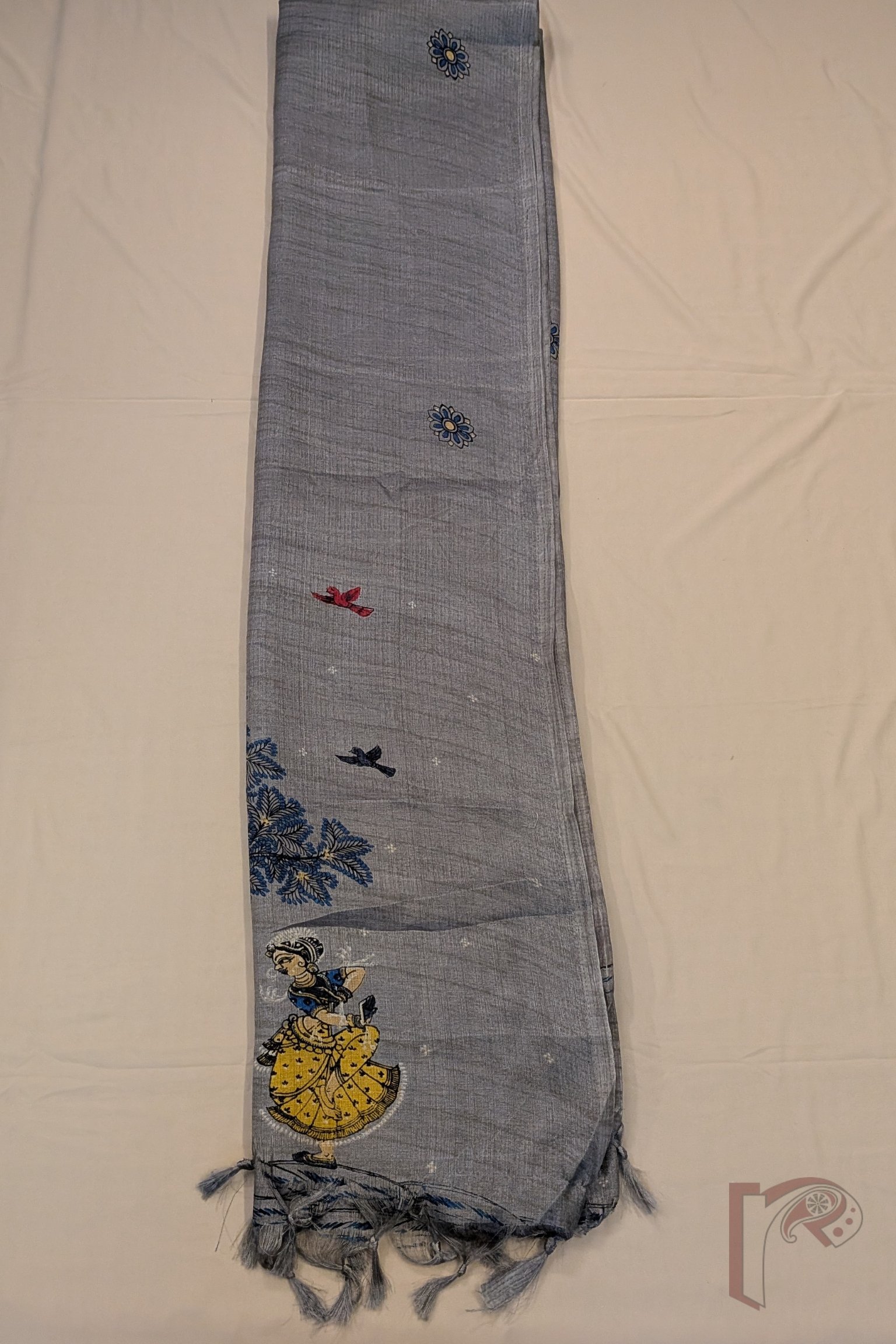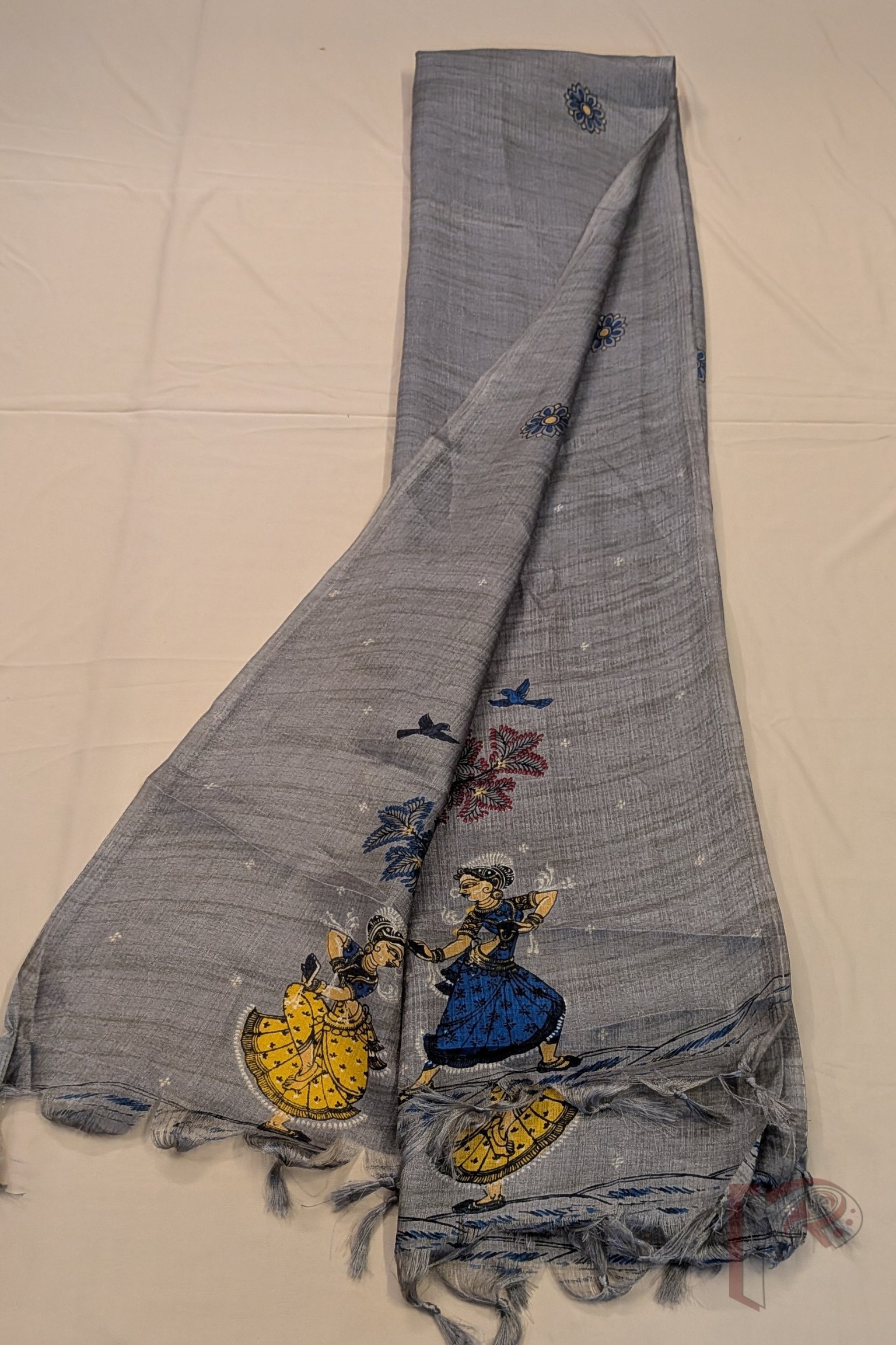 This charming dupatta features a serene slate grey base that becomes the perfect canvas for playful multicolour figurative prints. On each broad end, beautifully illustrated figures seated on swings beneath trees create a storytelling motif that brings a touch of folk artistry to the piece. The rest of the body remains minimal, allowing the artwork to stand out with elegance. The dupatta is finished with matching self-colour tassels, enhancing its graceful drape. Made from natural banana fiber fabric, it offers excellent breathability, subtle texture, and a soft structured fall, making it an effortless accessory for both everyday wear and artistic styling.