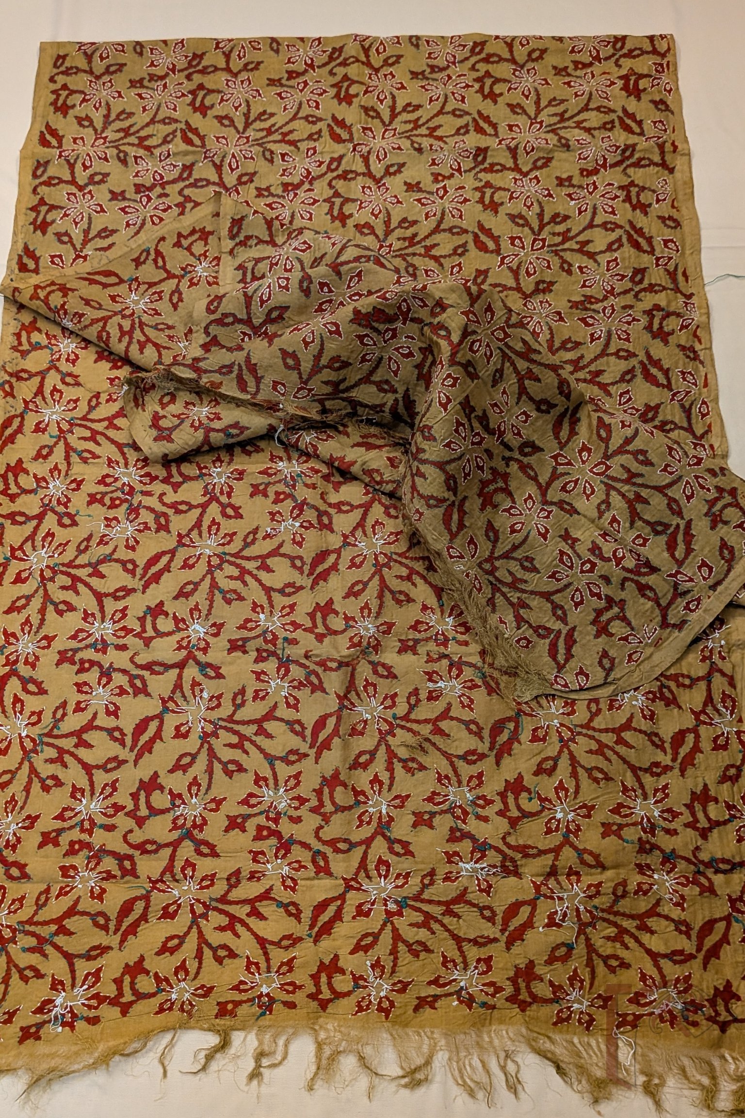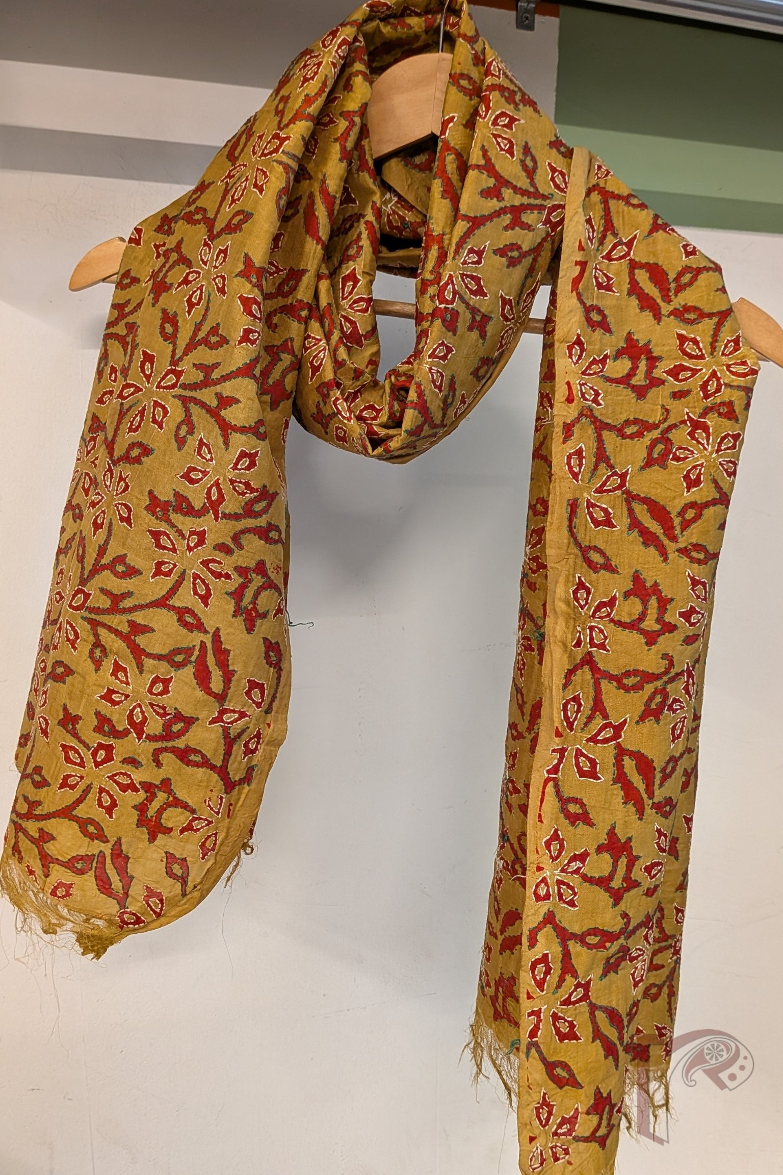 Dreamy Drapes – Yellow Tussar Silk Floral Stem Hand Printed Kantha Stole with White and Green Embroidery