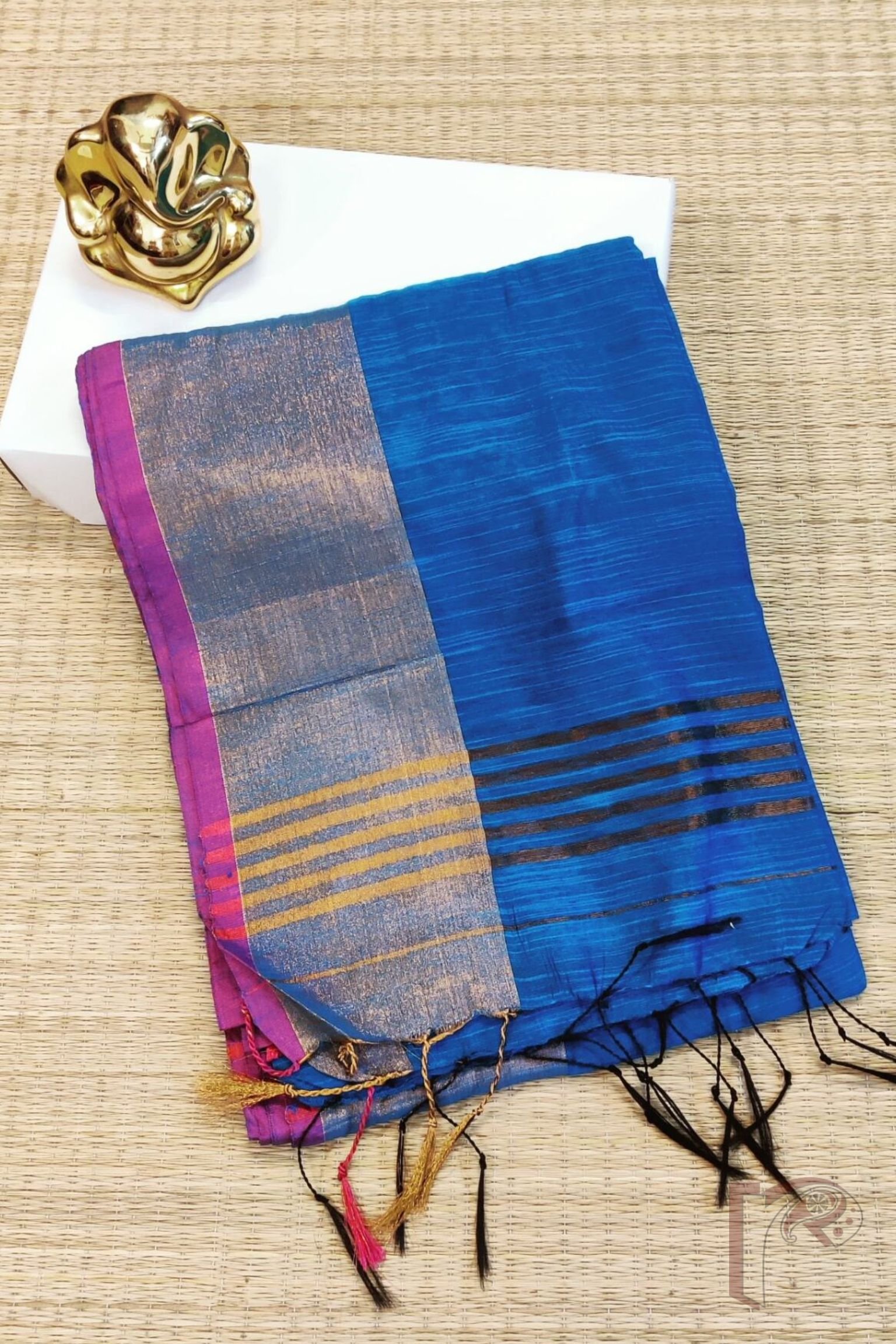 Gicha Glory – Blue Gicha Handloom Saree with Broad Gold Border and Zari Pallu