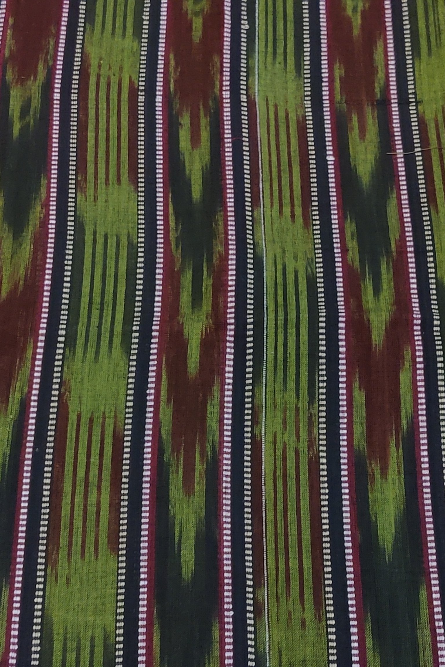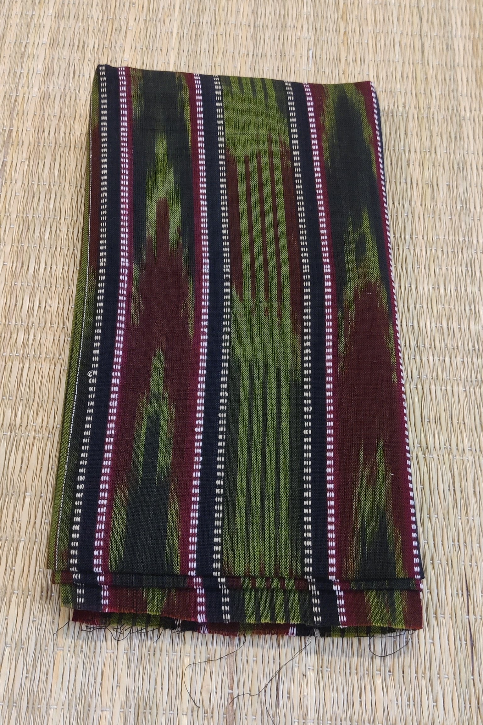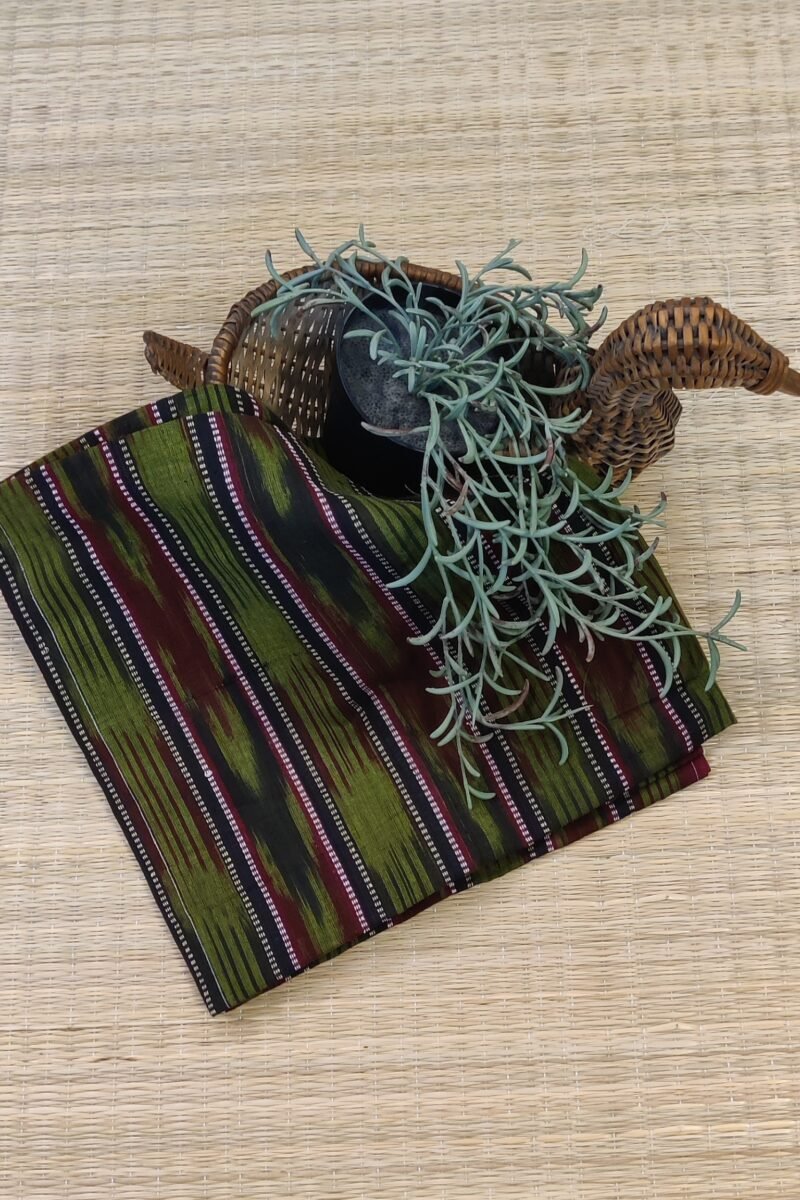 This rich green, black and maroon Sambalpuri blouse piece features black half inch stripes with white thread borders and mehandi green clustered lines. The multi tonal arrangement creates a visually dynamic fabric. Perfect for pairing with handloom sarees, this piece offers bold contrast, detailed weaving and breathable cotton comfort.