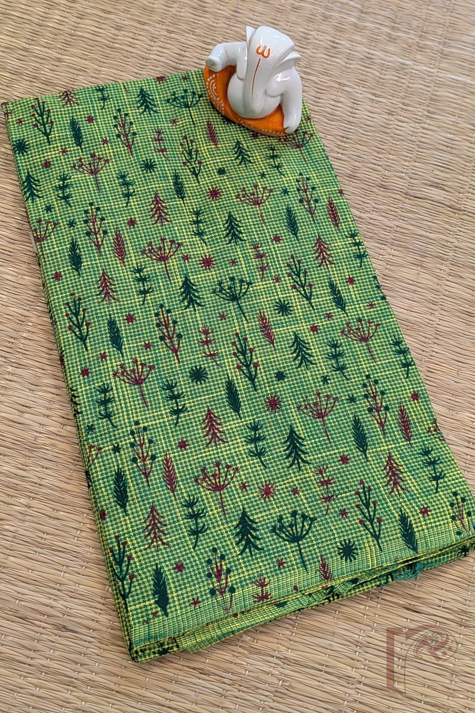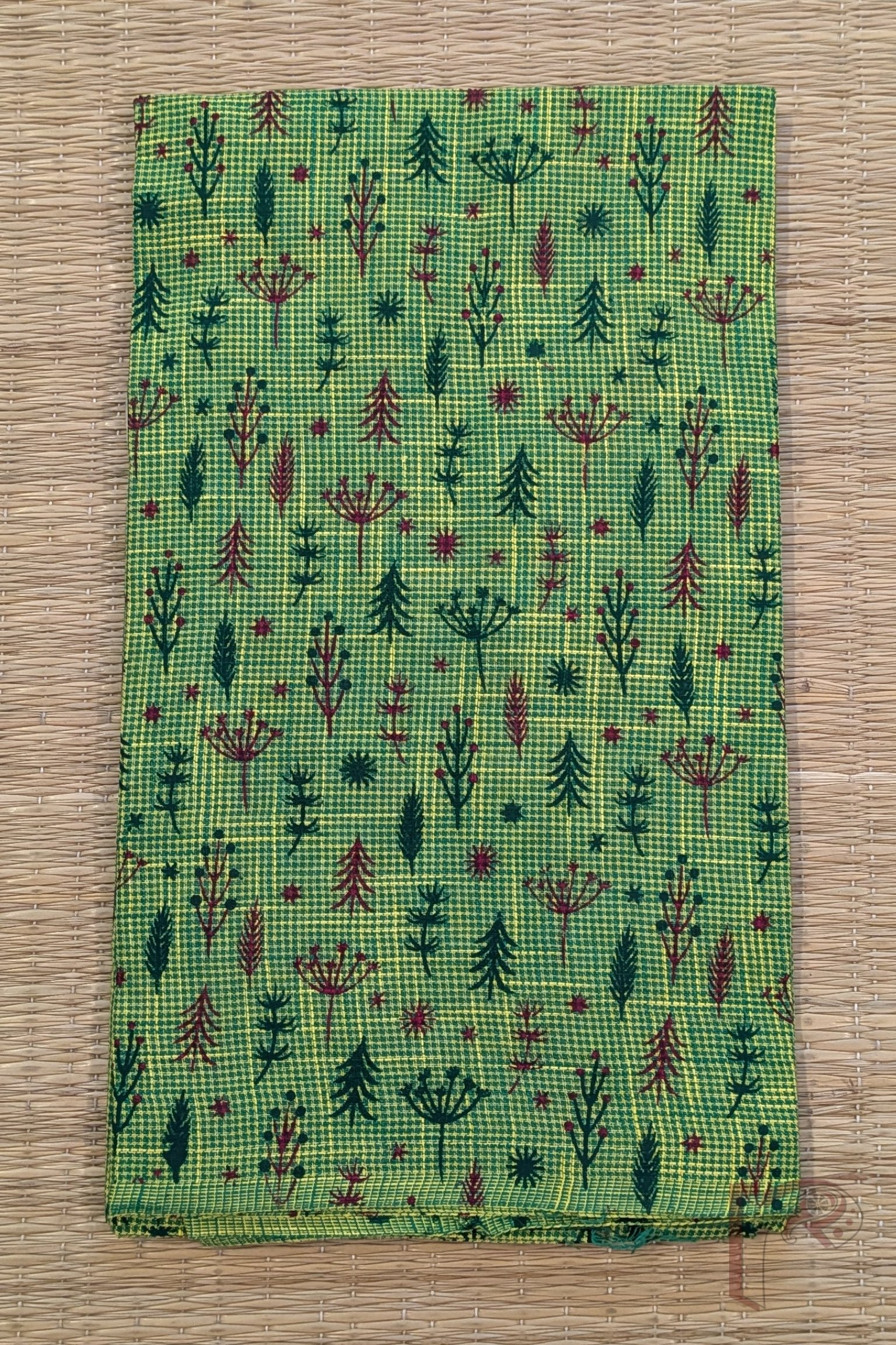 Vibrant yet earthy, this green and yellow shaded south cotton blouse piece showcases charming stalks and cotton pod motifs in maroon and dark green. The shaded blend gives the fabric dimension, while the botanical elements evoke rustic beauty. The handloom cotton ensures breathable softness and structured finish, making it a versatile blouse fabric for multiple saree pairings. A lively tribute to nature-inspired design.